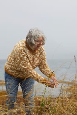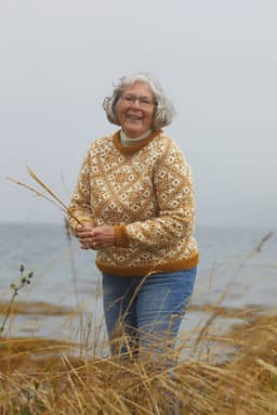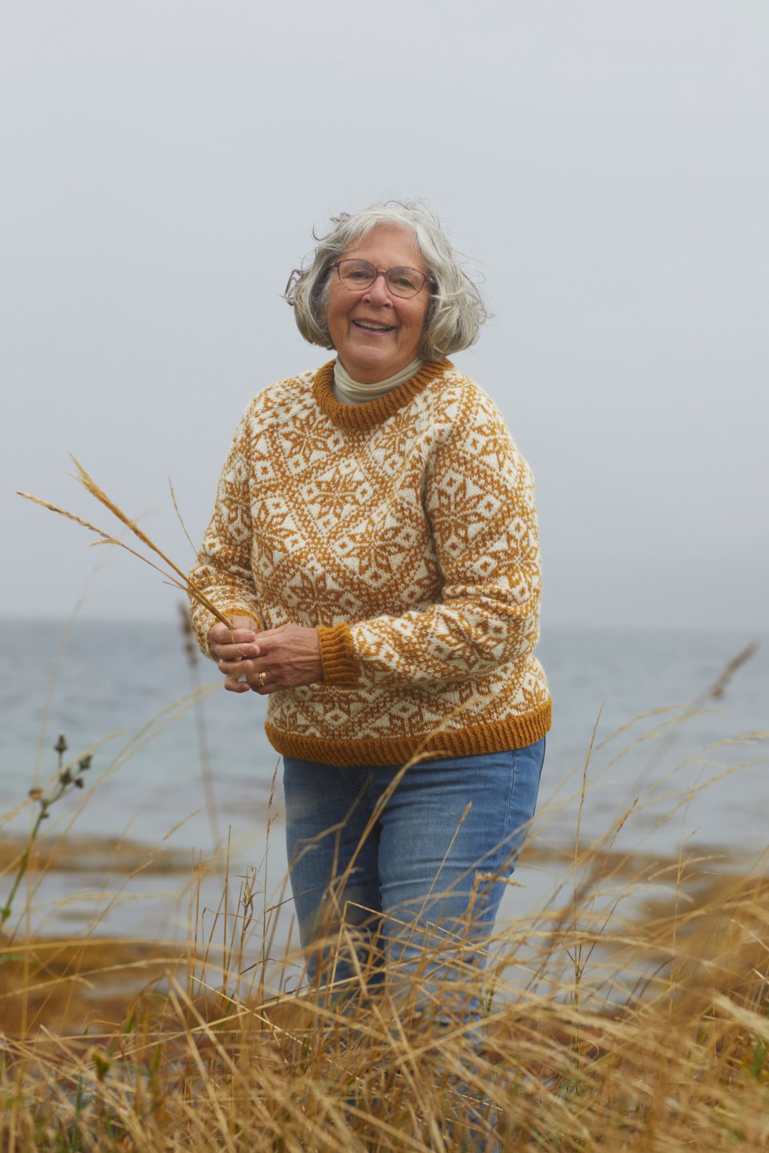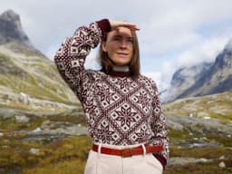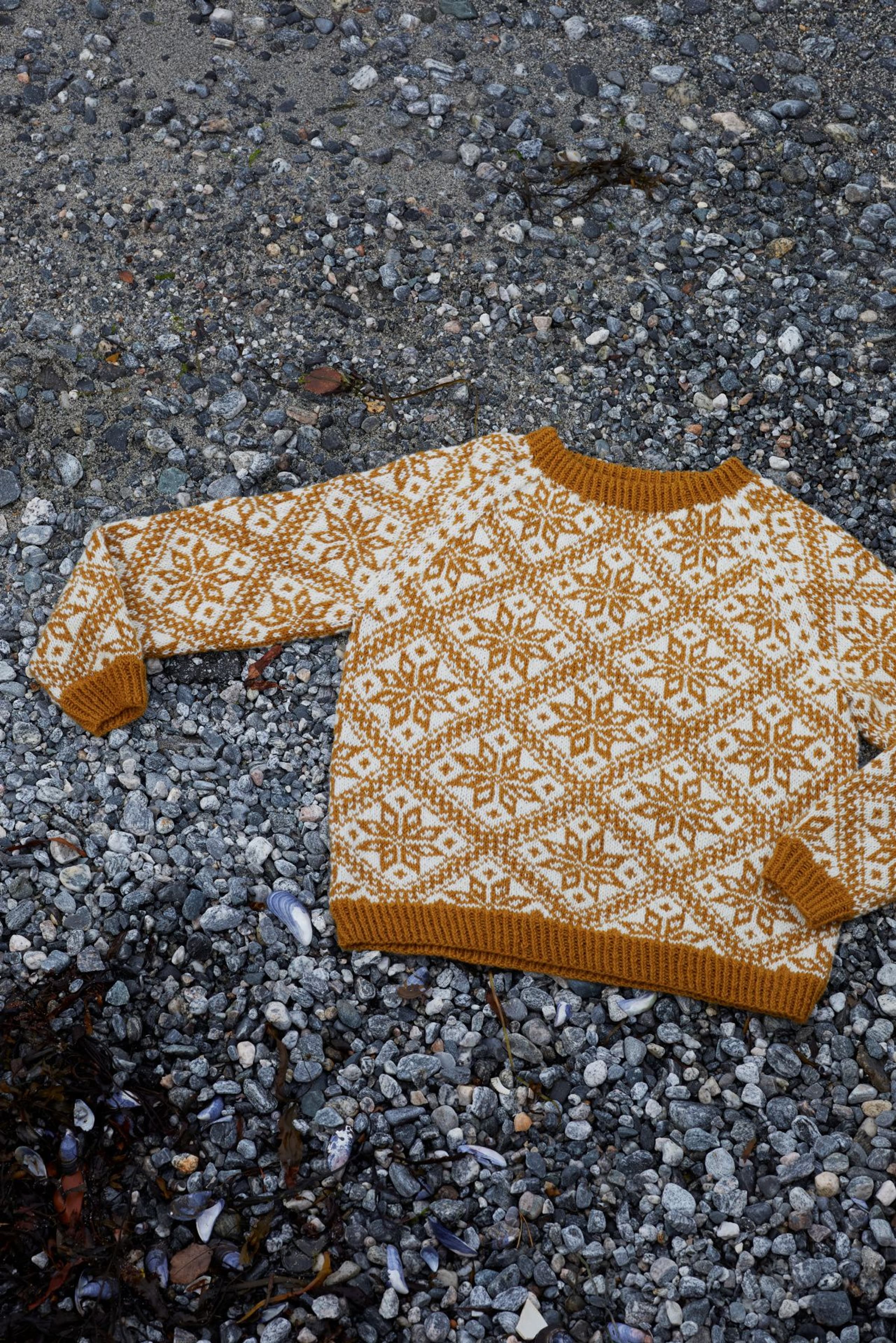 Storefjellgenseren er en helmønstret genser med raglanfelling. Den har en liten bord i raglanfellingen. Mønsteret er hentet fra arkivet på Rauma Ullvarefabrikk. På grunn av de store mønsterrapportene har vi gradert ved å variere strikkefastheten istedenfor masketallet, Sjekk din størrelse og vær nøye med å sjekke strikkefastheten din! Genseren strikkes rundt, nedenfra og opp. Vrangbordene strikkes med vridde rettmasker for et mer definert uttrykk.