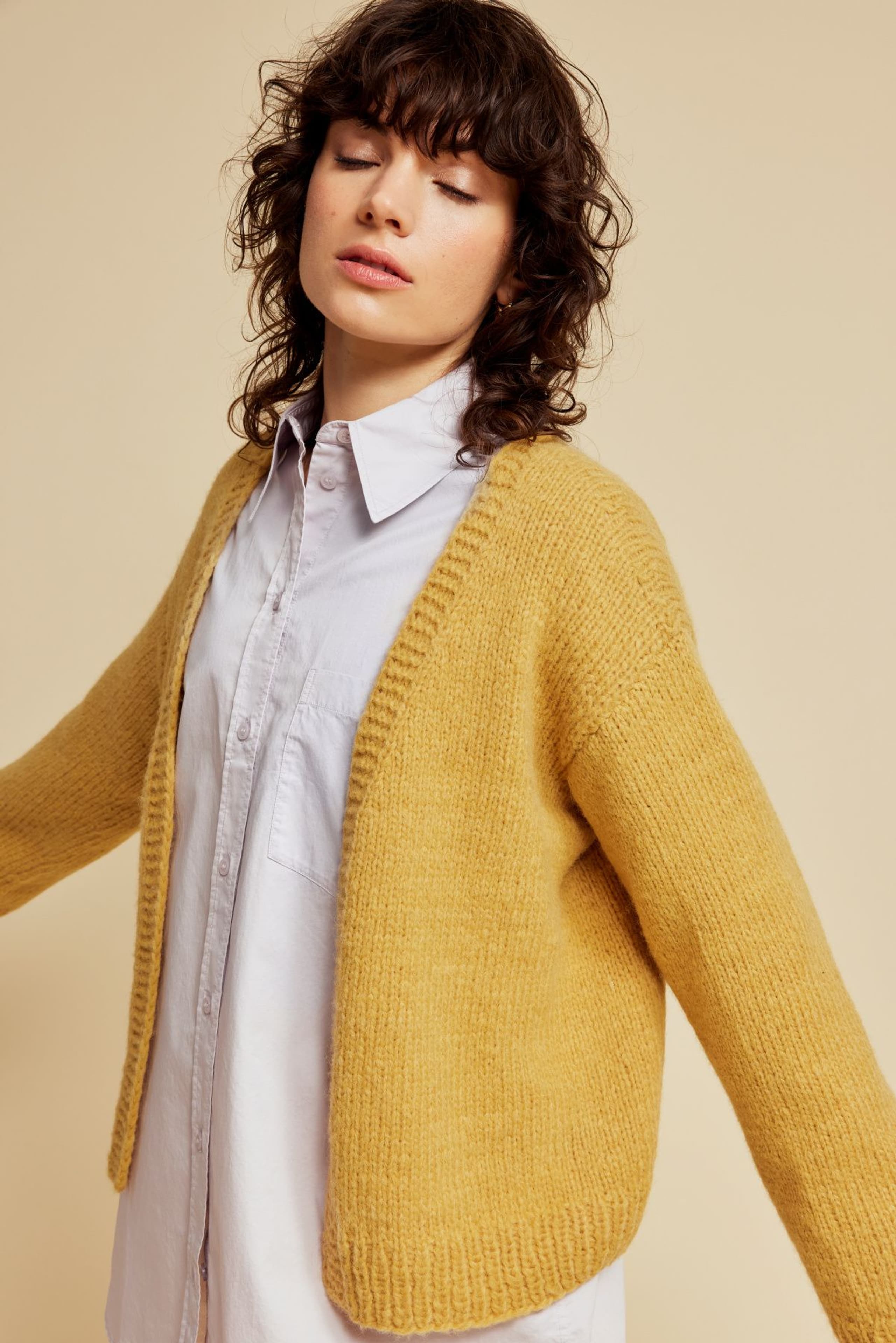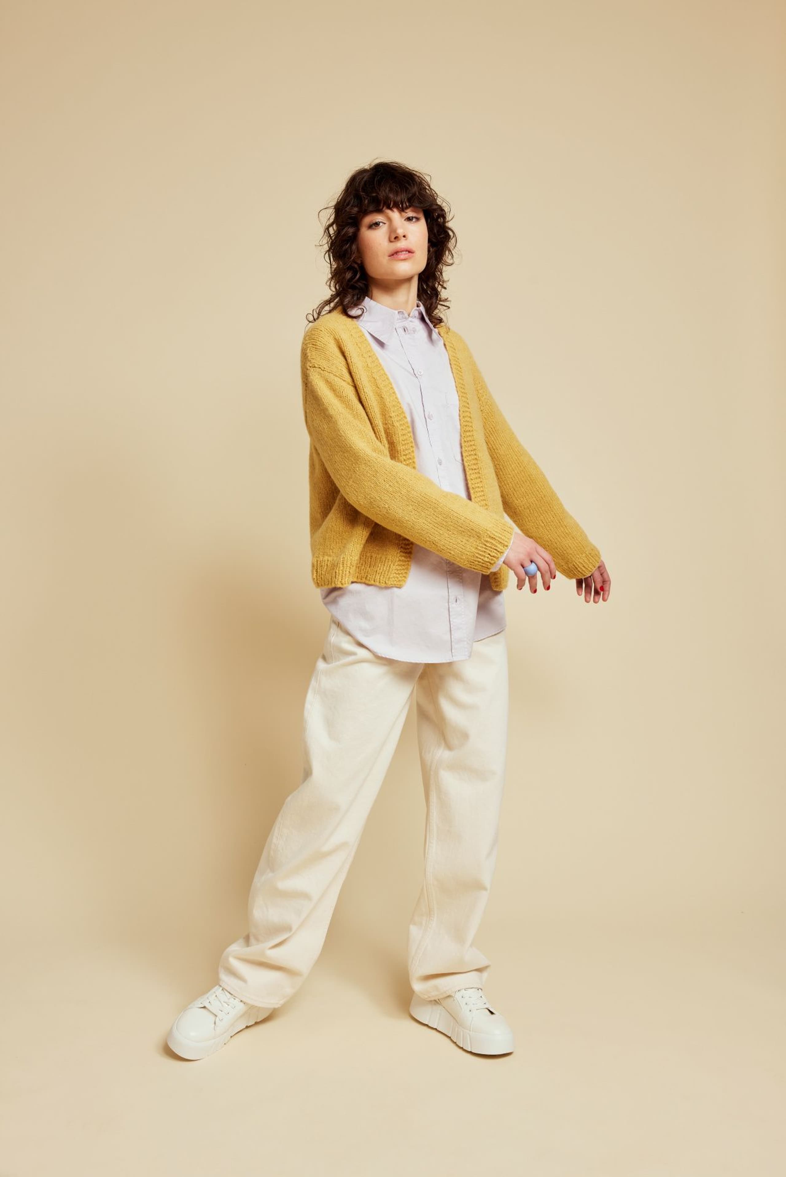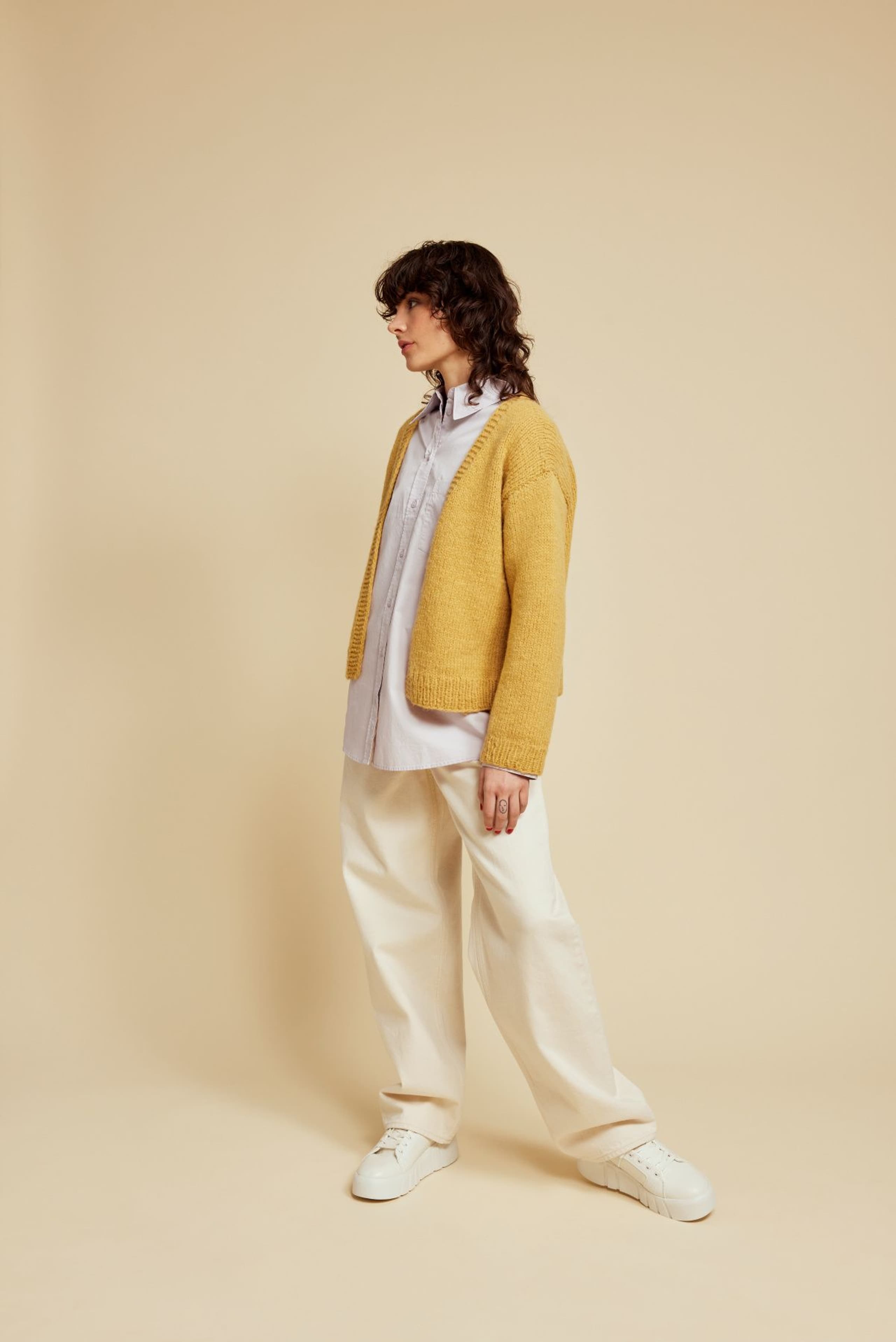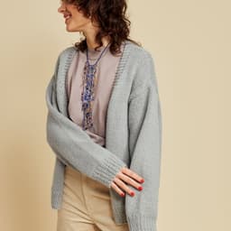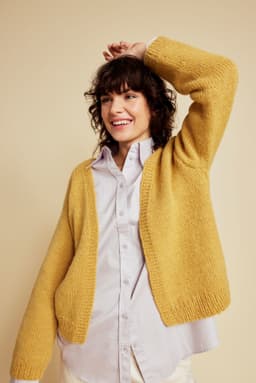Cardiganen er strikket frem og tilbake i glattstrikk nedenfra og opp, med v-hals og isydde ermer. Den har ribbekant nederst på bol og ermer og rillekant som strikkes samtidig oppover på hver side i åpningen foran og rundt halsen. Cardiganen har en tenkt bevegelsesvidde på ca 15 cm.