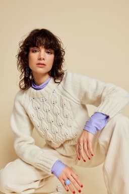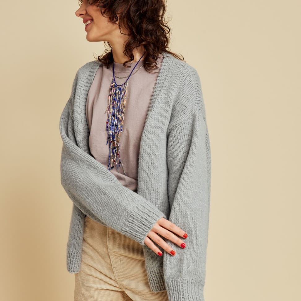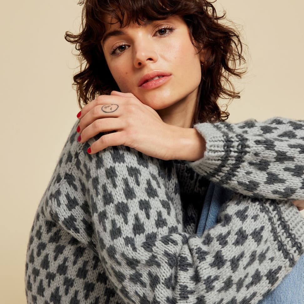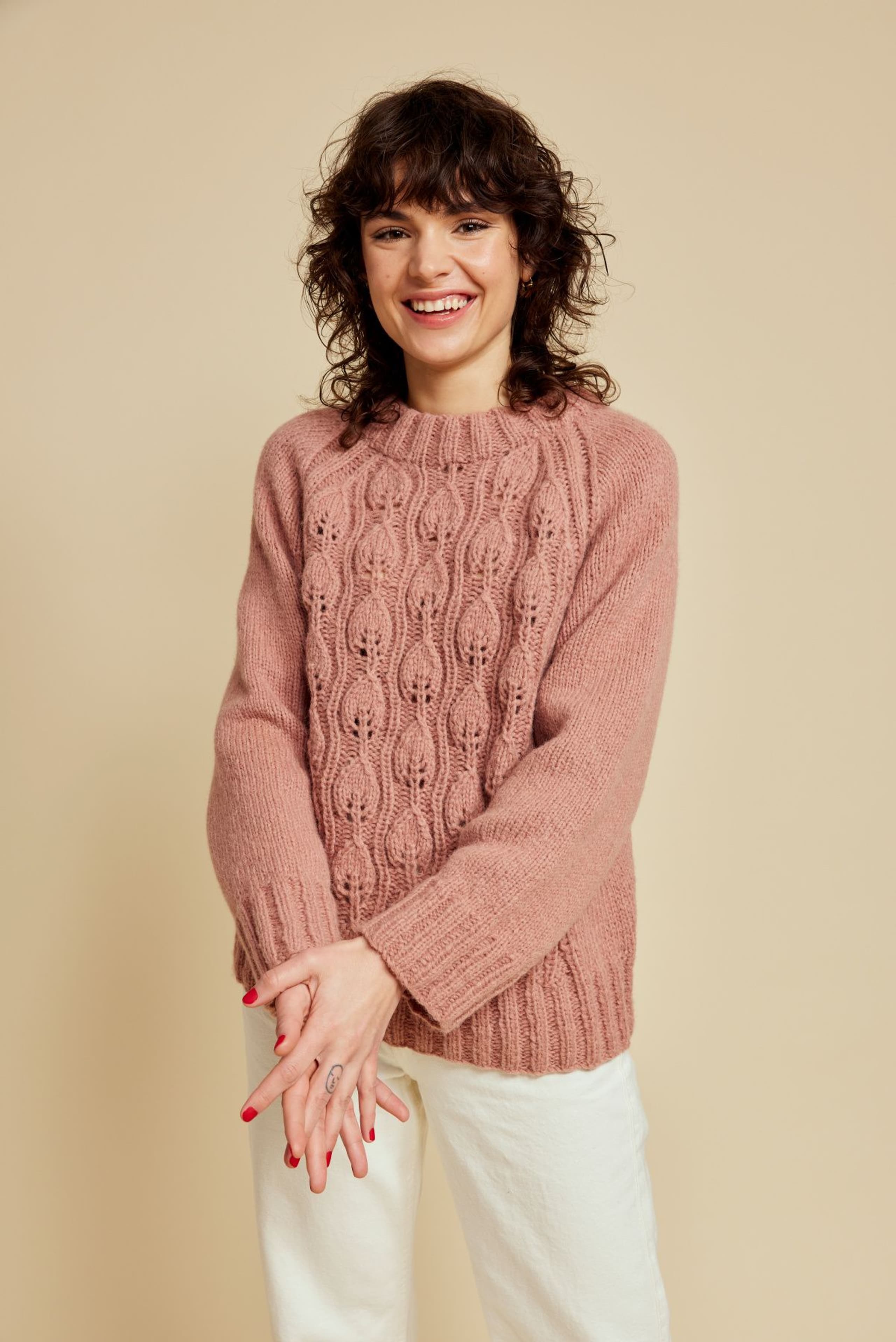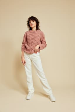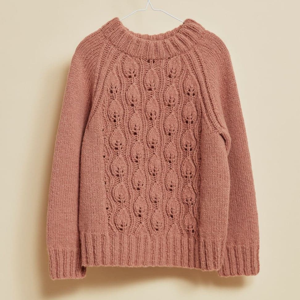 Genseren er strikket nedenfra og opp, med mønster midt foran. Den har glattstrikkede ermer med bred raglan, brede ribbekanter og dobbel hals. Genseren har en tenkt bevegelsesvidde på 8 cm.