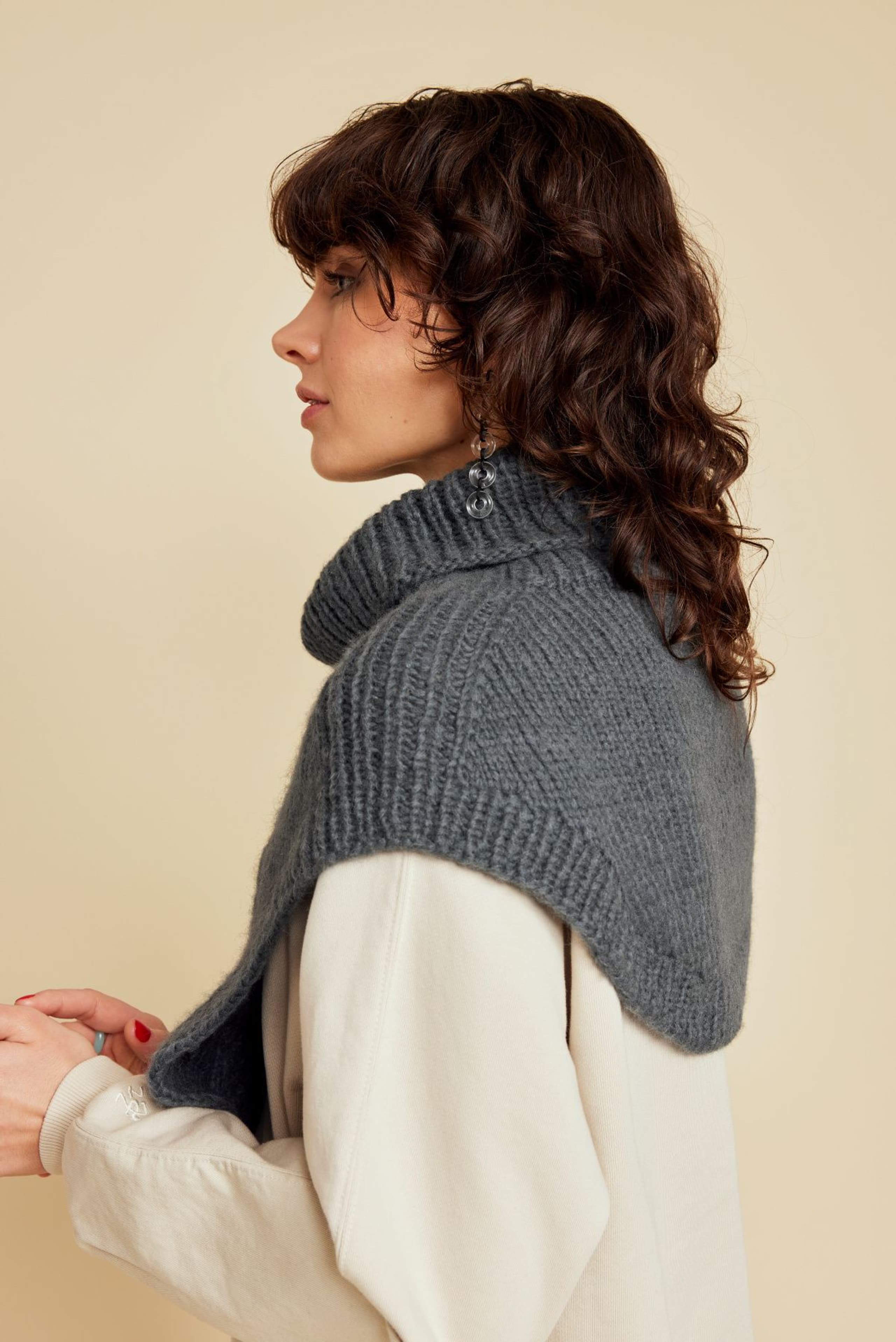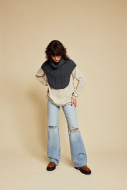 Halsen er strikket ovenfra og ned, og lengden kan tilpasses slik du ønsker. Halsen har fletter foran og glattstrikk i ryggen. Den har høy hals som brettes dobbel. Den har ribbekanter rundt hele kanten, både foran og bak.