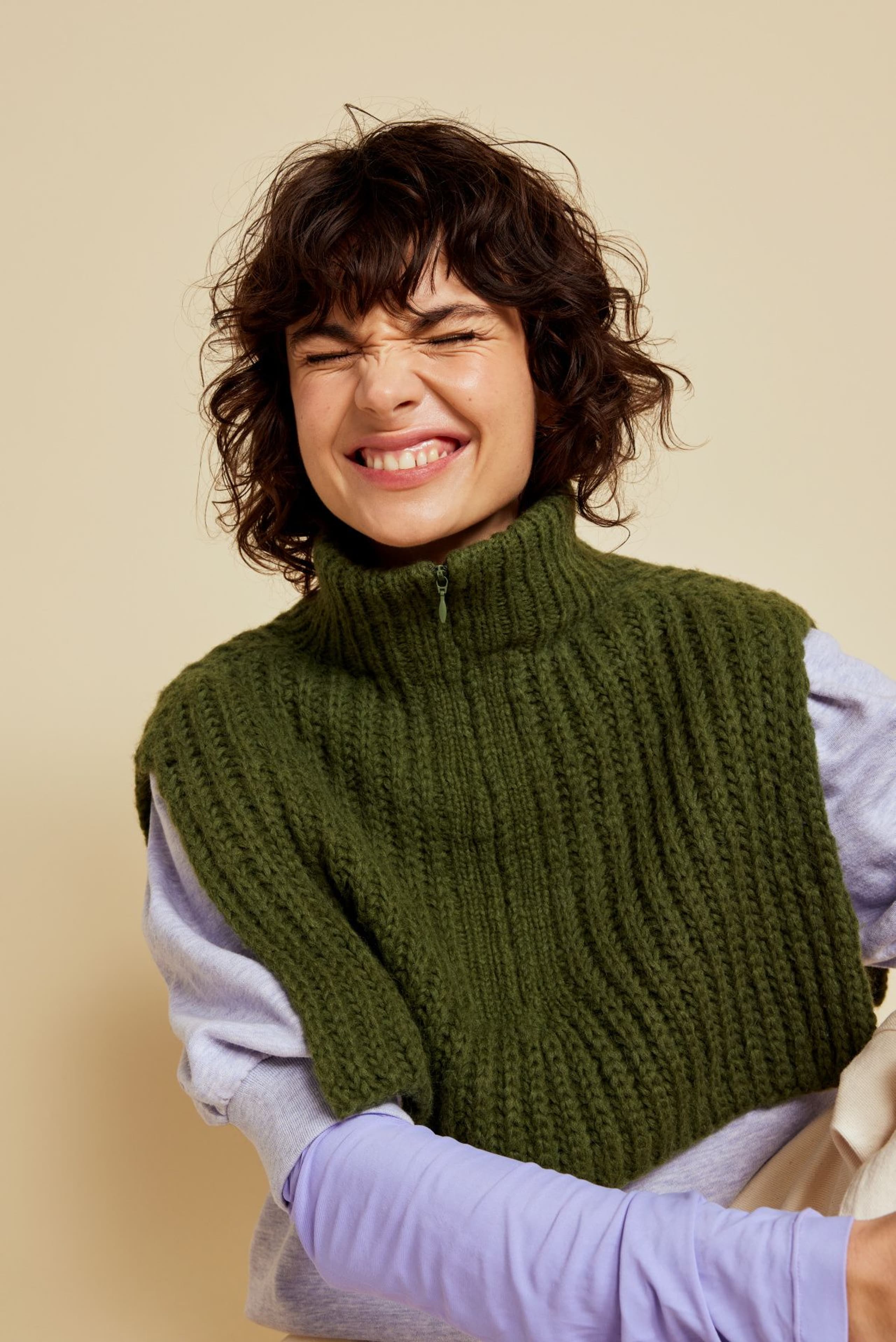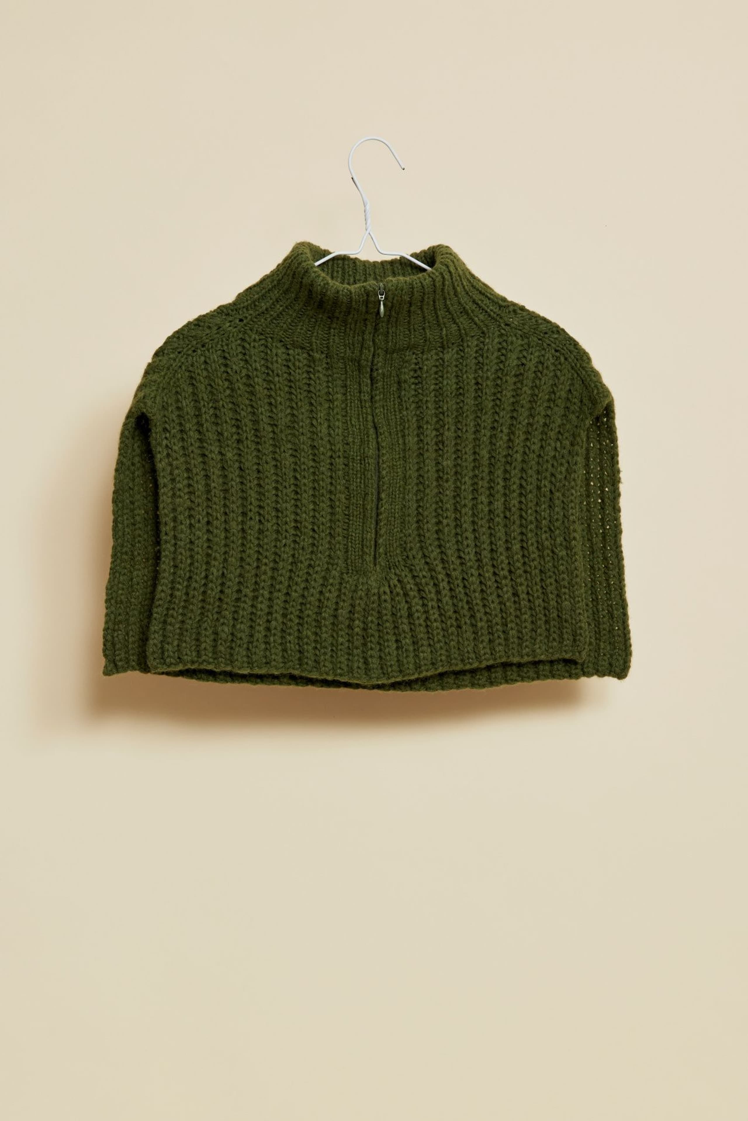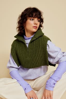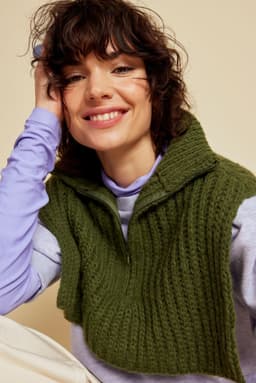 Halsen er strikket ovenfra og ned, og lengden kan tilpasses slik du ønsker. Den har åpning foran, som kan lukkes med en glidelås. Det økes ut på skuldrene og over bærestykket etter ribbehalsen er strikket. Det strikkes patentmønster etter ribbehalsen. Foran på hver side strikkes det en stolpekant som glidelåsen skal monteres i. Glidelåsen sys i fra nede og opp til halskanten øverst. Ribbehalsen brettes dobbel over glidelåsen.