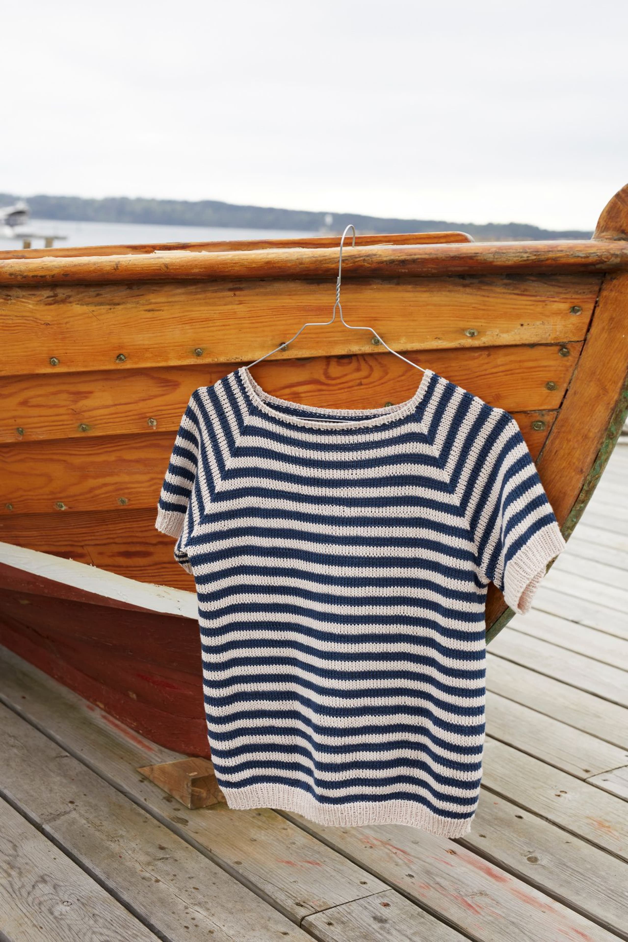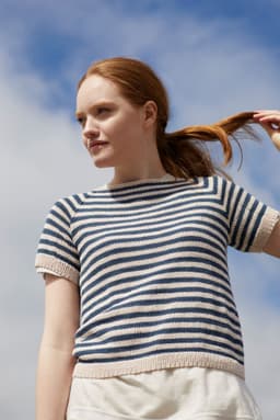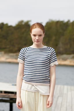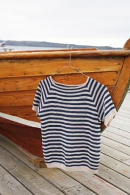 Bris tee er en kortermet, kroppsnær topp med striper. Toppen strikkes nedenfra og opp, med raglanfellinger. Kantene strikkes i ribbestrikk. For å få en kroppsnær fasong, strikk en størrelse som er like stor eller ned til 4 cm mindre, enn brystvidden din.