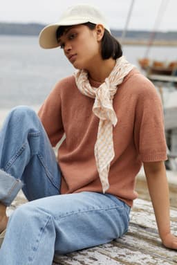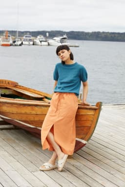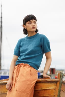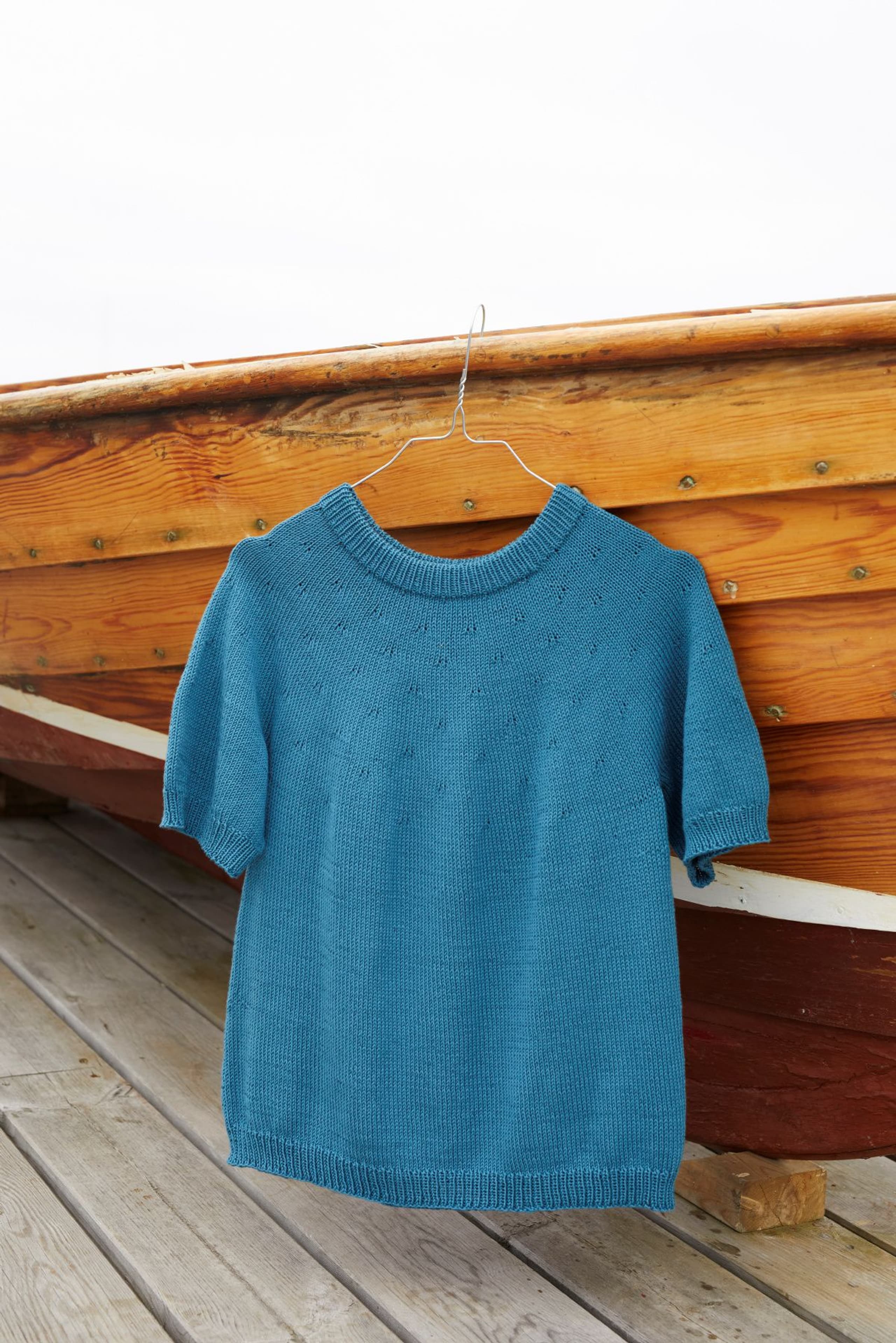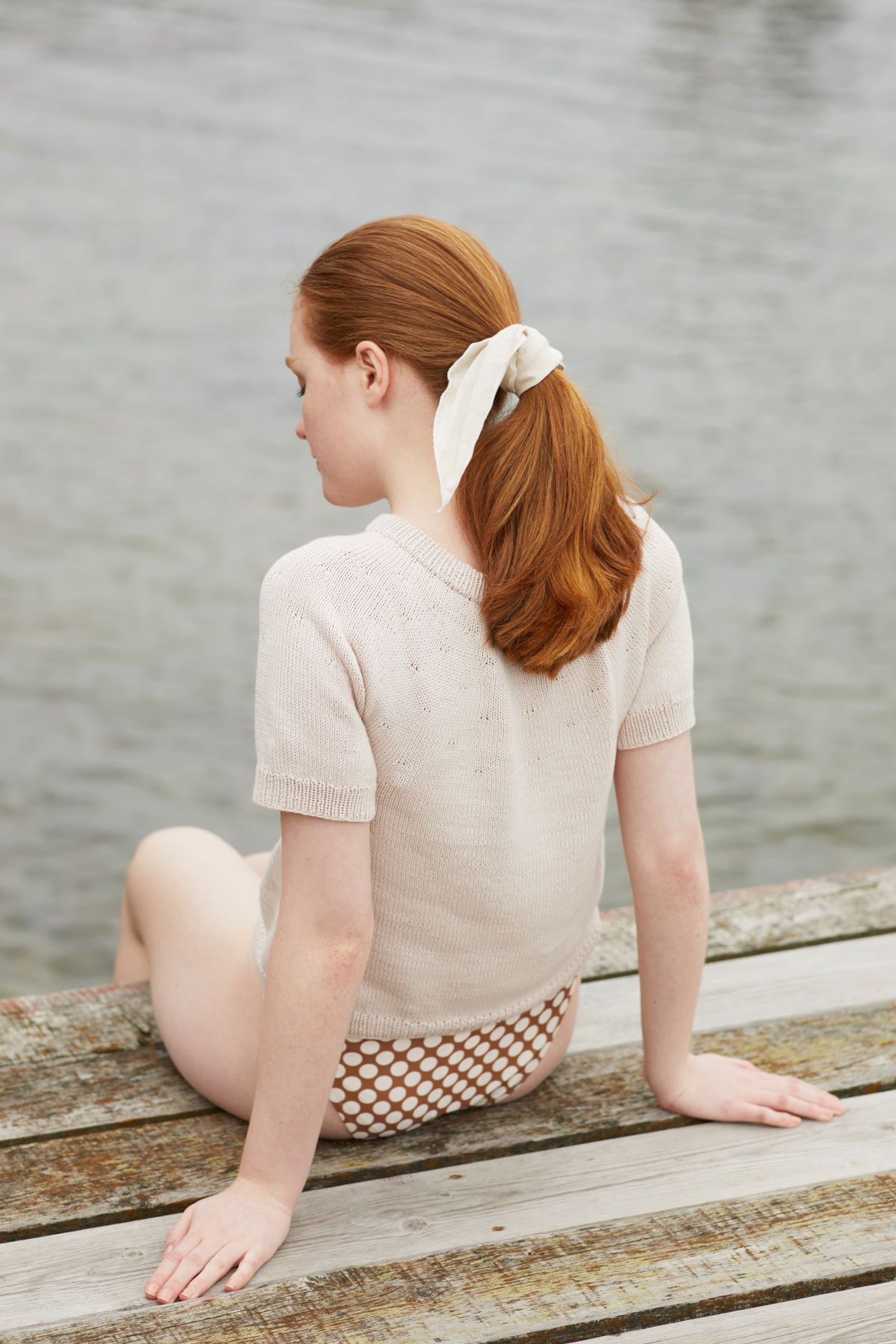 Skimre tee er en kortermet topp med rundt bærestykke og ribbestrikkede kanter. Toppen strikkes i glattstrikk ovenfra og ned. Halskanten brettes dobbel innover. For å få en avslappet fasong, strikk en størrelse som er 4-8 cm større enn brystvidden din.