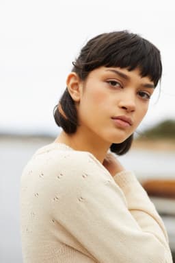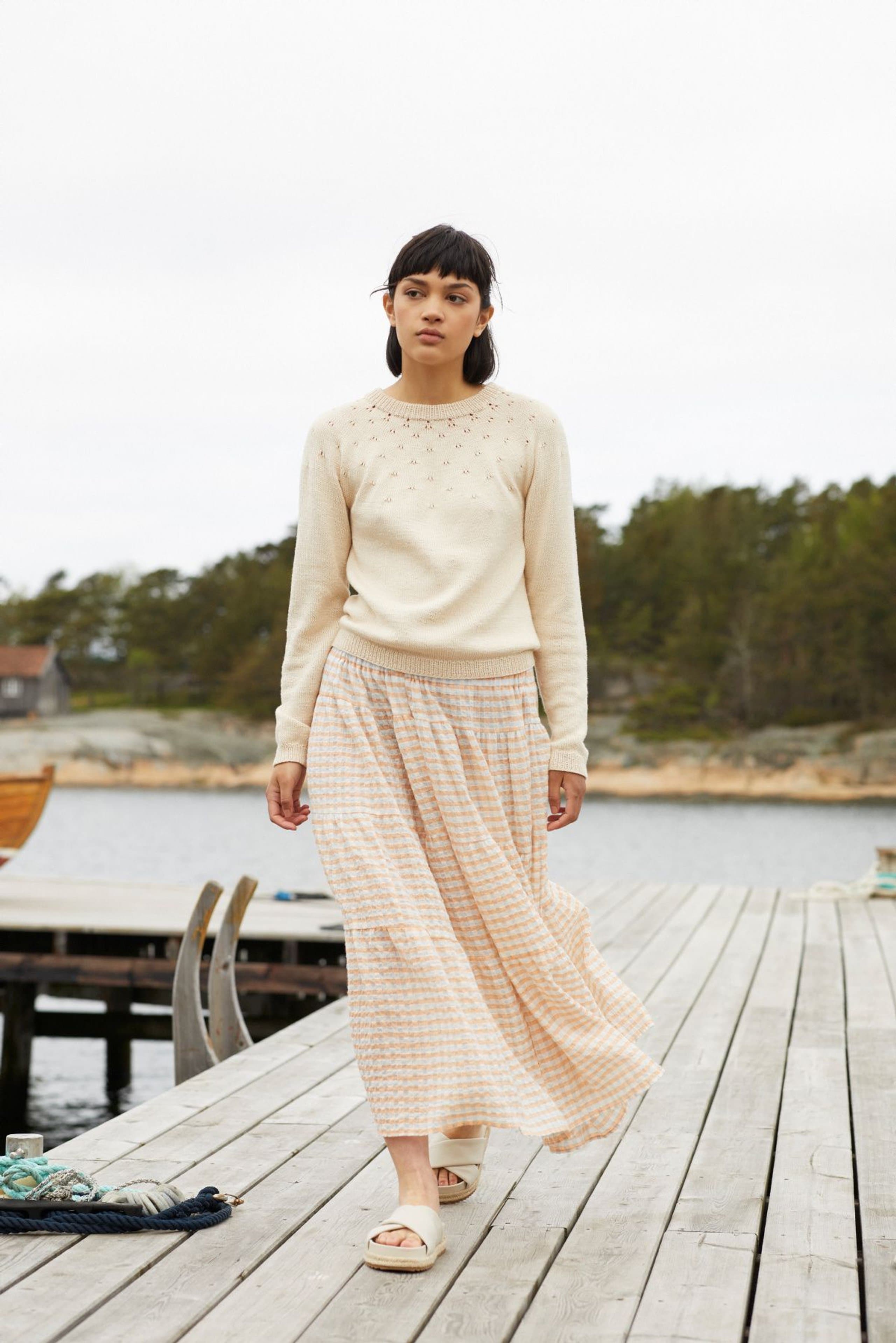 Flimregenser er en søt langermet genser med hullmønstret rundt bærestykke. Modellen har en avslappet rett fasong med ribbestrikkede kanter. Den strikkes ovenfra og ned. For å få en avslappet fasong, strikk en størrelse som er 4-8 cm større enn brystvidden din.