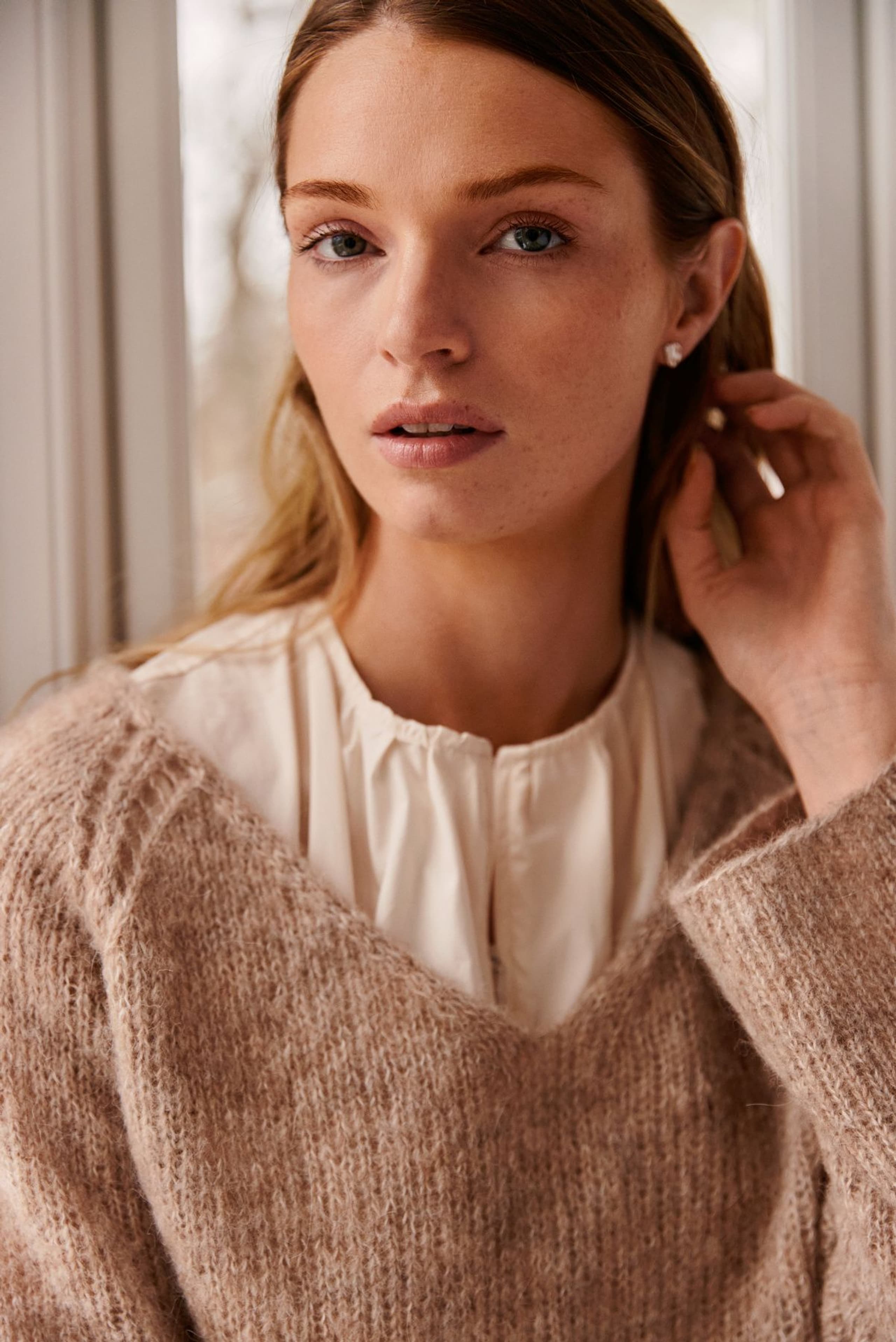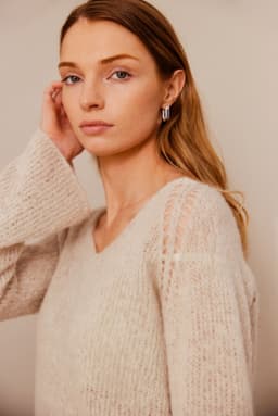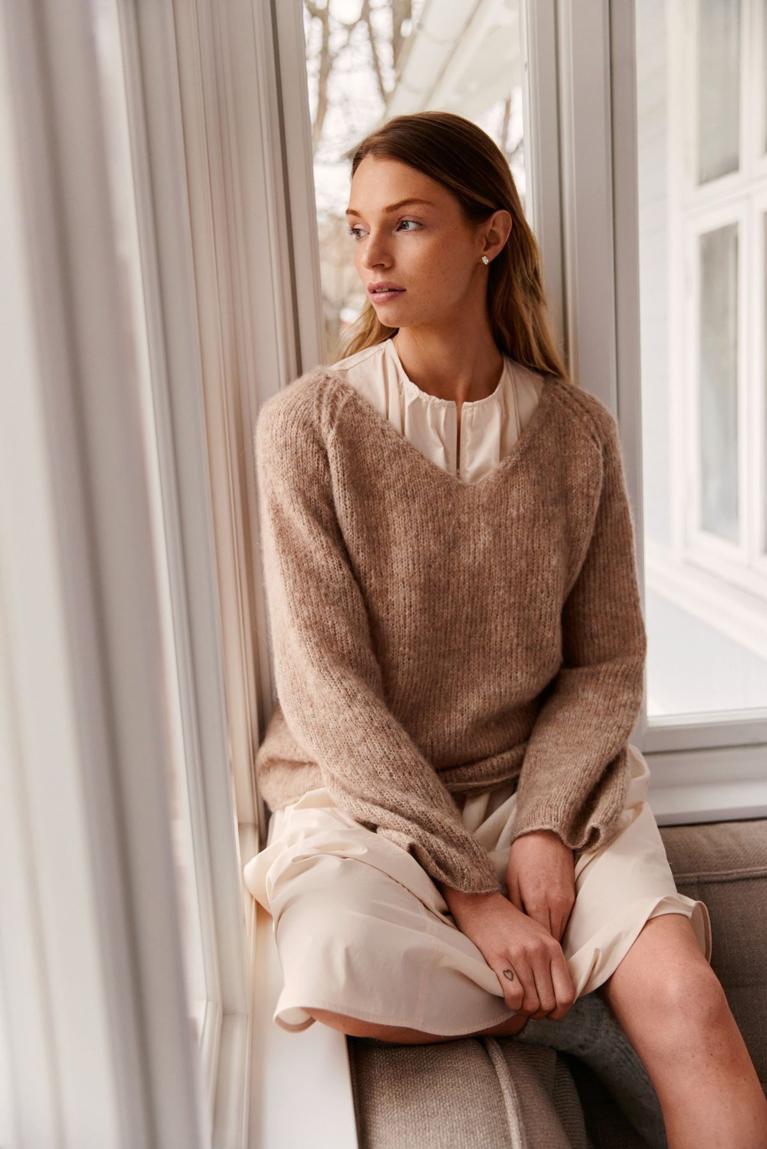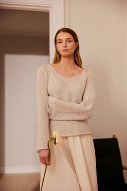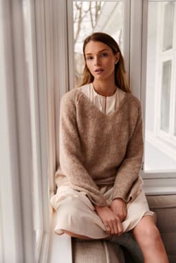Marianne genser er en glattstrikket enkel genser med v-hals. Den har raglan med en dekorativ hullbord. Genseren har en anelse a-fasong og strikkes nedenfra og opp. For å få en ledig fasong, velg en størrelse som har en brystvidde som er 8-12 cm større enn din egen.