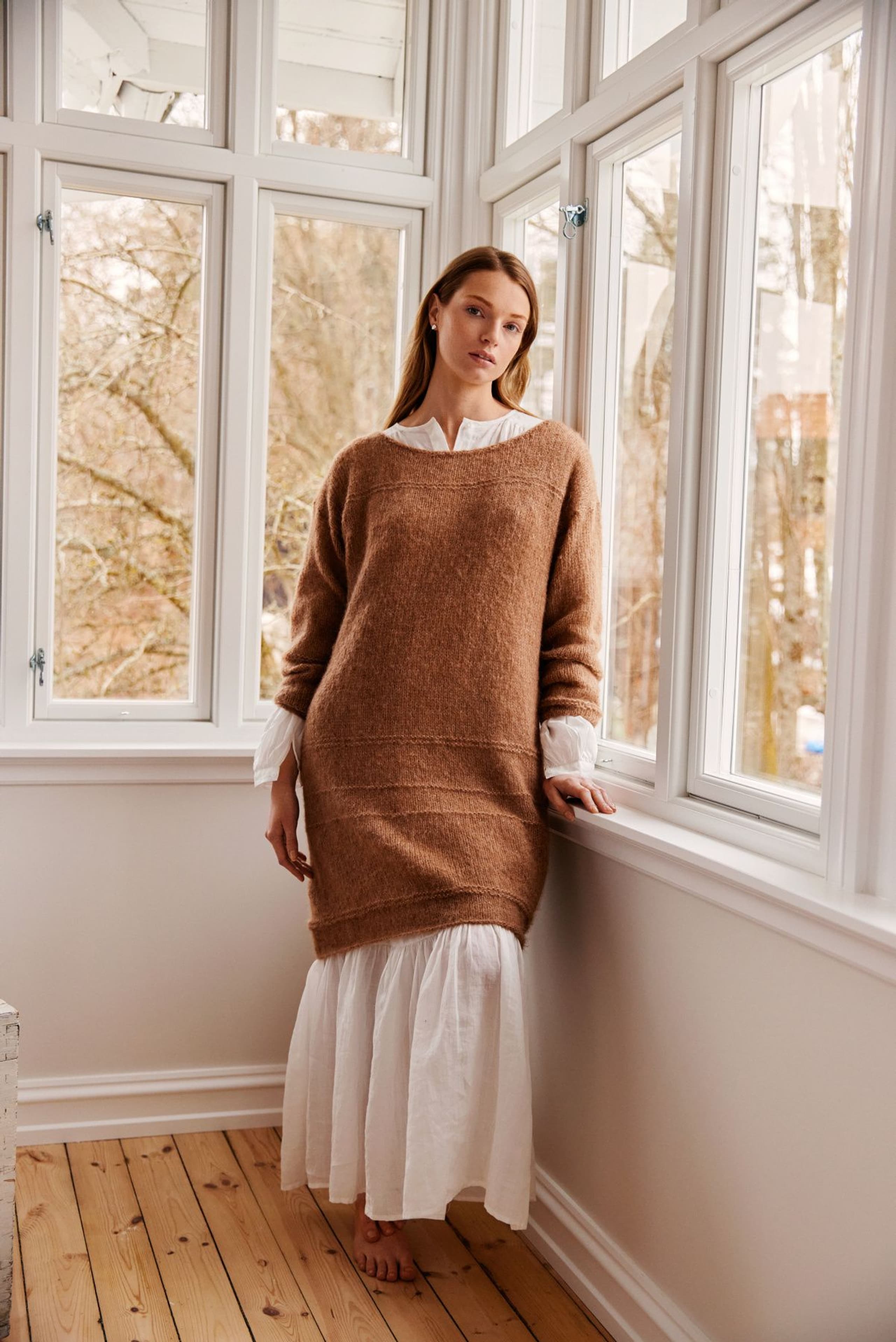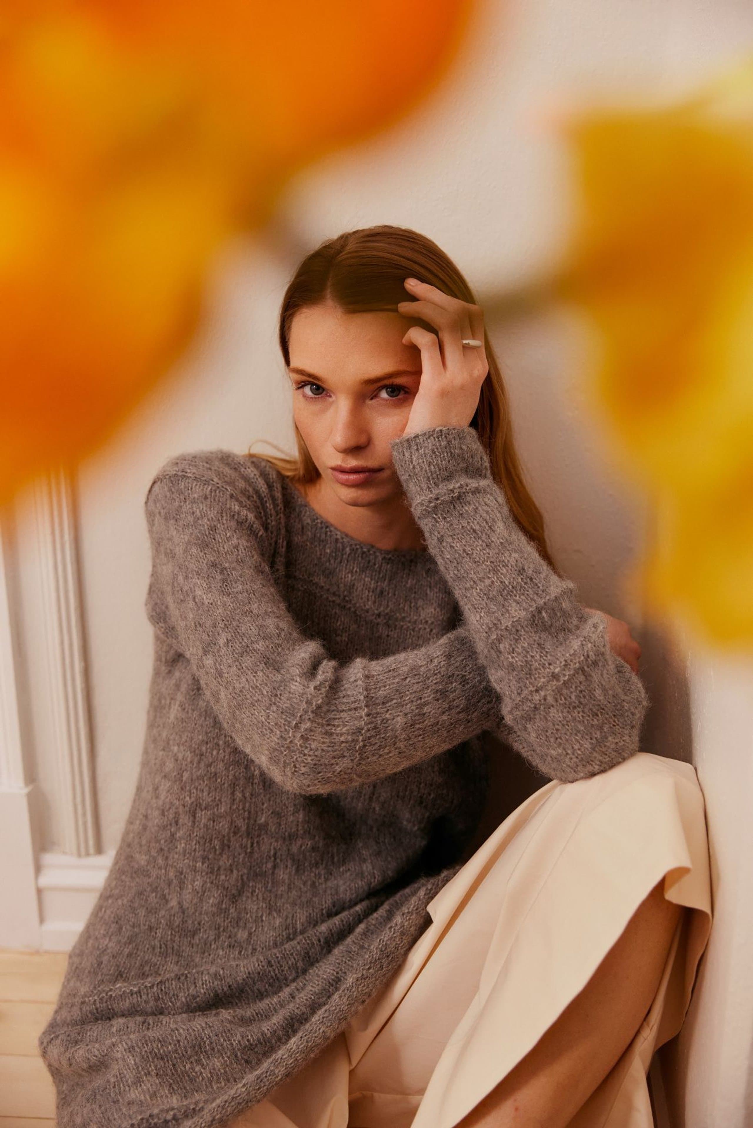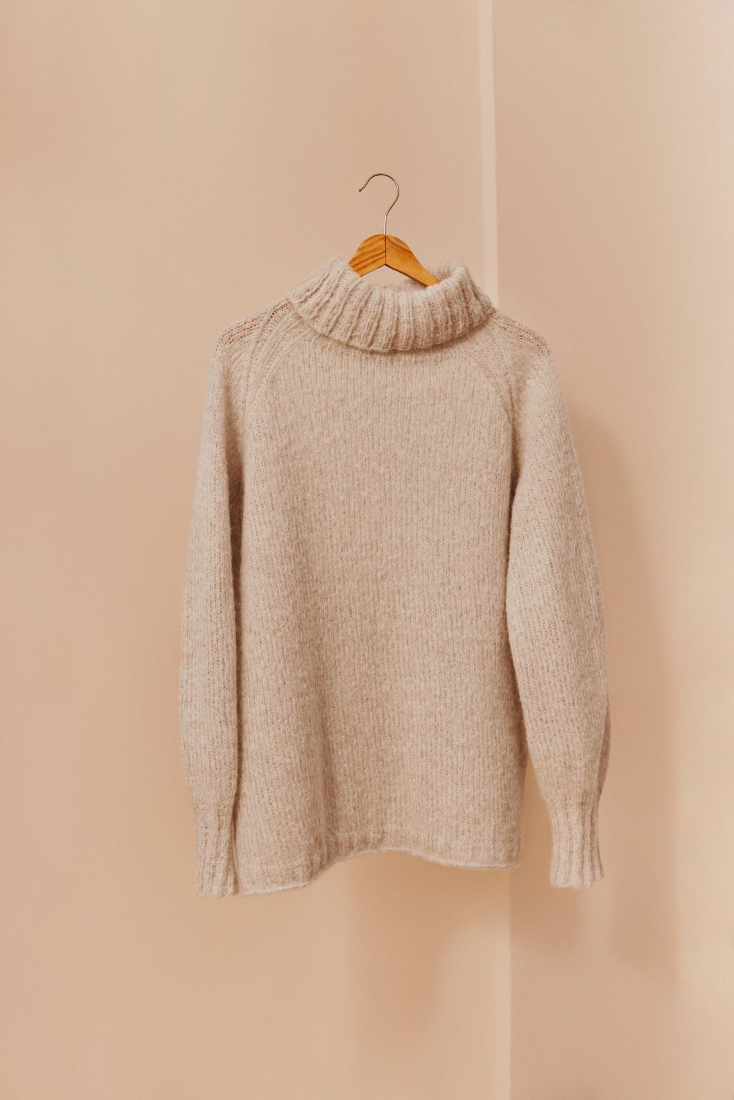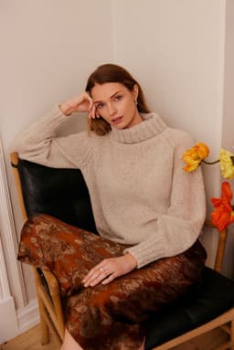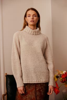 Anne genser er en glattstrikket genser med høy hals og bred ribbestrikket raglan. Genseren har kort vrangbord med rullekant på bolen og lang vrangbord på ermene. Den har en ledig fasong og den strikkes nedenfra og opp. For å få en ledig fasong, velg en størrelse som har en brystvidde som er ca 8-12 cm større enn din egen.