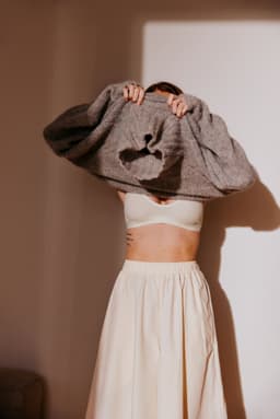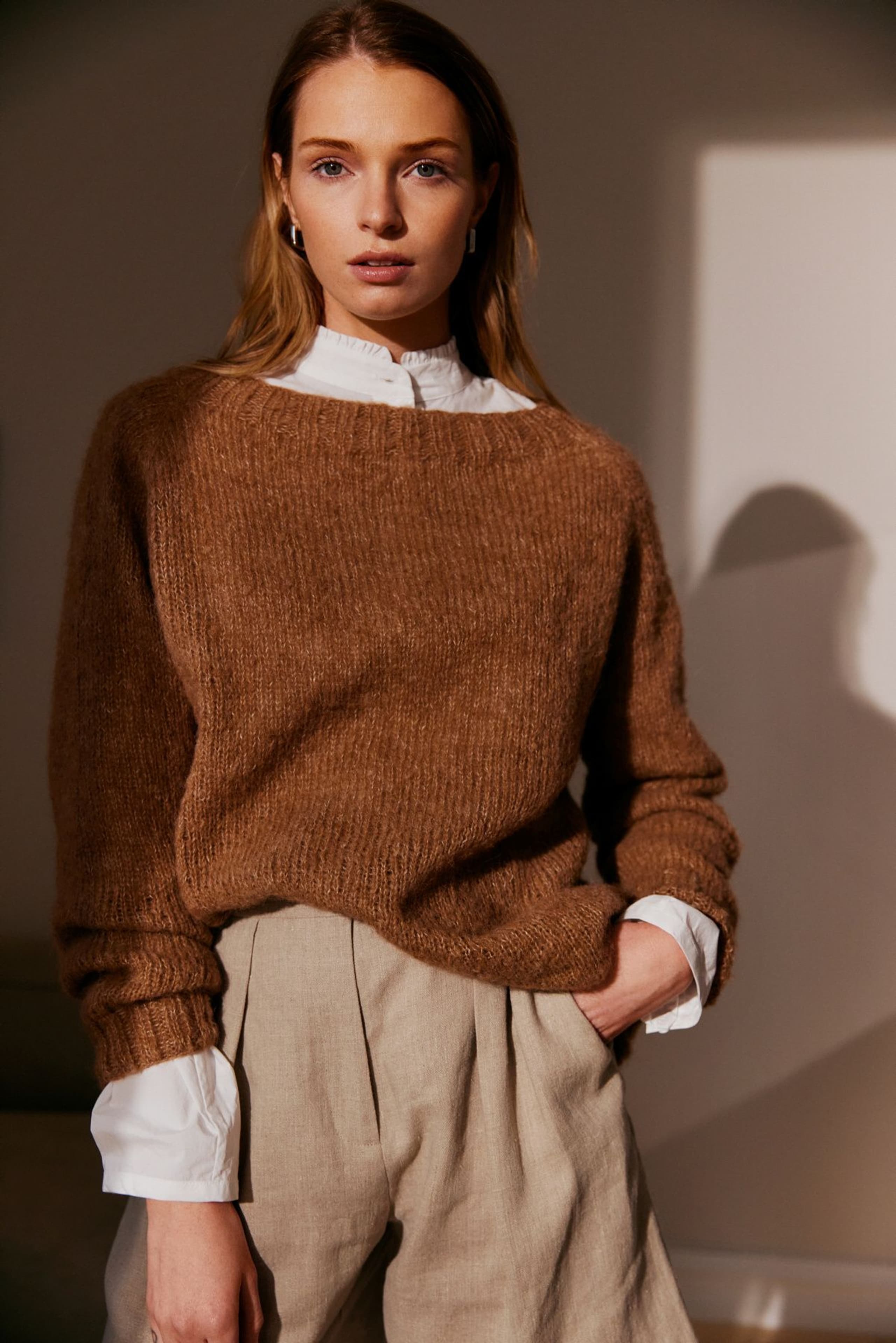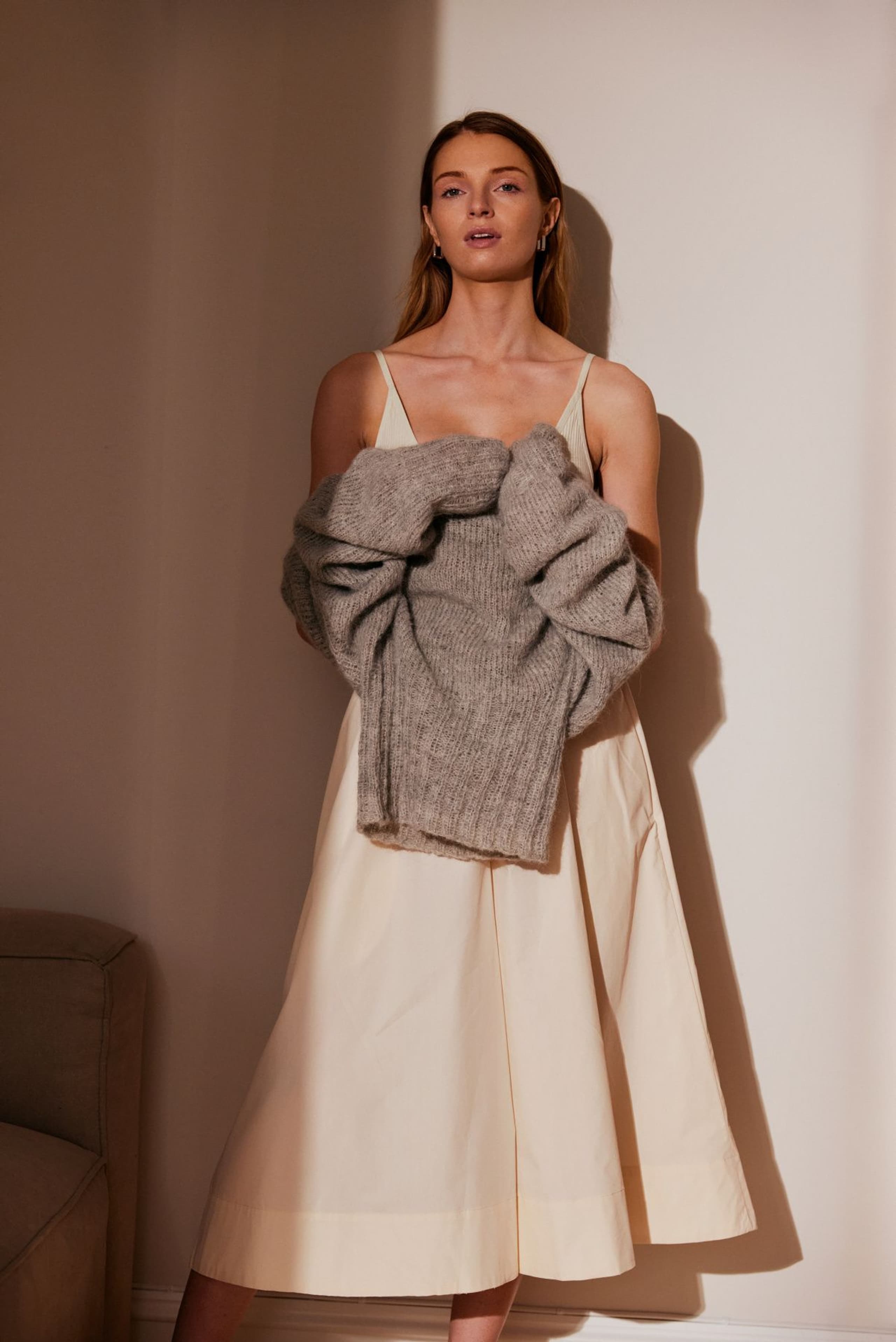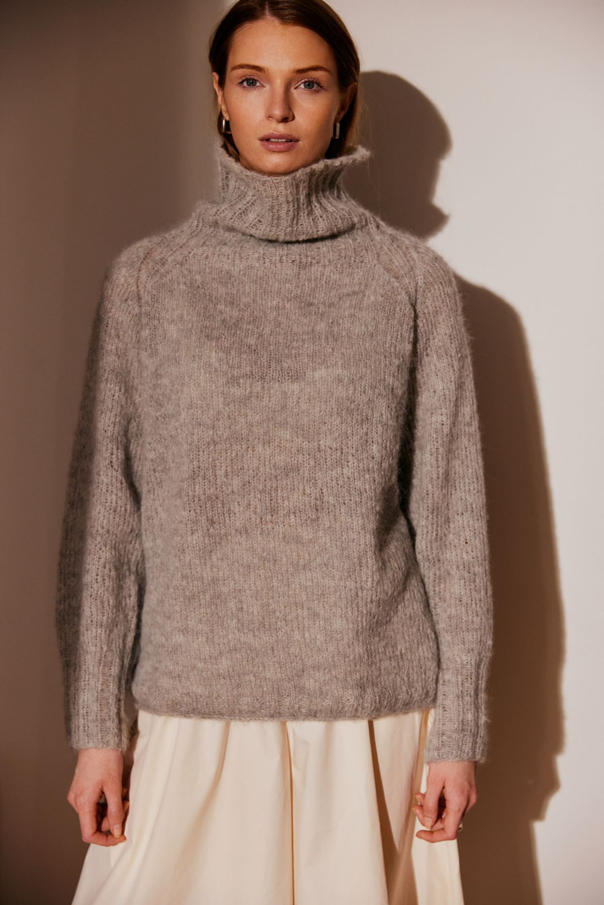 Anne genser er en glattstrikket genser med høy hals og bred ribbestrikket raglan. Genseren har kort vrangbord med rullekant på bolen og lang vrangbord på ermene. Den har en ledig fasong og den strikkes nedenfra og opp. For å få en ledig fasong, velg en størrelse som har en brystvidde som er ca 8-12 cm større enn din egen.