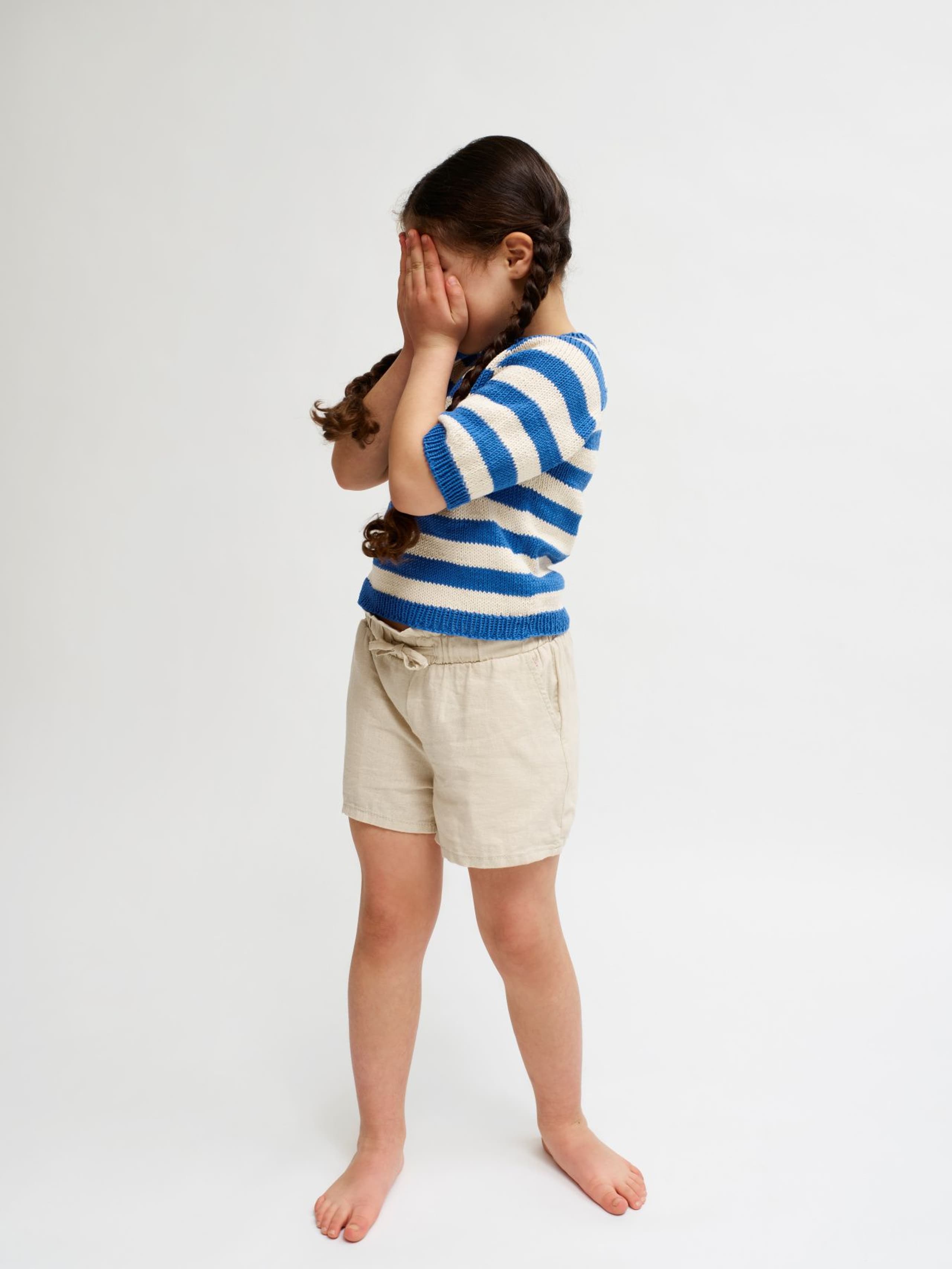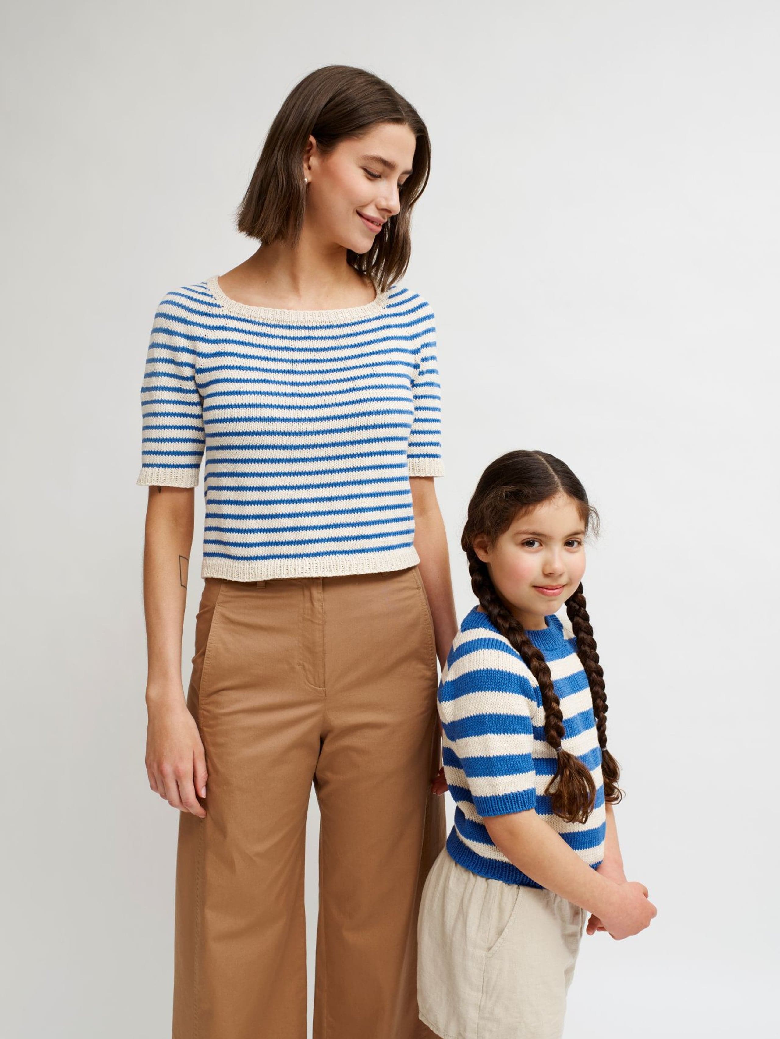 Skjærgårdsgenseren er en romslig raglangenser med striper og ½-lange ermer. Genseren strikkes ovenfra og ned i glattstrikk og med ribbestrikkede kanter. For å få en romslig fasong, velg en størrelse som har en brystvidde som er 8-16 cm større enn barnets kropp.