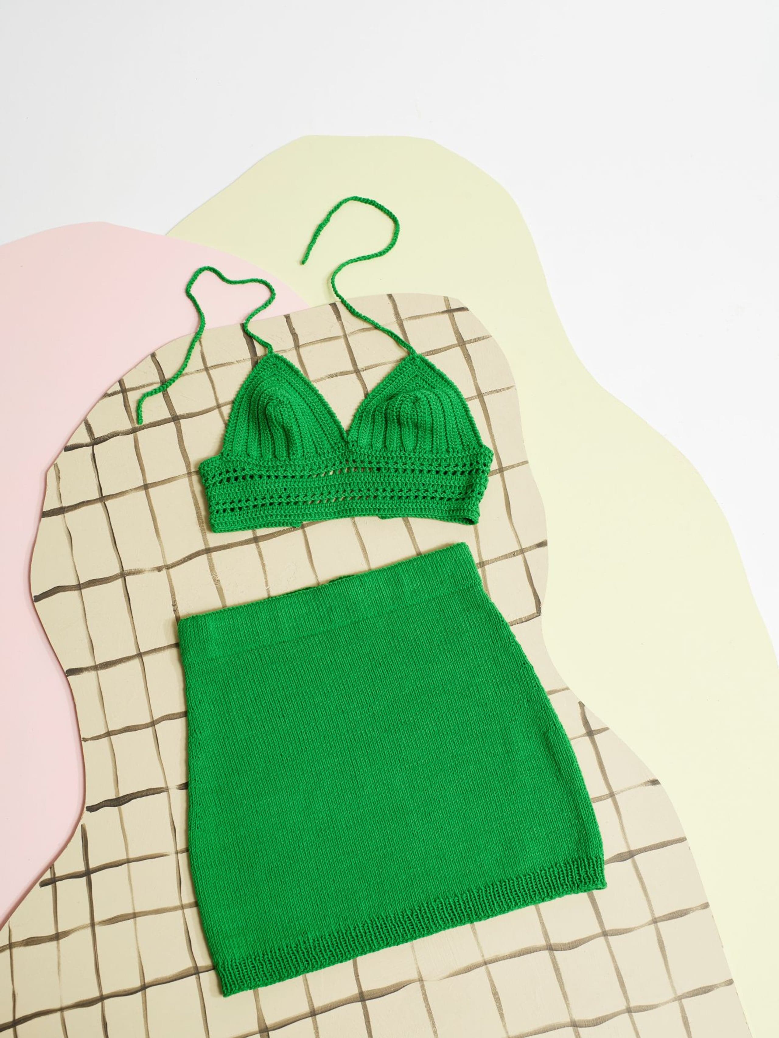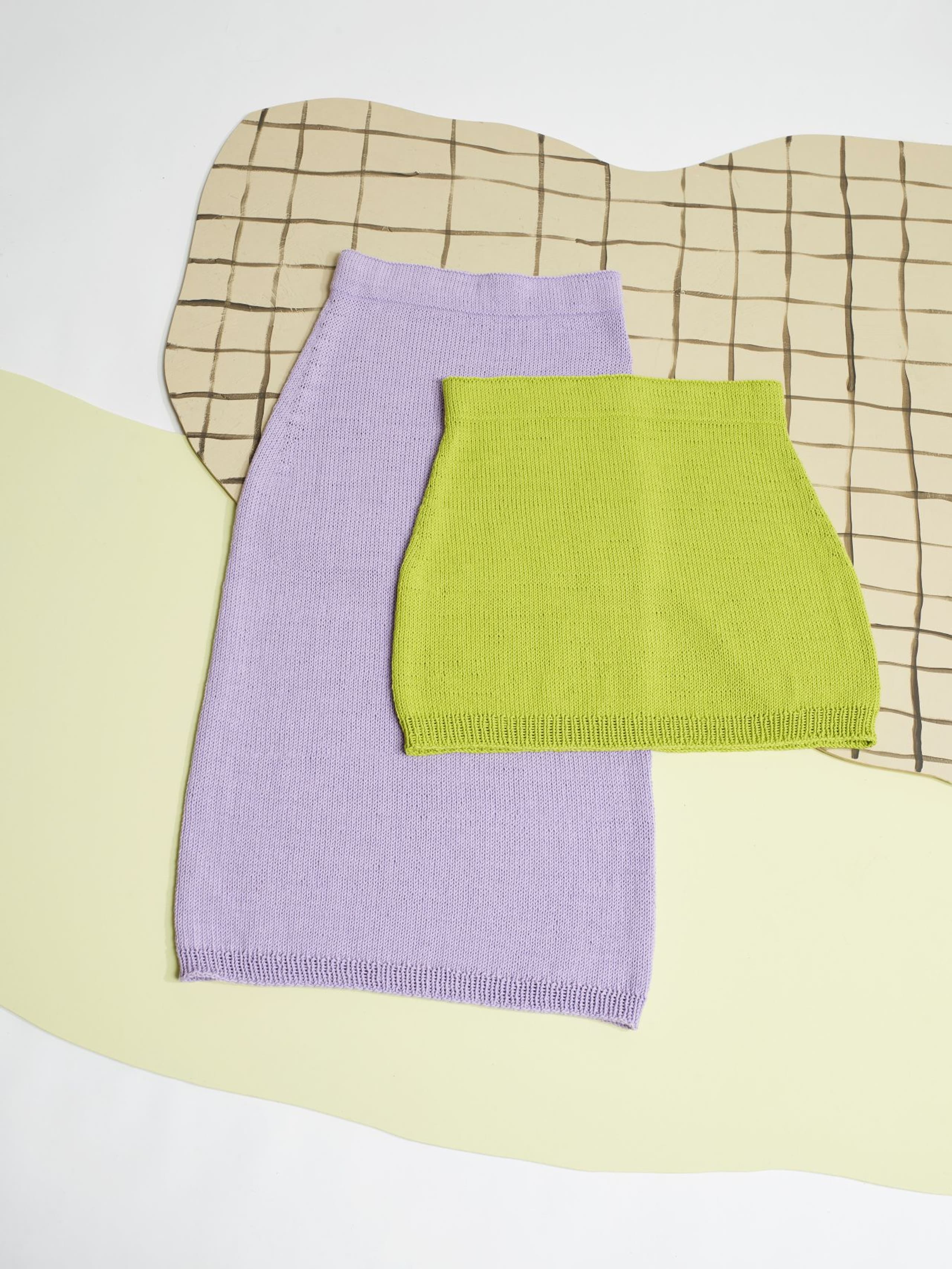 Svale sommerskjørt er et glattstrikket skjørt med høyt liv og brettekant i linningen. Skjørtet har en kroppsnær, rett fasong, med økninger i hver side over hoftene og ribbekant nederst. Livet tilpasses med en bred strikk som tres i til slutt. Skjørtet strikkes ovenfra og ned, så lengden kan enkelt justeres underveis i arbeidet. I oppskriften beskrives to lengder; et kort miniskjørt og et langt skjørt som rekker til midt på leggen. For å få en kroppsnær fasong, velg en størrelse som har en stussvidde som er 2-8 cm større enn din egen stussvidde.