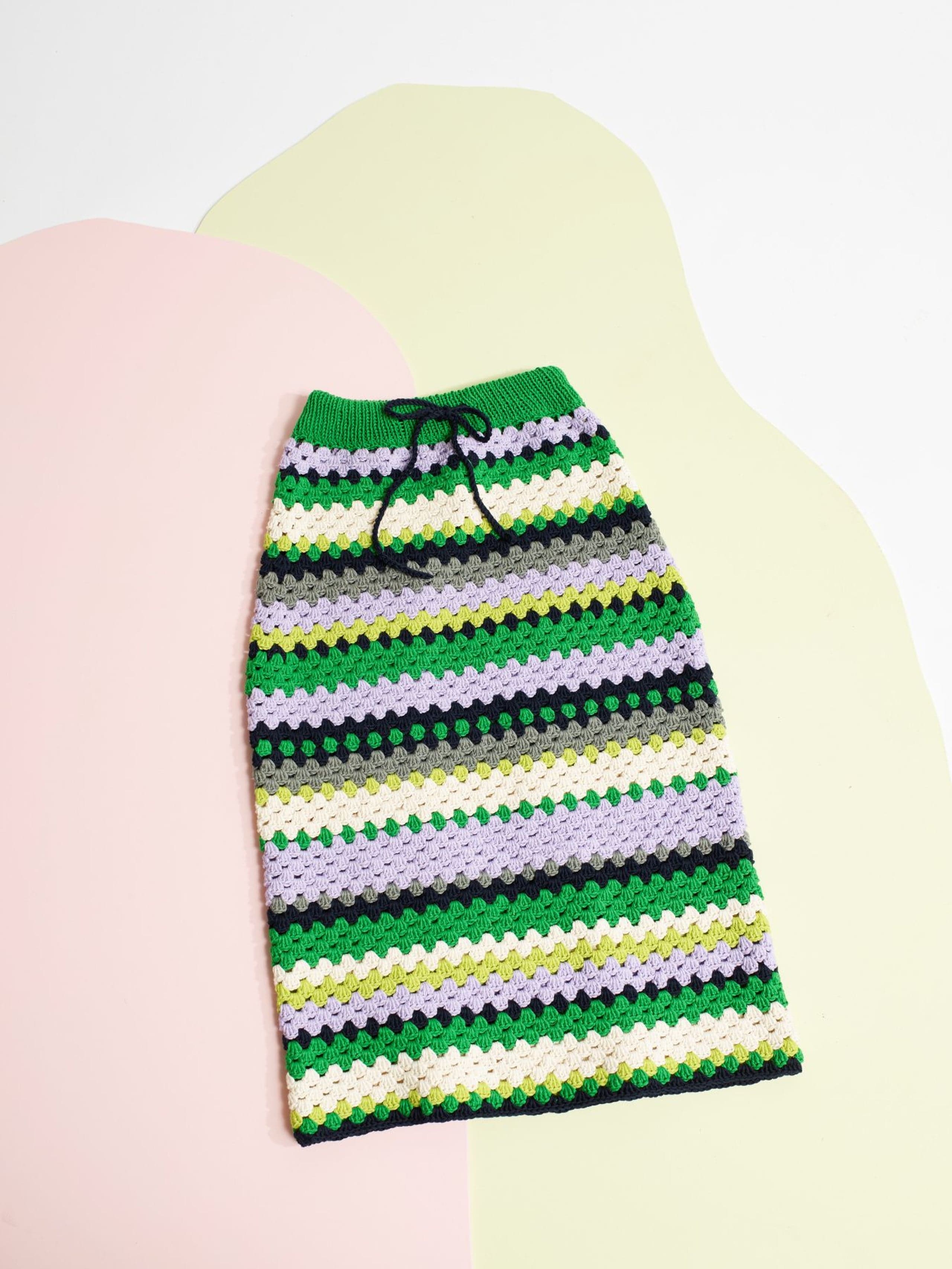 Krokus skjørt er et heklet stripeskjørt med strikket linning og knytesnor i livet. Skjørtet er kroppsnært med en rett fasong og rekker til ca midt på leggen. Det hekles ovenfra og ned og det økes i hver side over hoftene. Siden skjørtet hekles ovenfra, kan lengden enkelt justeres underveis i arbeidet. For å få en kroppsnær fasong, velg en størrelse som har en stussvidde som er like stor eller noen cm større enn din egen stussvidde.