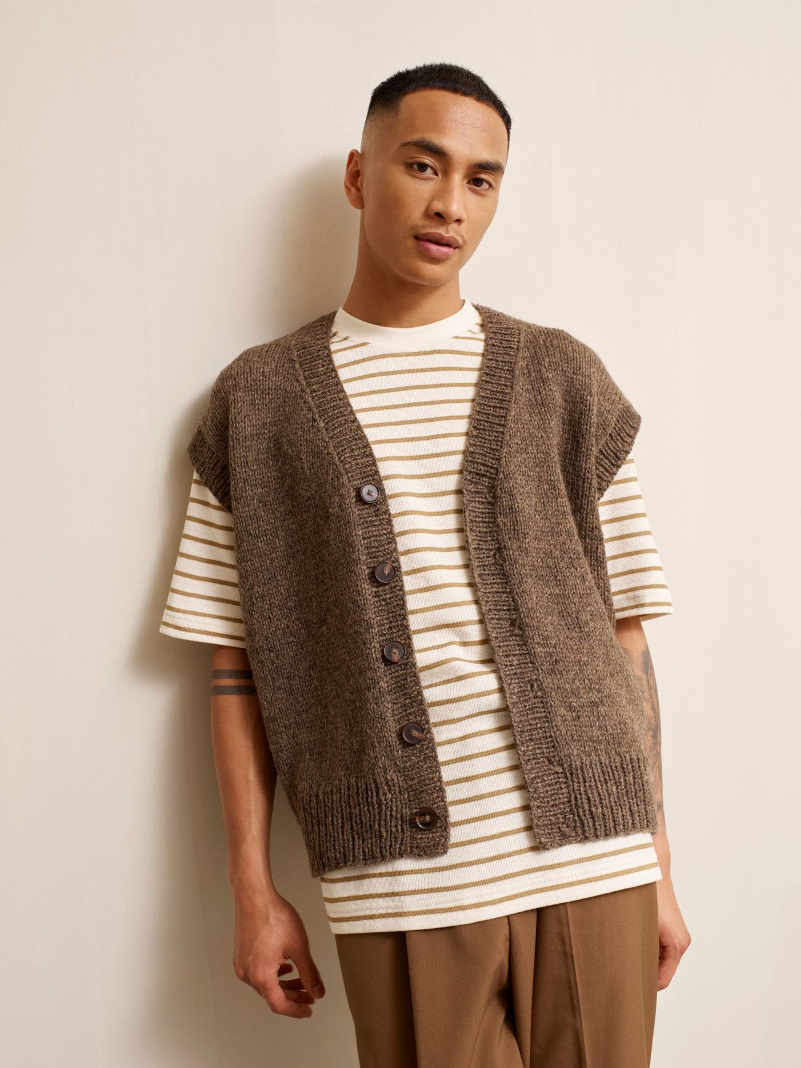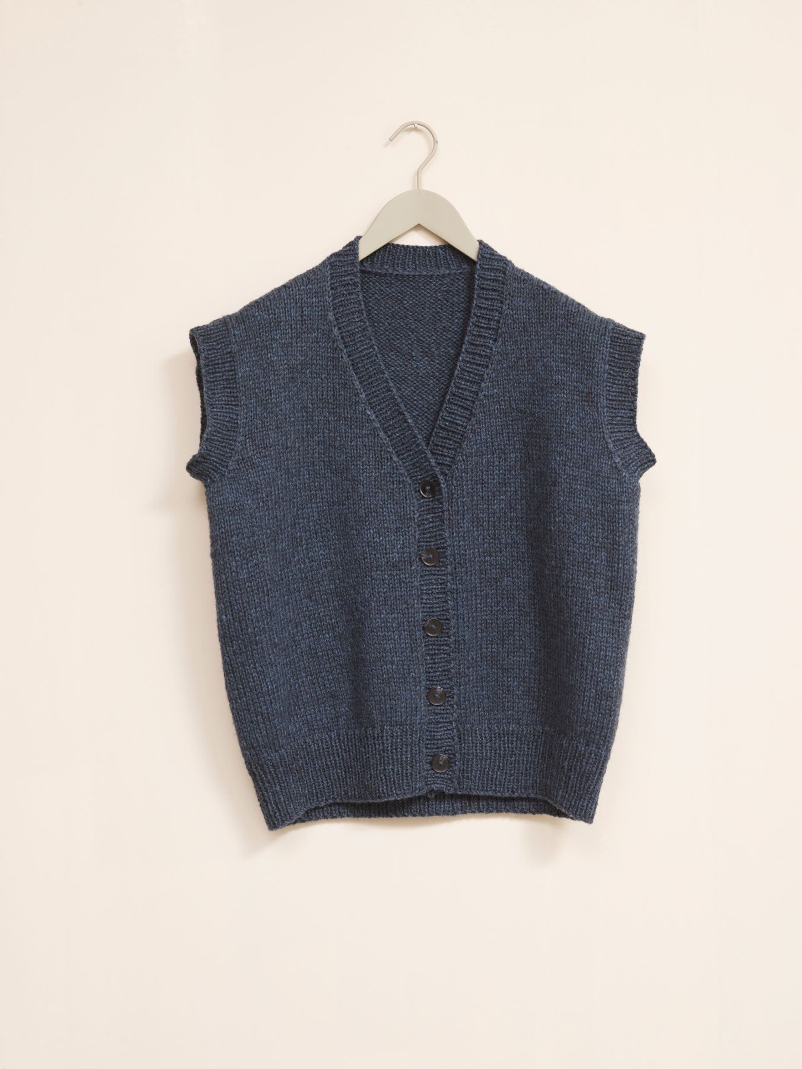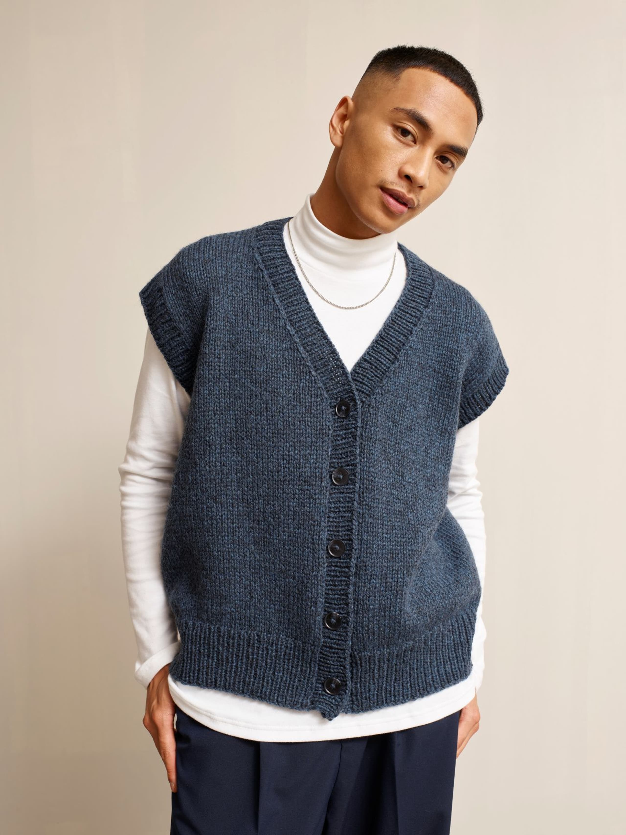 Aslak vest er en glattstrikket vest med ribbestrikkede kanter. Vesten har en rett og ledig passform med v-hals og knapper foran. Den strikkes frem og tilbake, nedenfra og opp. For å få en ledig passform, velg en størrelse som har en brystvidde som er 10-18 cm større enn din egen.