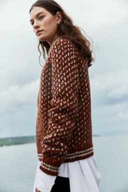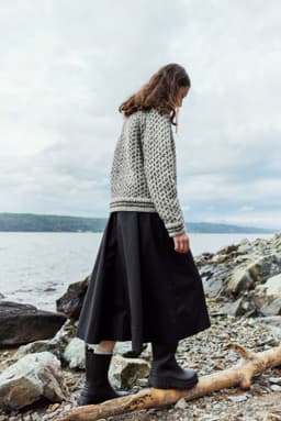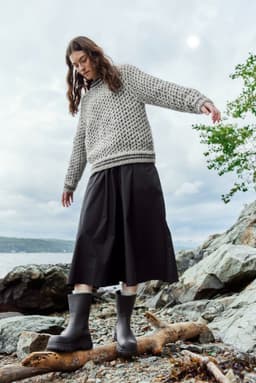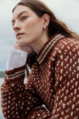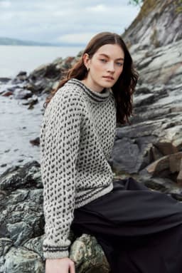 Islenderen er en klassisk genser med mønster i to farger. Den har en rett og ledig passform med raglan og ribbestrikkede kanter med striper. Genseren strikkes nedenfra og opp. Raglanfellingene strikkes på hver side av en mønsterbord. Halsringningen formes ved å strikke vendepinner og halskanten brettes dobbel innover. For å få en ledig passform, velg en størrelse som har en brystvidde som er 10-18 cm større enn din egen.