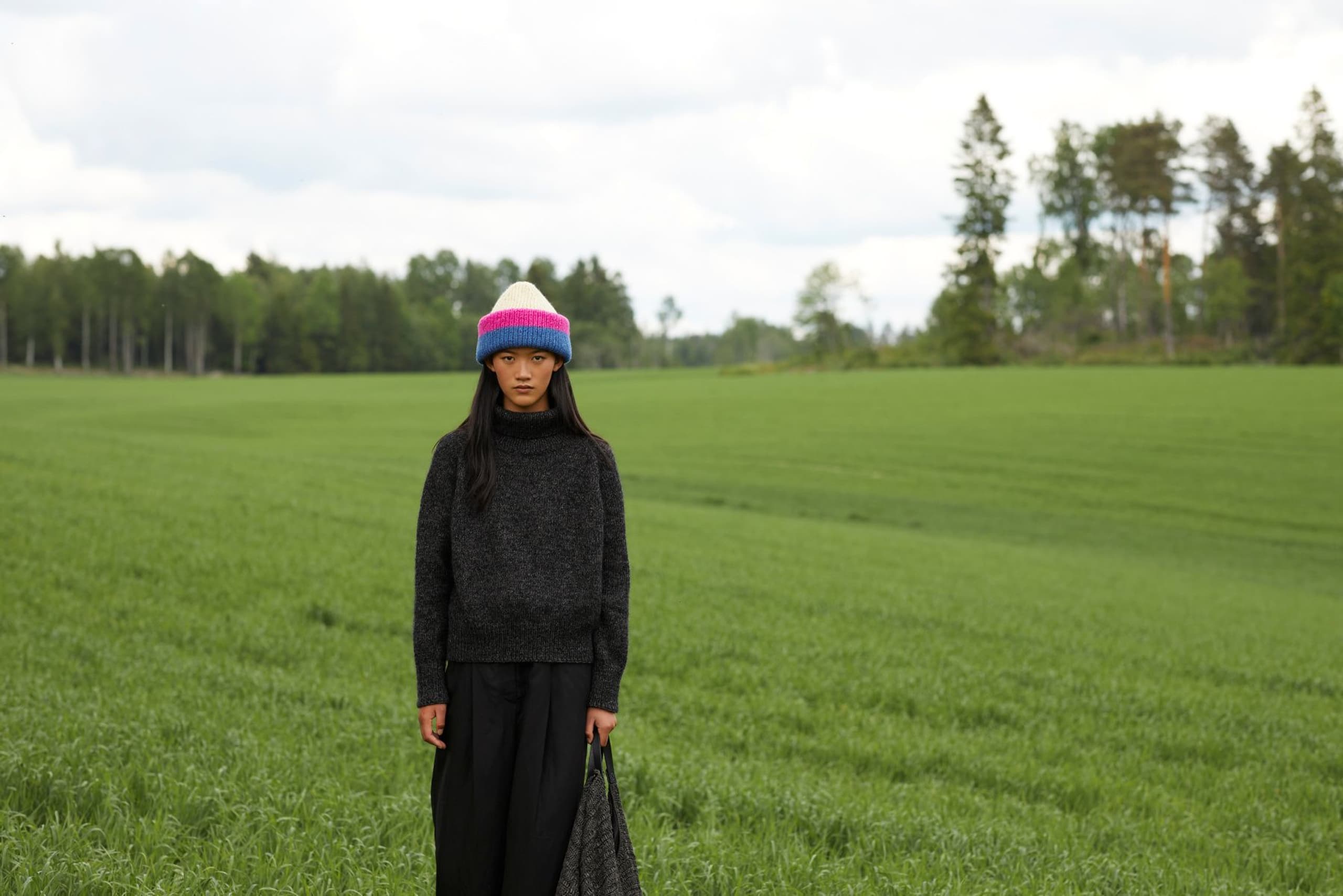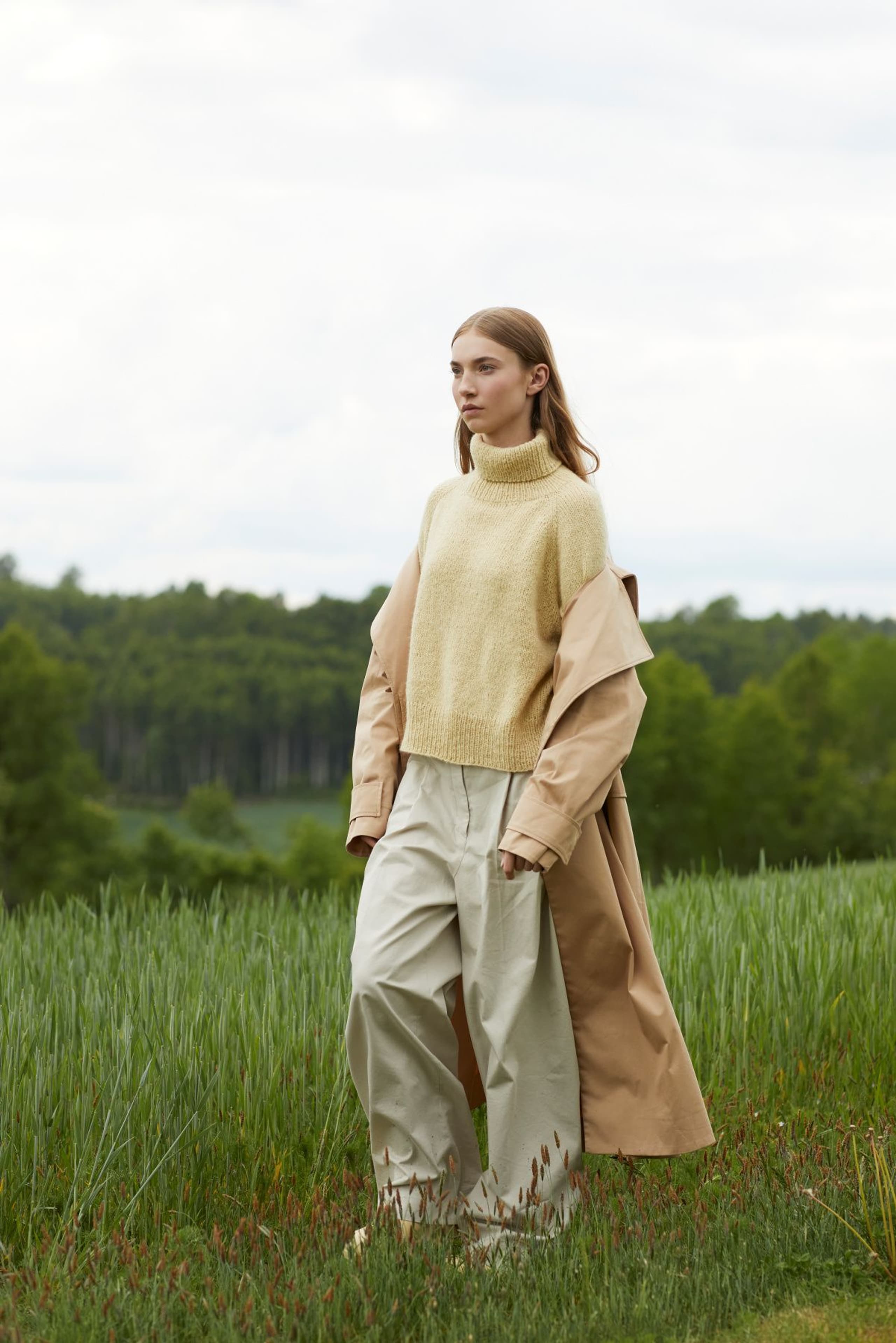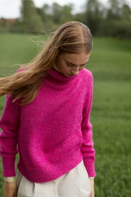 Sesam raglangenser er en oversized, glattstrikket raglangenser med høy hals. Den er kort og rett med lange ribbekanter. Genseren strikkes ovenfra og ned med 1 tråd Finull og 1 tråd Alpaca Silk. Halsringningen formes ved å strikke vendepinner og det økes til raglan på hver side av 3 glattstrikkede m. For å få en oversized passform, velg en størrelse som har en brystvidde som er 20-28 cm større enn din egen.
