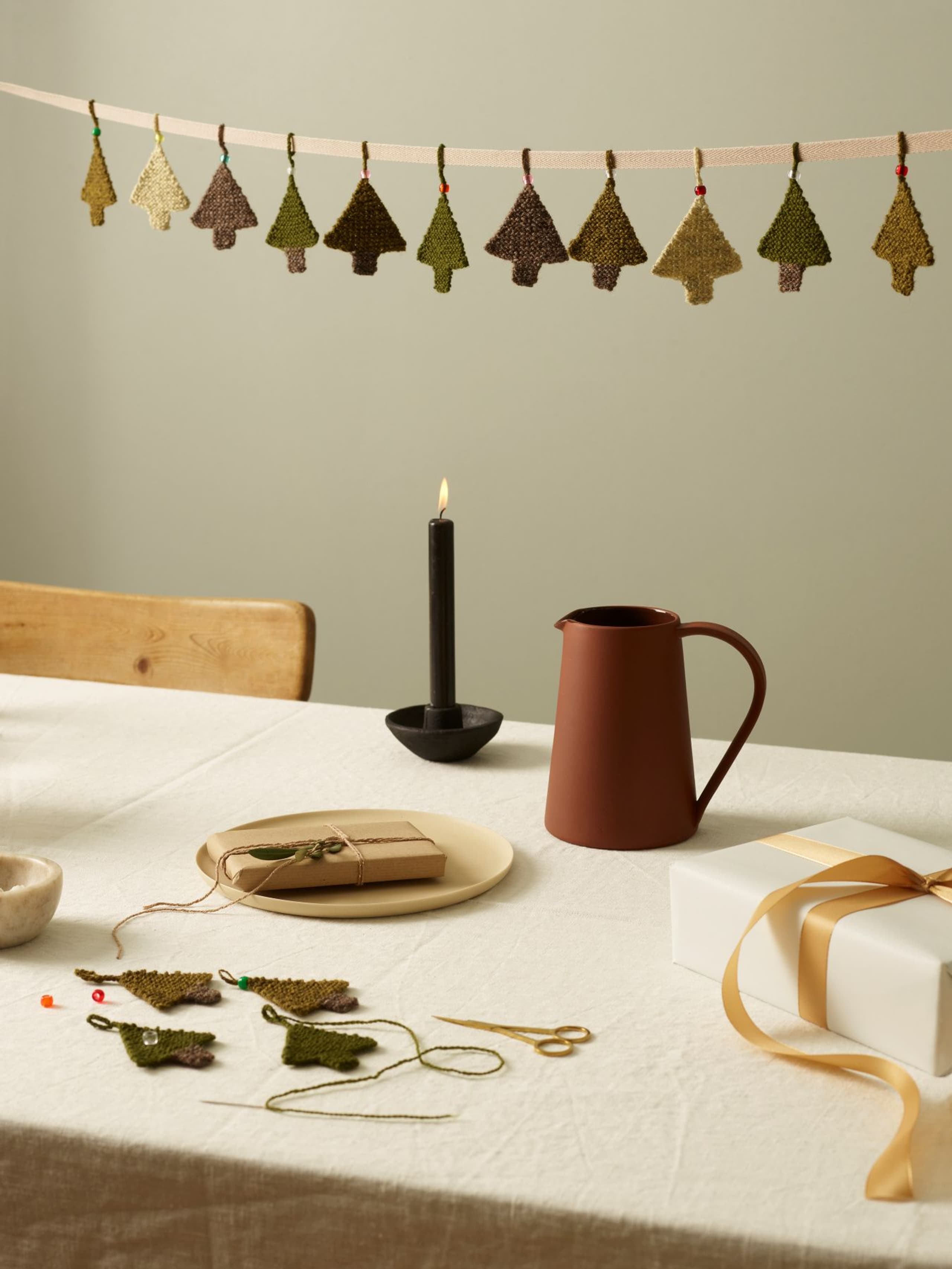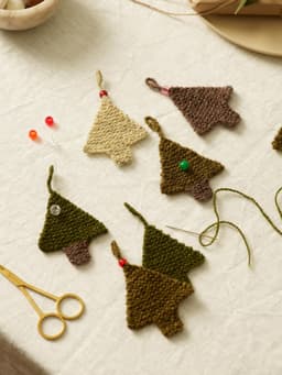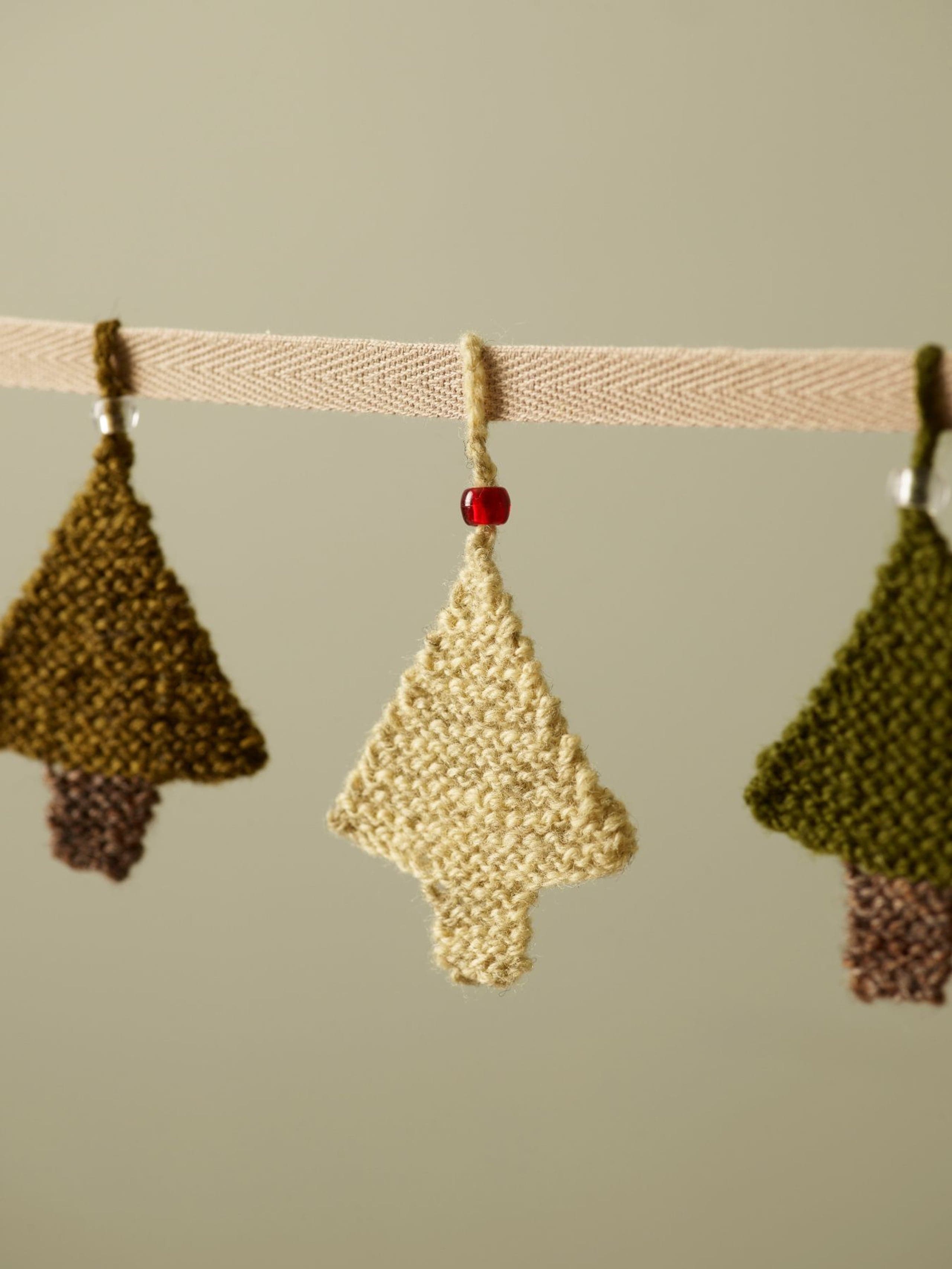Juletrærne og hjertene kan settes sammen til en girlander eller henges f.eks. på en gave. De strikkes i rillestrikk nedenfra og opp. Vi har dekorert hjertene og juletrærne med en perle på hempen. Men som alle andre juletrær, tåler også disse massevis av pynt. Det er bare å slå seg løs med perler og paljetter! Det er et gøyalt prosjekt for barna.
