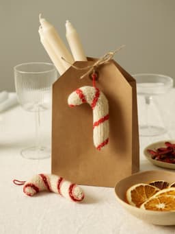 Sukkerstangen er søt julepynt til å henge på juletreet, eller kanskje på en gave. Den strikkes rundt, fra bunnen til toppen. Den buede formen strikkes med vendepinner. Stripene er brodert på til slutt. Sukkerstangen fylles med ullflor.