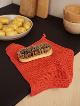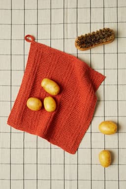 Middagskluten strikkes frem og tilbake. Den strikkes i et strukturmønster. Til slutt hekles det på en hempe i det ene hjørnet, for oppheng av kluten.