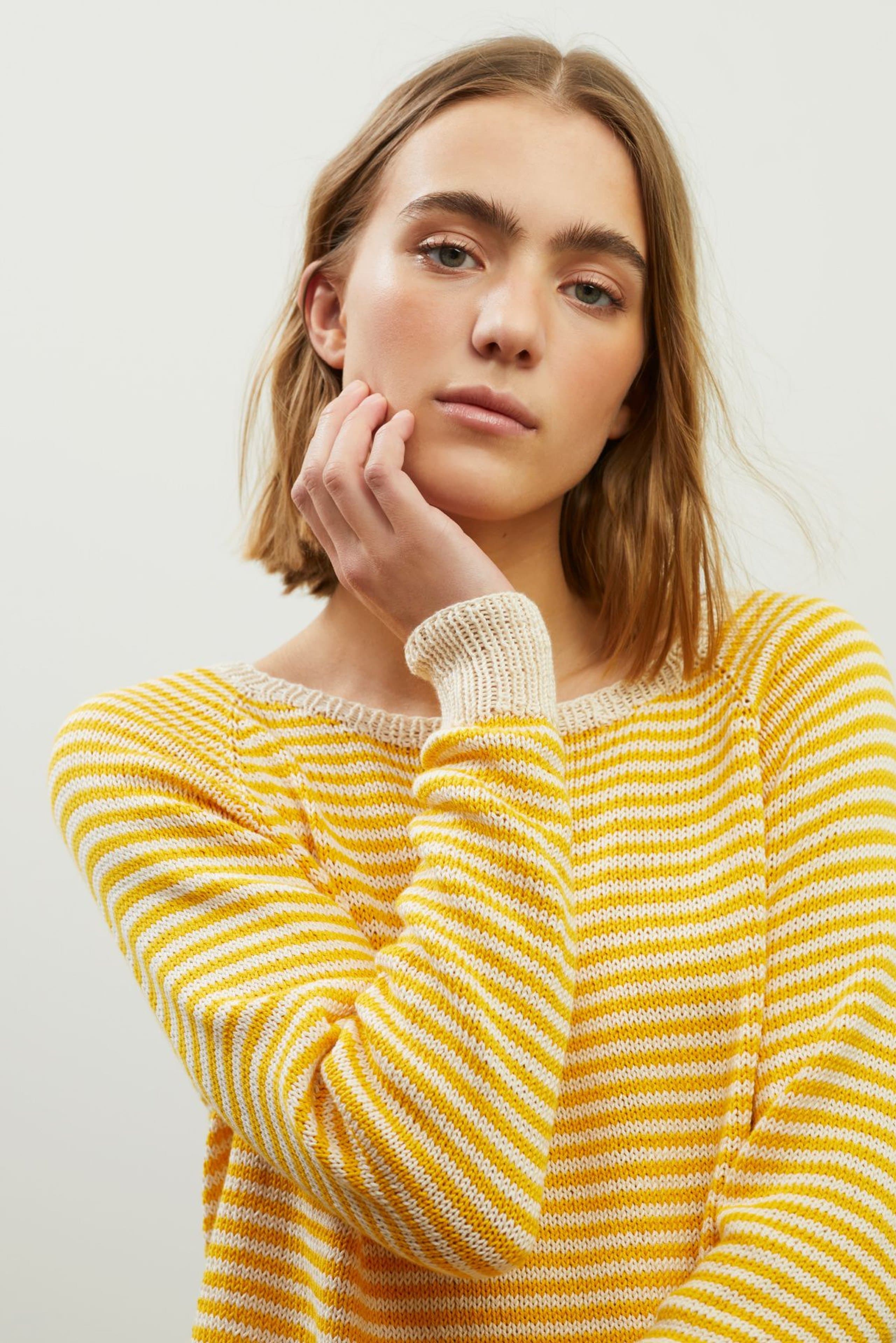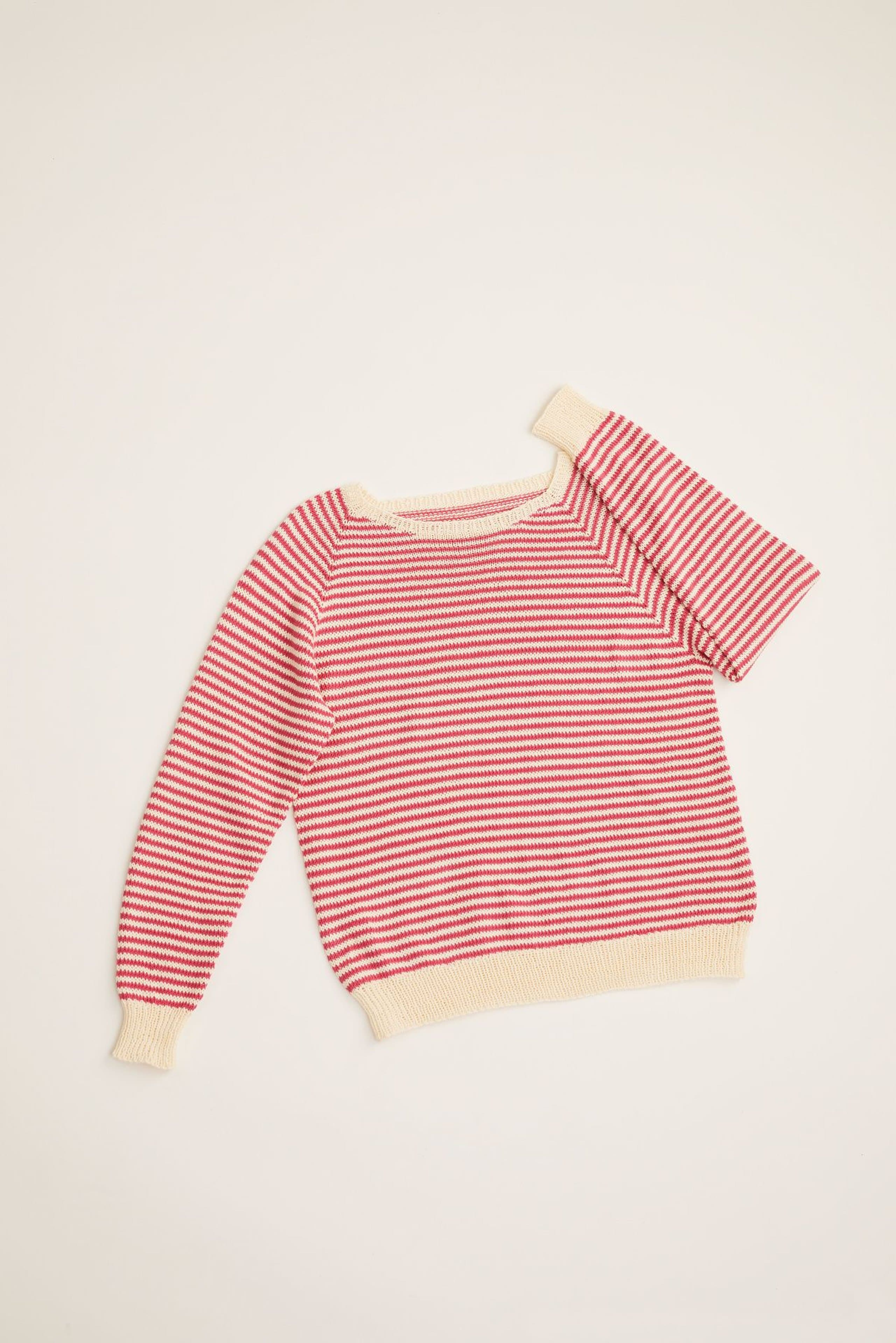Flora stripegenser er en enkel glattstrikket genser med smale striper, rund hals og klassisk passform. Genseren strikkes ovenfra og ned med raglanøkninger og ribbestrikkede kanter. Først strikkes halskanten, og videre strikkes bærestykket. Halsringningen formes ved å strikke vendepinner og det økes samtidig til raglan. Etter raglanøkningene deles arbeidet inn i ermer og bol, og hver del strikkes videre hver for seg nedover og avsluttes med ribbekanter. For å få en klassisk passform, strikk en størrelse som er 6-12 cm større enn brystvidden din.