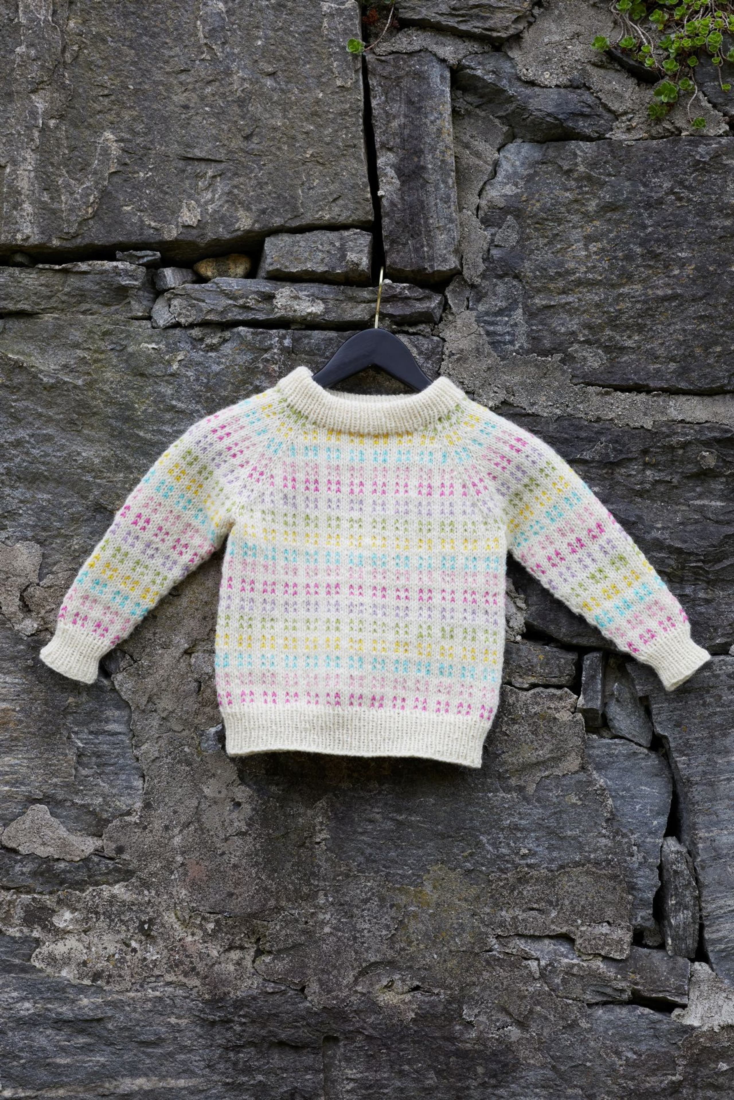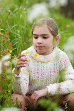 Ytterbakkegenser til barn er en helmønstret genser strikket i én bunnfarge og seks mønsterfarger. Mønsteret er en vri på det tradisjonelle lus-mønsteret i en morsom fargesetting. Genseren har en kort, rett og avslappet fasong med rund hals. Genseren er strikket ovenfra og ned. Først strikkes en halskant som skal brettes dobbel. Ringningen formes ved å strikke vendepinner, samtidig som det økes til raglan. Mellom raglanøkingene strikkes det en liten mønsterbord. Etter raglanøkingene deles arbeidet, og bol og ermer strikkes hver for seg. For en avslappet passform, velg en størrelse som er 10-16 cm større enn barnets brystvidde.