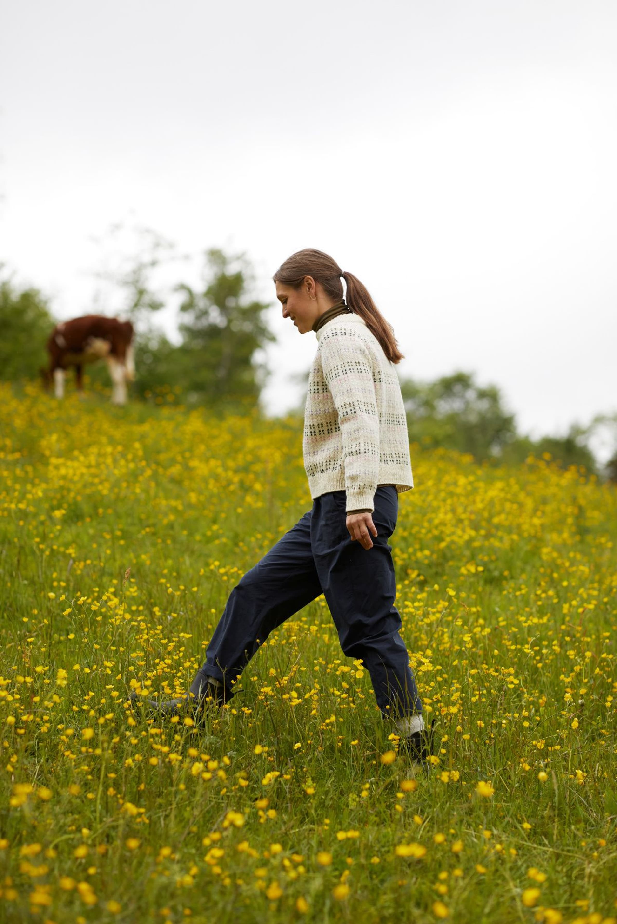 Strikket ovenfra og ned Ytterbakkegenser til dame er en helmønstret genser strikket i én bunnfarge og seks mønsterfarger. Mønsteret er en vri på det tradisjonelle lus-mønsteret og i en morsom fargesetting. Genseren har en kort, rett og avslappet fasong med rund hals. Genseren er strikket ovenfra og ned med. Først strikkes en halskant som skal brettes dobbel. Ringningen formes ved hjelp av vendepinner, samtidig som det økes til raglan. Mellom raglanøkingene strikkes det en liten mønsterbord. Etter raglanøkingene deles arbeidet, og bol og ermer strikkes hver for seg. For en avslappet passform, velg en størrelse som er 14-26 cm større enn din egen brystvidde.
