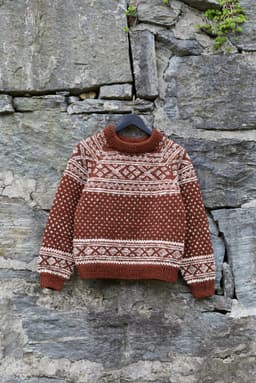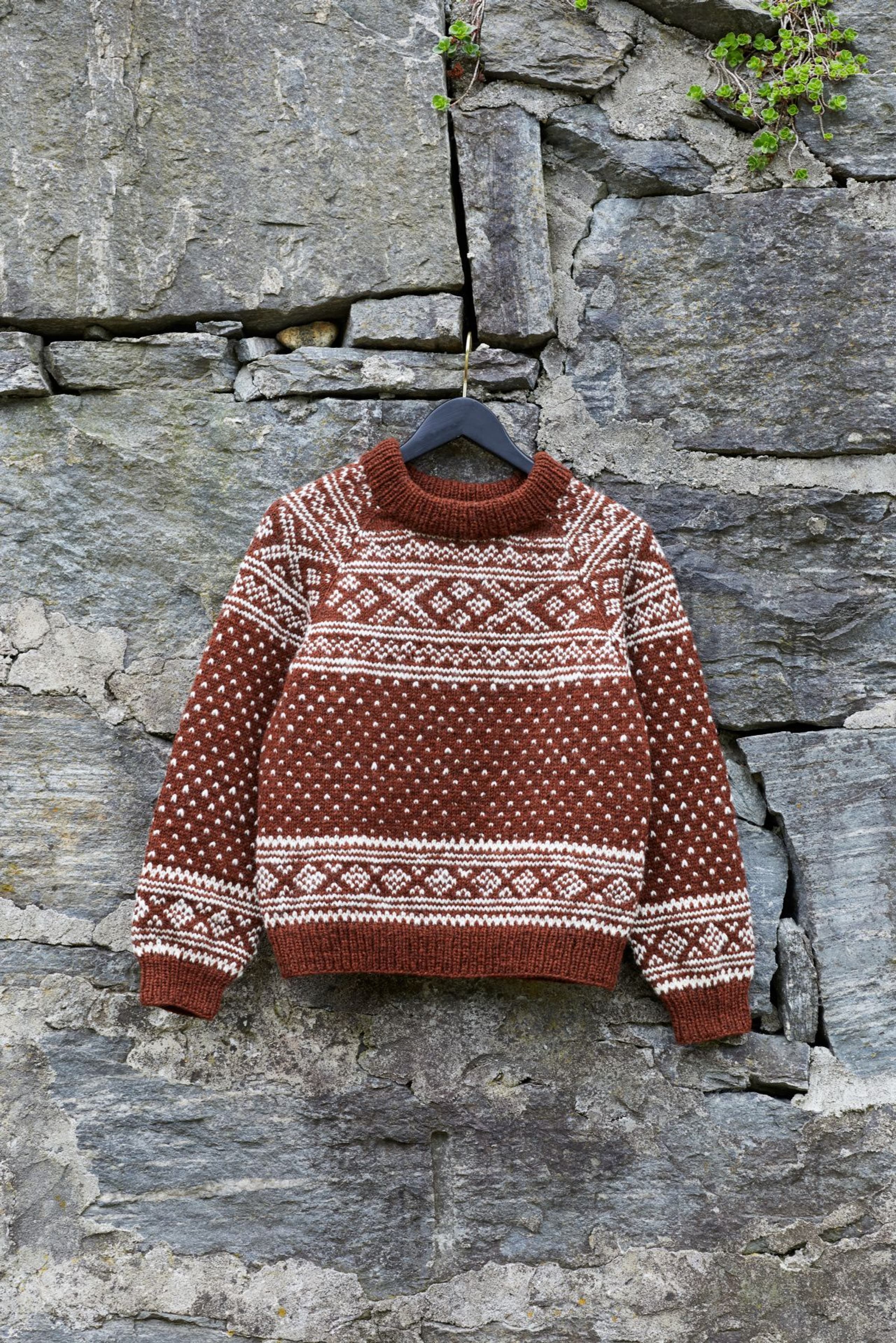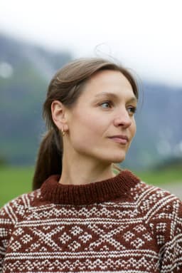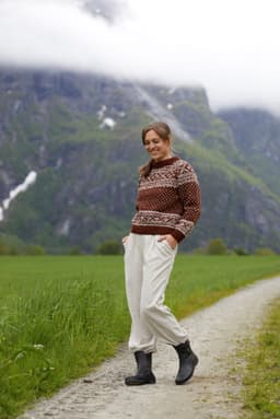 Setesdalgenser til dame er strikket i det klassiske Setesdalmønsteret med bred mønsterbord over bærestykket og lus over bol og ermer. Kantene på bol og ermer har også en bred mønsterbord før vrangbordene. Genseren har en kort, rett og avslappet fasong og er strikket ovenfra og ned. Først strikkes en lang halskant med vrangbord, som senere brettes inn mot vrangen og sys til. Etter halskanten formes halsringningen ved å strikke vendepinner, samtidig som det strikkes mønster og økes til raglan. Det økes på hver side av en raglan-maske, mønsteret er symmetrisk på hver side av raglan-m, slik at alle delene starter og slutter på samme sted i mønsteret. Etter raglanøkningen deles arbeidet inn til for- og bakstykke og ermer, som videre strikkes hver for seg. For en avslappet passform, velg en størrelse som er 14-22 cm større enn din egen brystvidde.