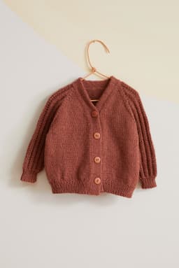 Ellis jakke er en søt raglanjakke med en liten v-hals og dobbelstrikkede kanter foran. Den strikkes ovenfra og ned med raglanøkinger. På ermene strikkes det strukturmønster og på for- og bakstykket glattstrikk. For å få en klassisk fasong, velg en størrelse som har en brystvidde som er 4-6 cm større enn barnets.