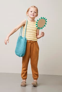 Jasmine nett er strikket i riller og strukturmønster. Det strikkes ovenfra og ned. Hullmønsteret blir like pent på retten som vrangen, velg derfor hvilke side som skal være ut før rillene og fellingen i bunnen. Hankene strikkes i i-cord og sys fast i kanten øverst.