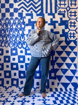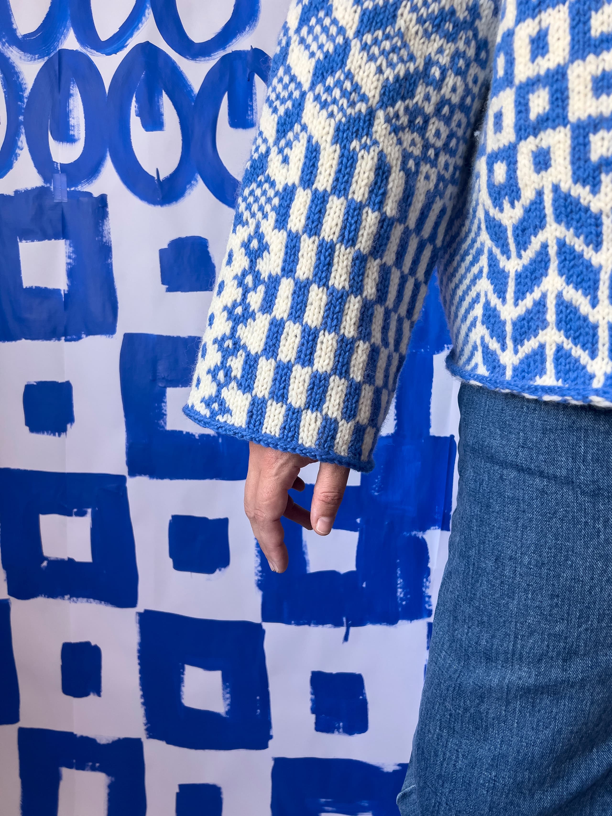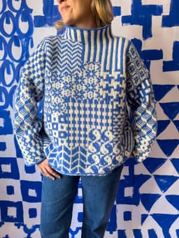 Boxy sweater med patchwork av tradisjonelle nordiske mønstre. Til Fremstrikk har Laura Dalgaard designet Nordic Mix Sweater. En mønstret genser i to farger inspirert av tradisjonsstrikk fra de nordiske landene. «Jeg er først og fremst inspirert av garnet, altså Fivel. Jeg fikk lyst til å lage en mash-up av ulike tradisjonsmønster og gi det nytt liv.» Laura fant gamle bilder av gensere i mønsterstrikk som hun klippet fra hverandre og limte sammen igjen til en genser med ulike mønster.