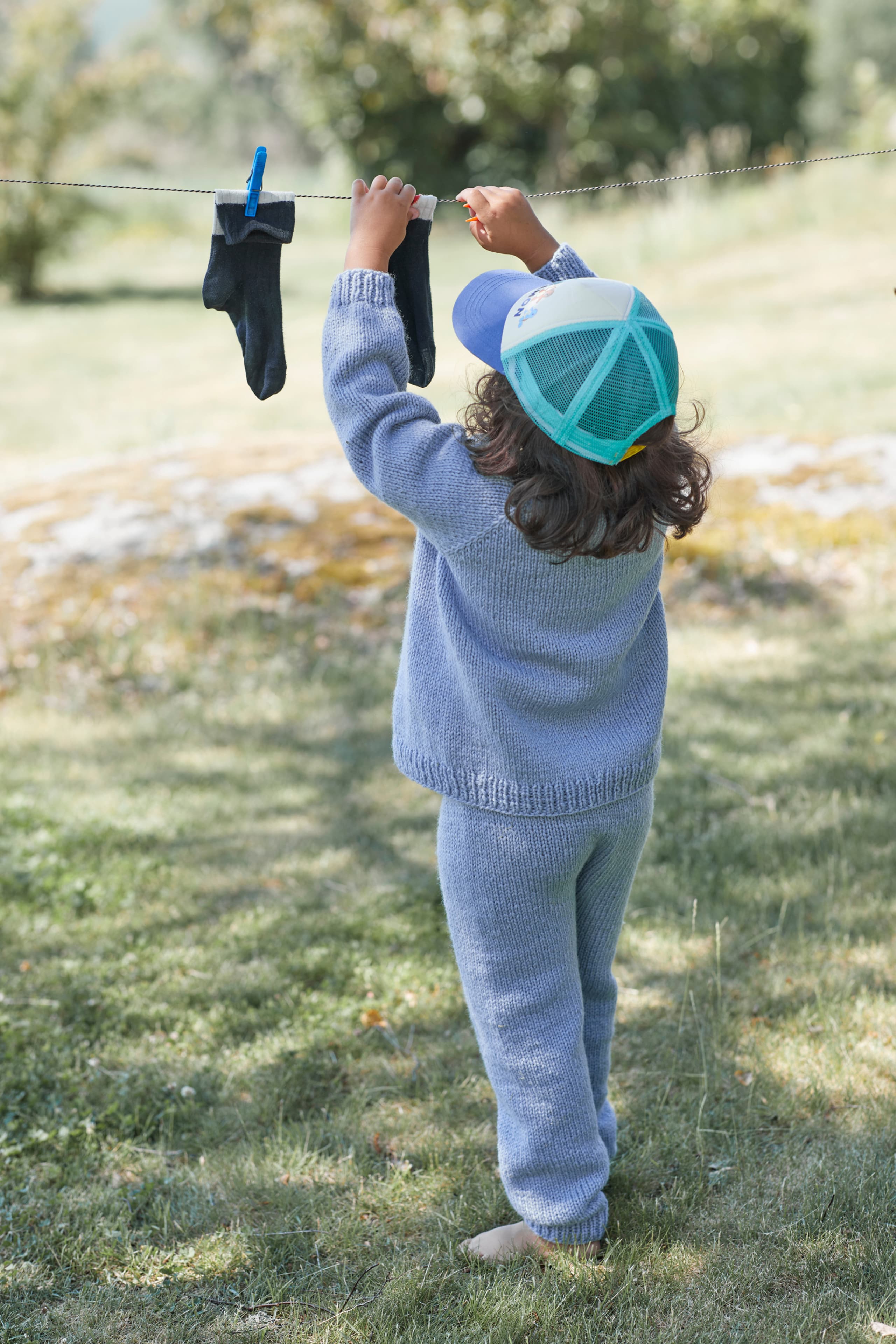 Saltobukse er en glattstrikket enkel bukse som strikkes ovenfra og ned. Buksen har en lett ettersittende passform, med vrangborder i 1x1 ribb. Saltobuksen starter øverst i livet med en bred vrangbord. Videre strikkes det glattstrikk og vendepinner for å gjøre buksen høyere bak. Når øverste del er ferdig, deles arbeidet, og hvert ben strikkes rundt hver for seg. Det felles på innsiden av benet avsluttes det med vrangbord