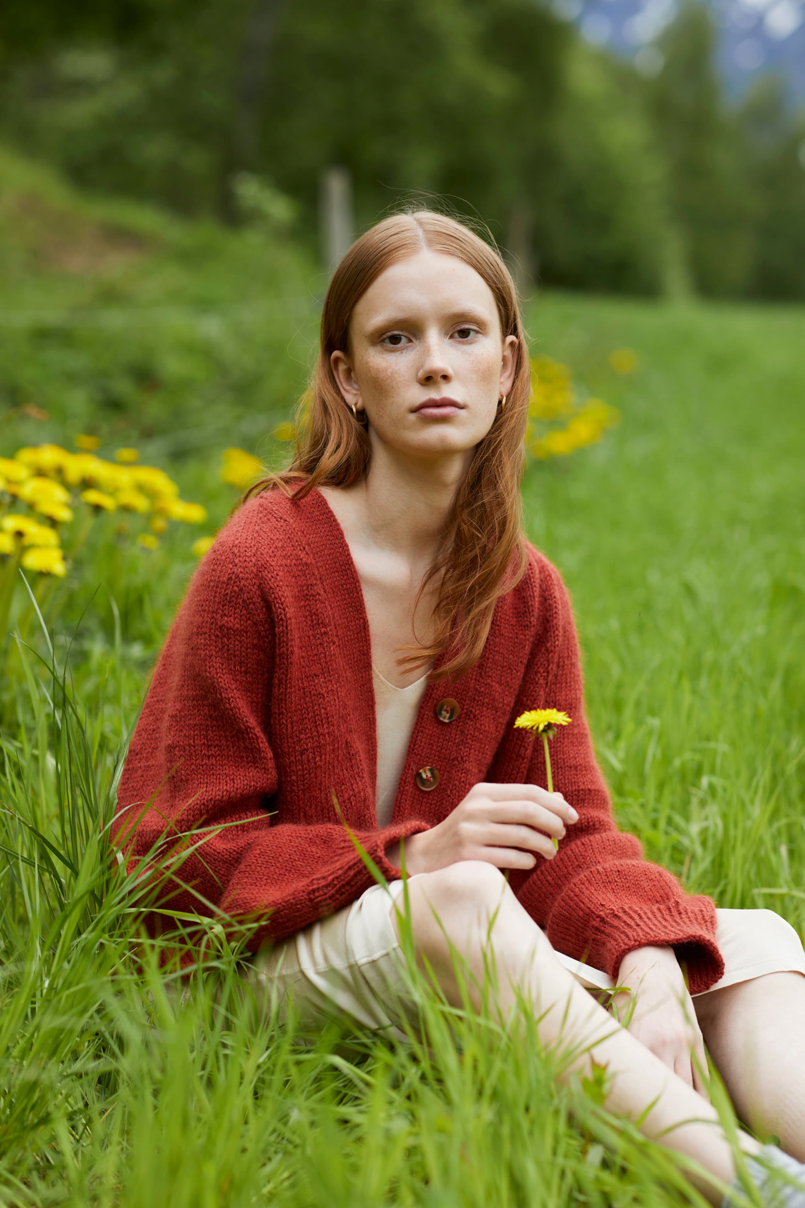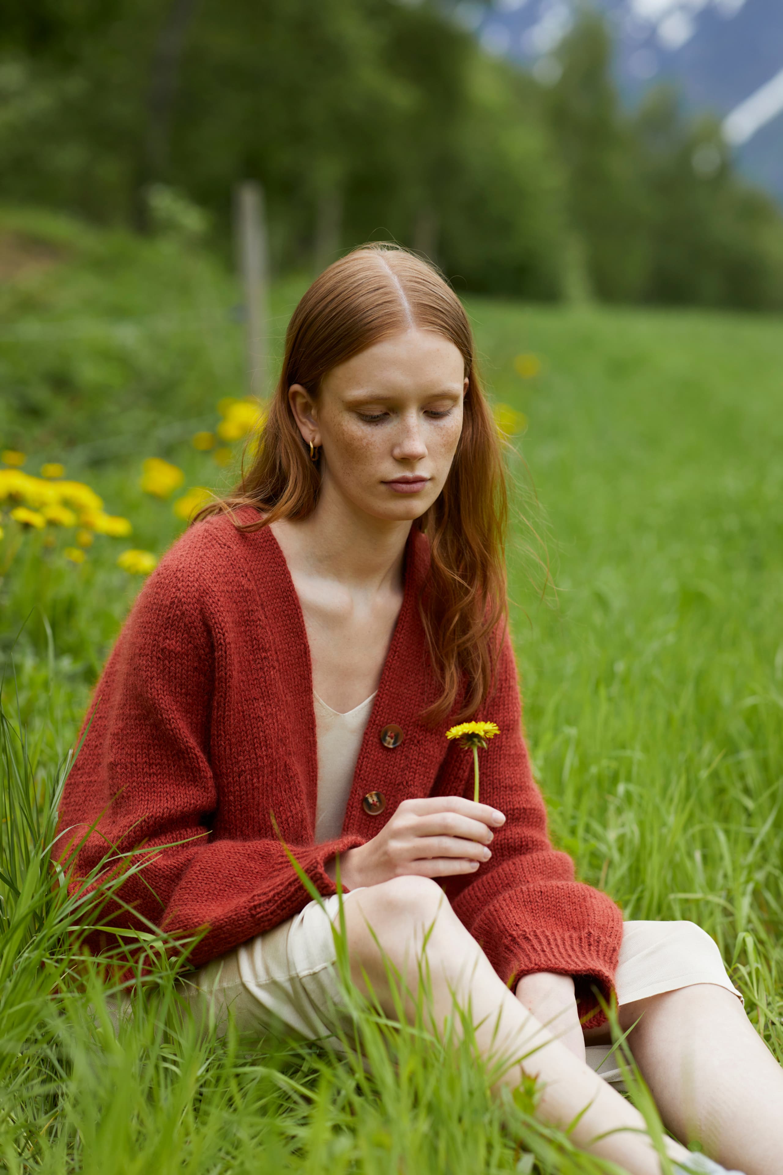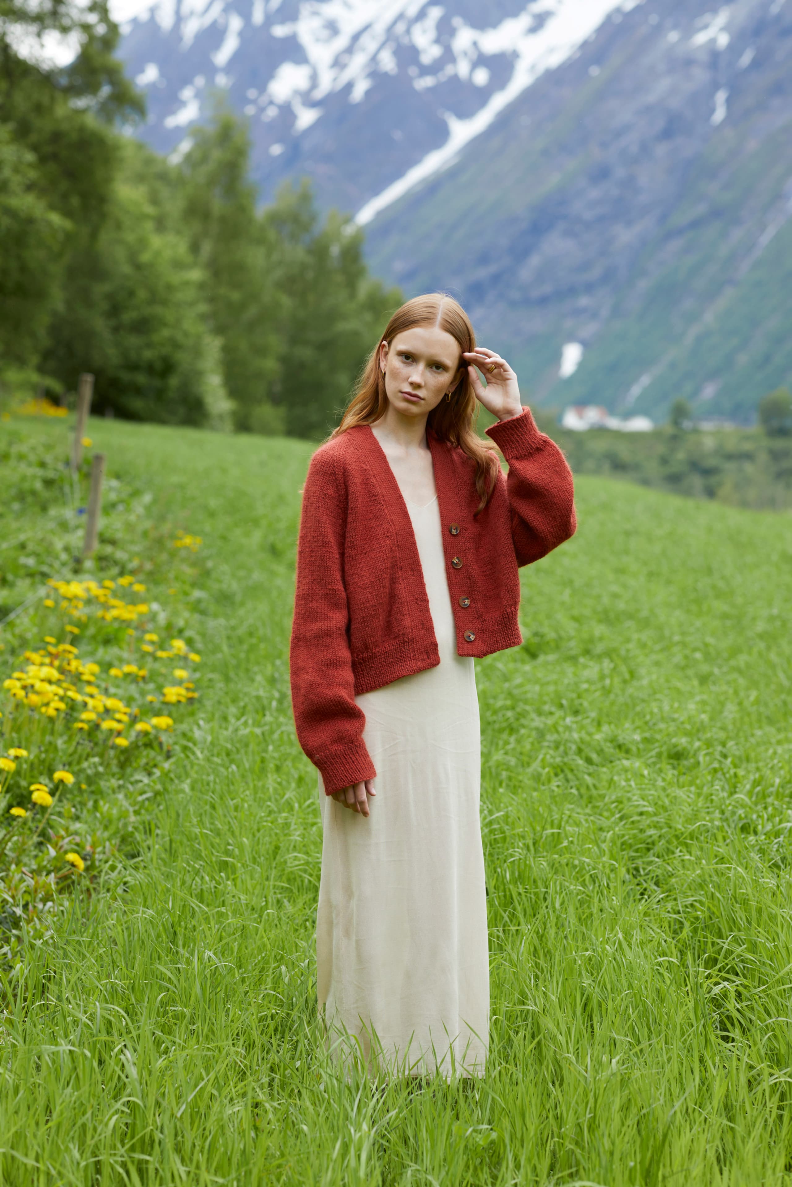 Vingejakken er en oversized glattstrikket raglanjakke, som strikkes ovenfra og ned. Jakken har en kort og rett fasong med dyp v-hals og stolper i dobbelstrikk. Ermene er ekstra lange og har kanter i 1x1 ribb. Vingejakken strikkes med én tråd Mitu sammen med én tråd Plum. Arbeidet starter i nakken og det strikkes frem og tilbake, samtidig som det økes til raglan og vhals. Når raglan og v-halsen er ferdige, strikkes ermene og bolen hver for seg og avsluttes med kanter i ribbestrikk. Stolpen rundt jakkens åpning strikkes opp til slutt og strikkes i dobbelstrikk med vertikale knapphull. Dobbelstrikk er en teknikk som gir en fast og stødig stolpe som holder jakken på plass.