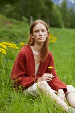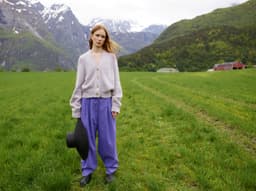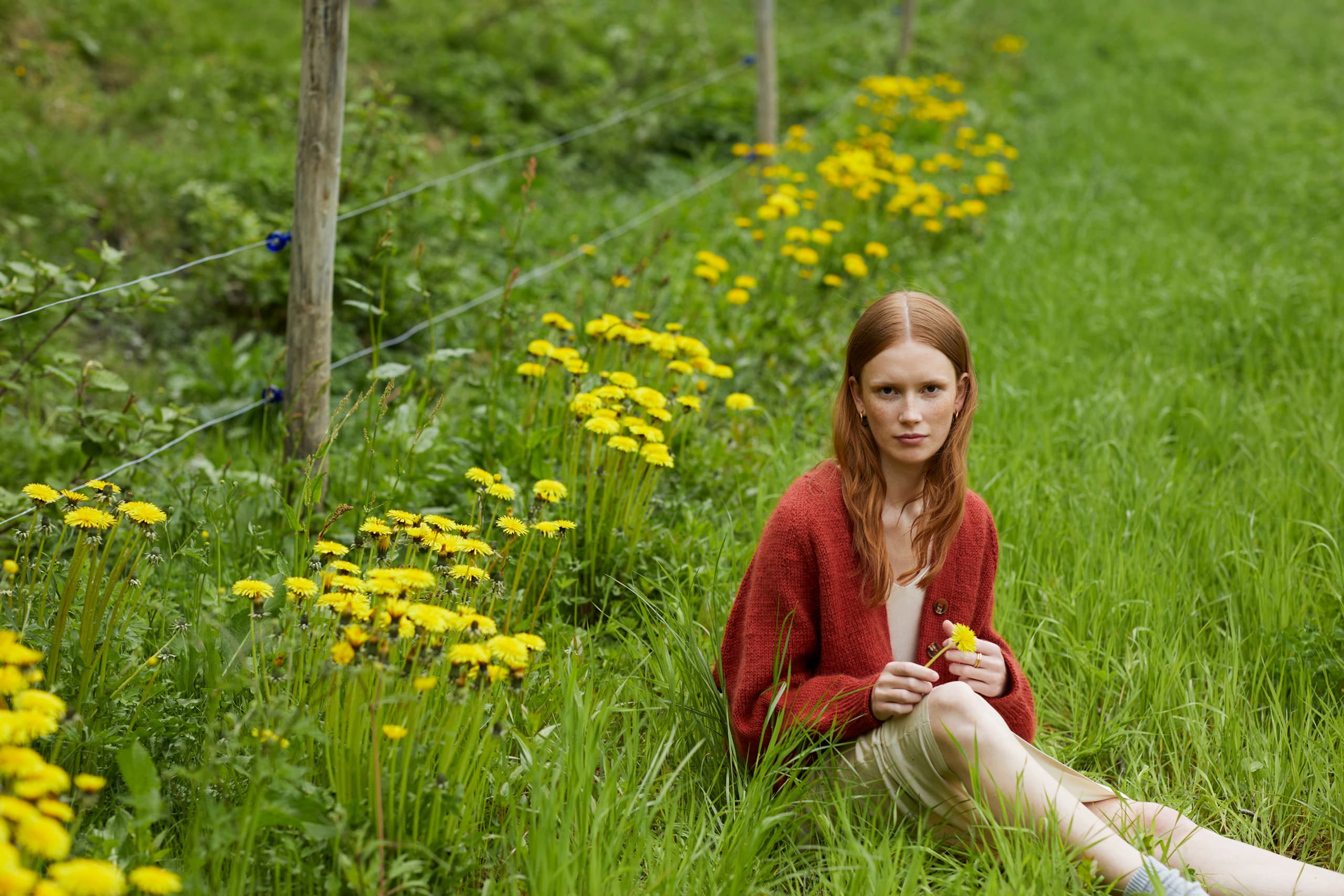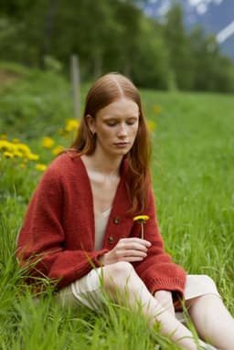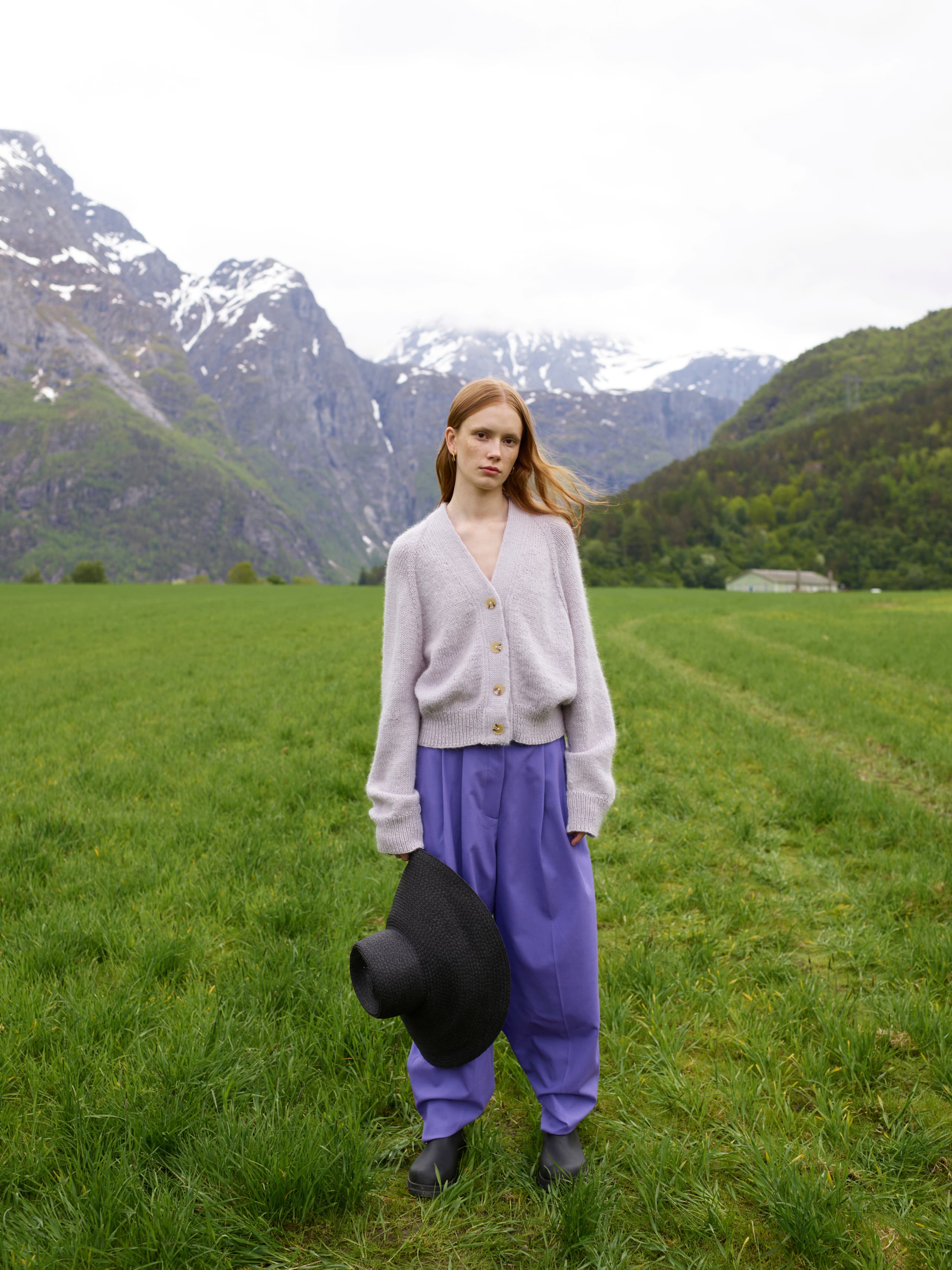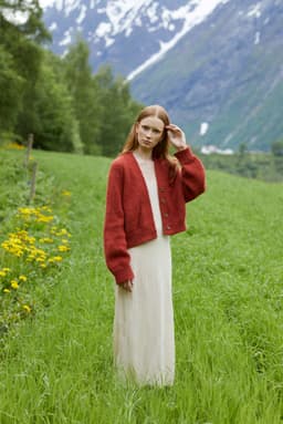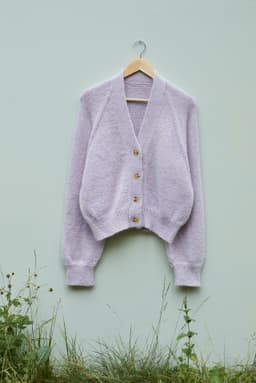 Vingejakken er en oversized glattstrikket raglanjakke, som strikkes ovenfra og ned. Jakken har en kort og rett fasong med dyp v-hals og stolper i dobbelstrikk. Ermene er ekstra lange og har kanter i 1x1 ribb. Vingejakken strikkes med én tråd Mitu sammen med én tråd Plum. Arbeidet starter i nakken og det strikkes frem og tilbake, samtidig som det økes til raglan og vhals. Når raglan og v-halsen er ferdige, strikkes ermene og bolen hver for seg og avsluttes med kanter i ribbestrikk. Stolpen rundt jakkens åpning strikkes opp til slutt og strikkes i dobbelstrikk med vertikale knapphull. Dobbelstrikk er en teknikk som gir en fast og stødig stolpe som holder jakken på plass.