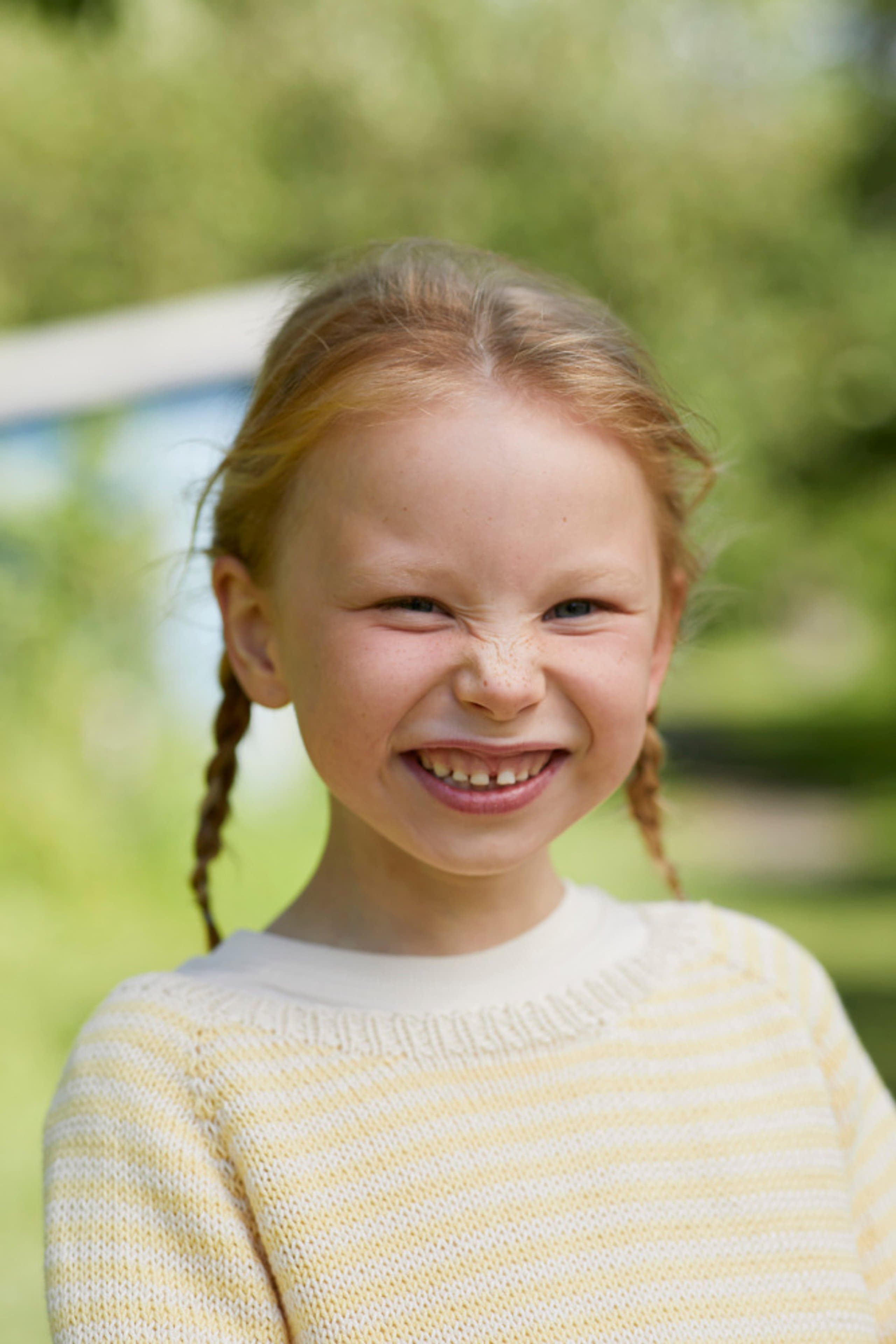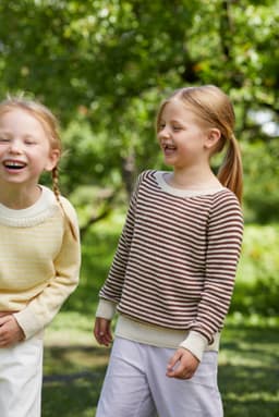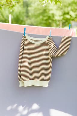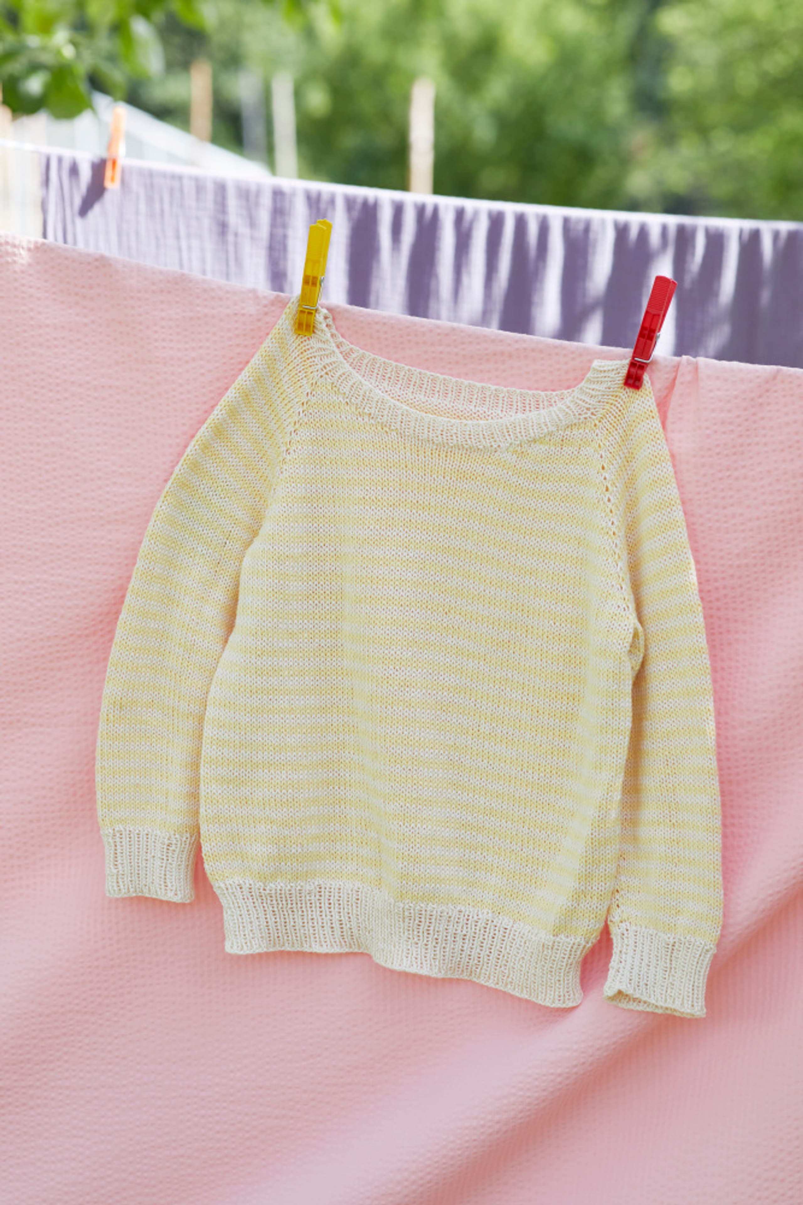 Flora stripegenser er en enkel glattstrikket genser med smale striper, rund hals og klassisk passform. Genseren strikkes ovenfra og ned med raglanøkninger og ribbestrikkede kanter. Først strikkes halskanten, og videre strikkes bærestykket. Halsringningen formes ved å strikke vendepinner og det økes samtidig til raglan. Etter raglanøkningene, deles arbeidet til ermer og bol, og hver del strikkes videre hver for seg og avsluttes med ribbekanter.