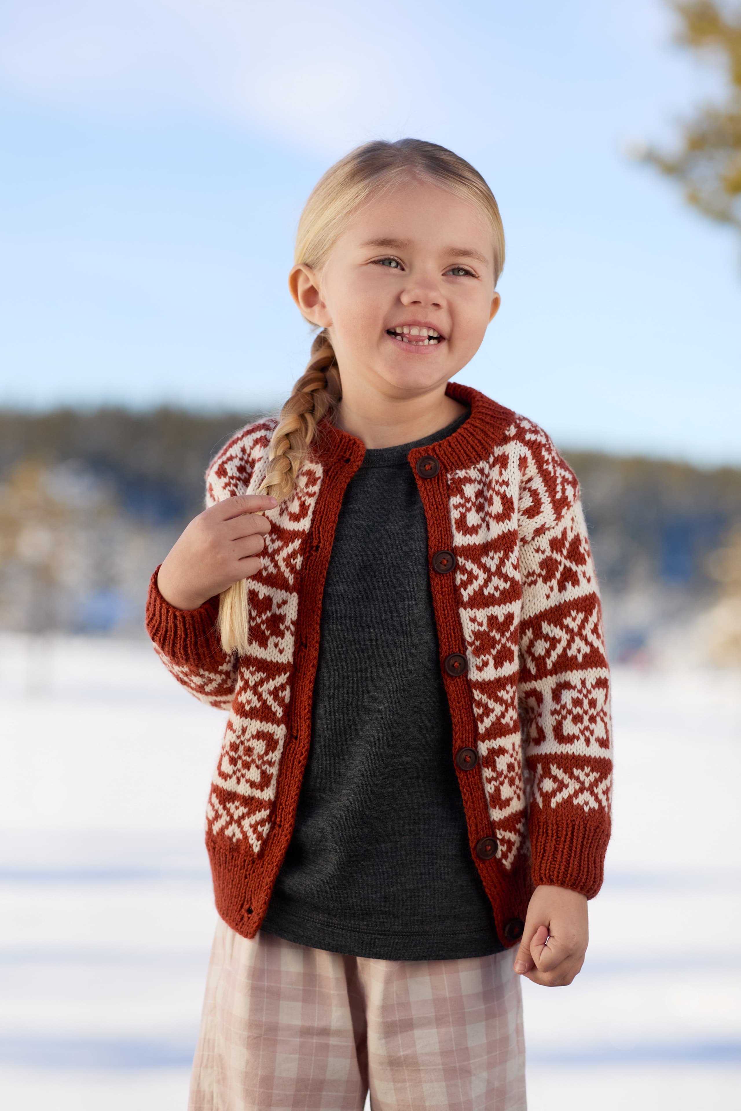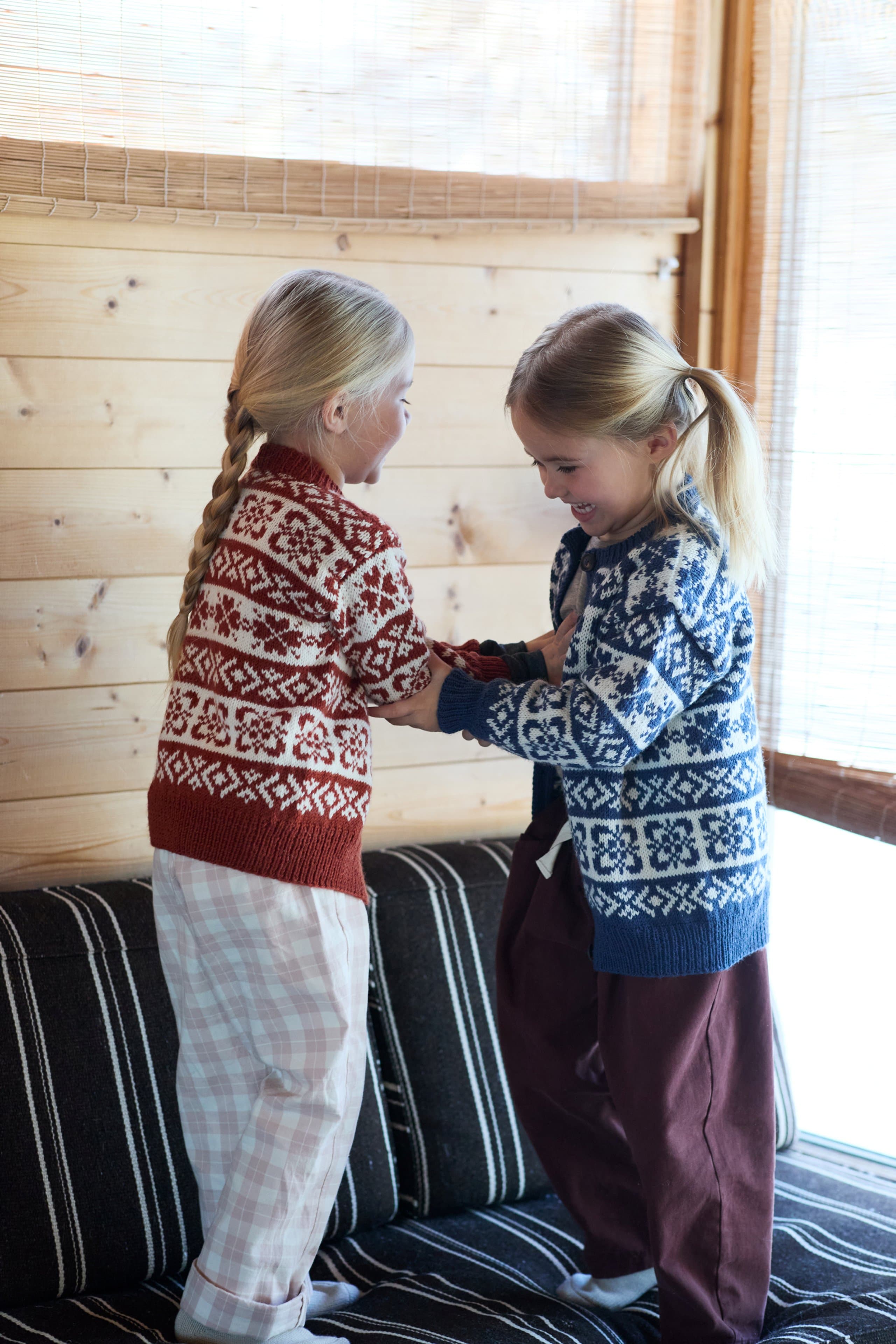 Hyttekofta er en klassisk mønstret jakke i tradisjonell stil, strikket i Pt5, et slitesterkt og maskinvaskbart garn i ull og nylon. Jakken strikkes nedenfra og opp med påsydd stolpe og oppklipp i midten. Mønsteret er bygget opp av border inspirert av gamle kofter, og passer til hele familien. Perfekt til skjermfrie hyttehelger, lesestunder og turopplevelser i frisk luft.