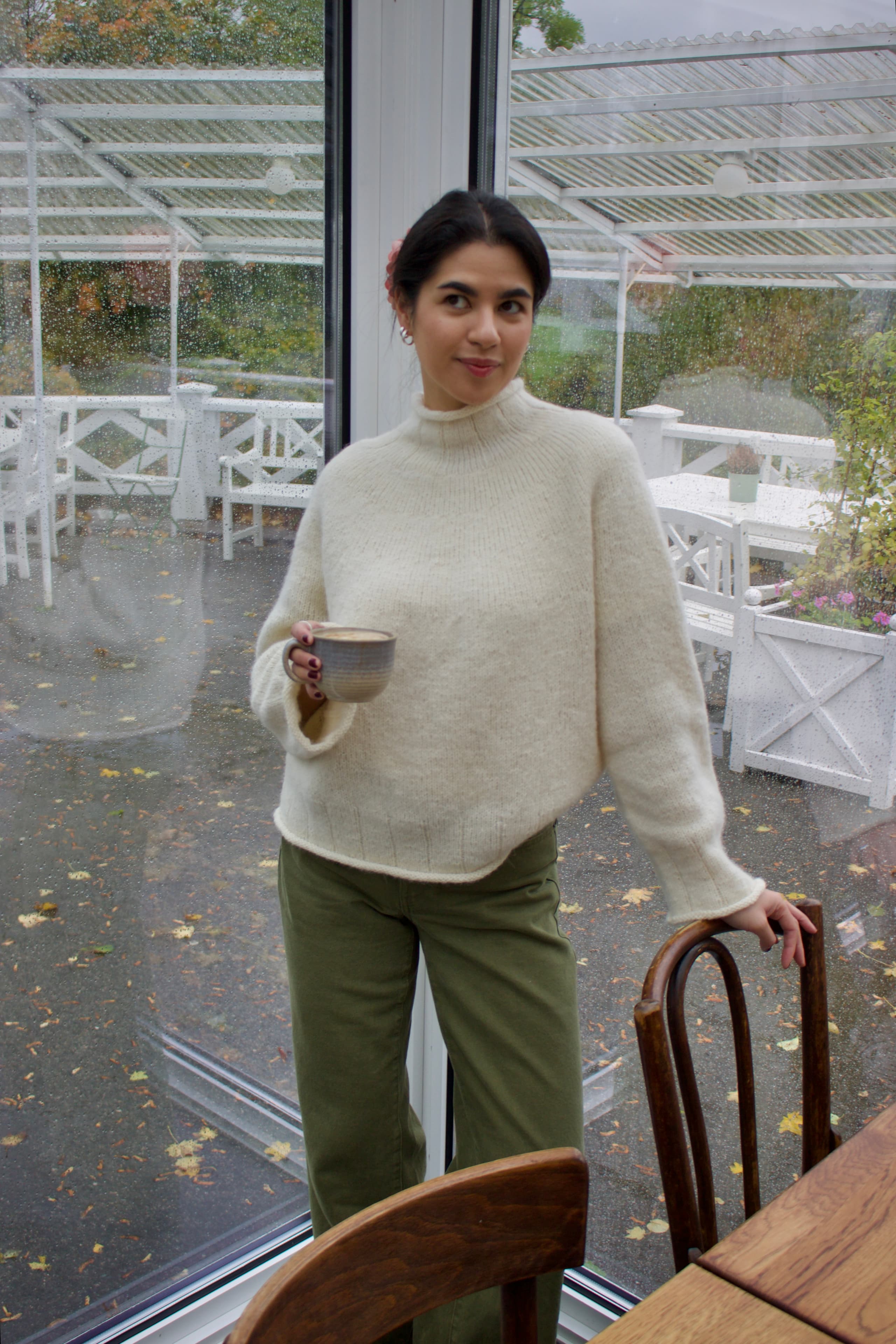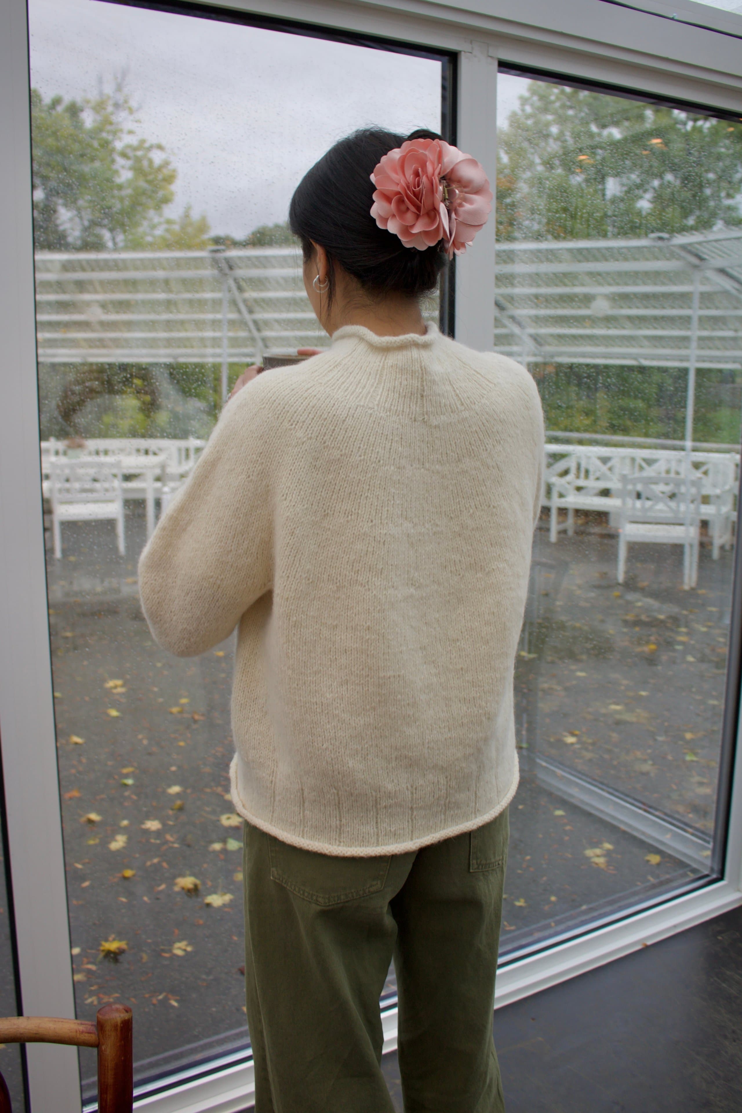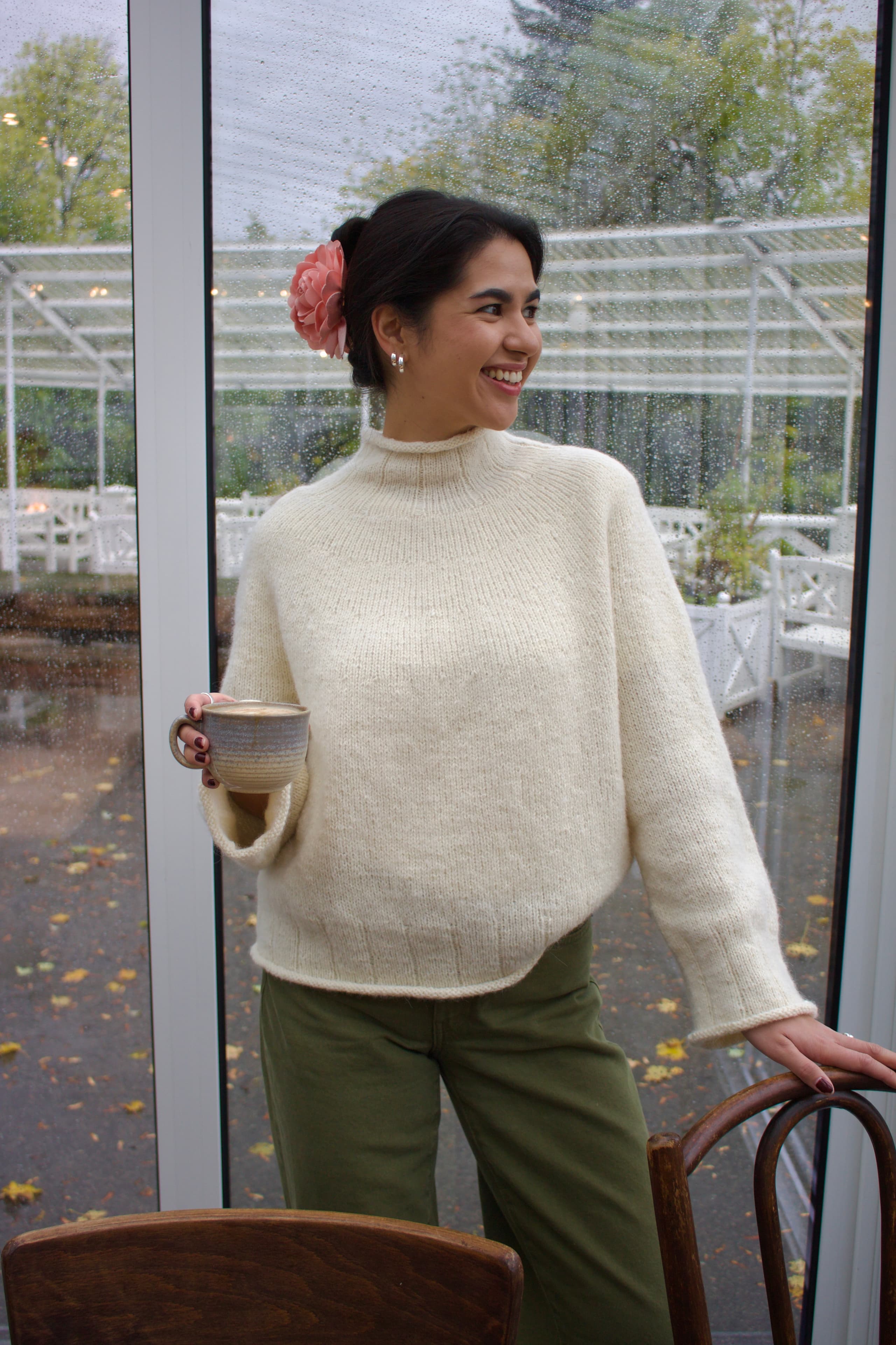 Heia rundgenser er en nybegynnervennlig genser med rundt bærestykke, som strikkes i norsk ull. Den har en rett og litt kort fasong med vide ermer og er fri for montering. Genseren strikkes ovenfra og ned, og passer perfekt som første genserprosjekt. En moderne og tidløs genser du vil ha glede av i mange år. Merk at oppskriften originalt strikkes i Fivel, Finull + Alpaca SIlk er et garnalternativ som ikke er oppført i oppskriften. Strikker du i Finull + Alpaca Silk skal det strikkes med en tråd av hver kvalitet.