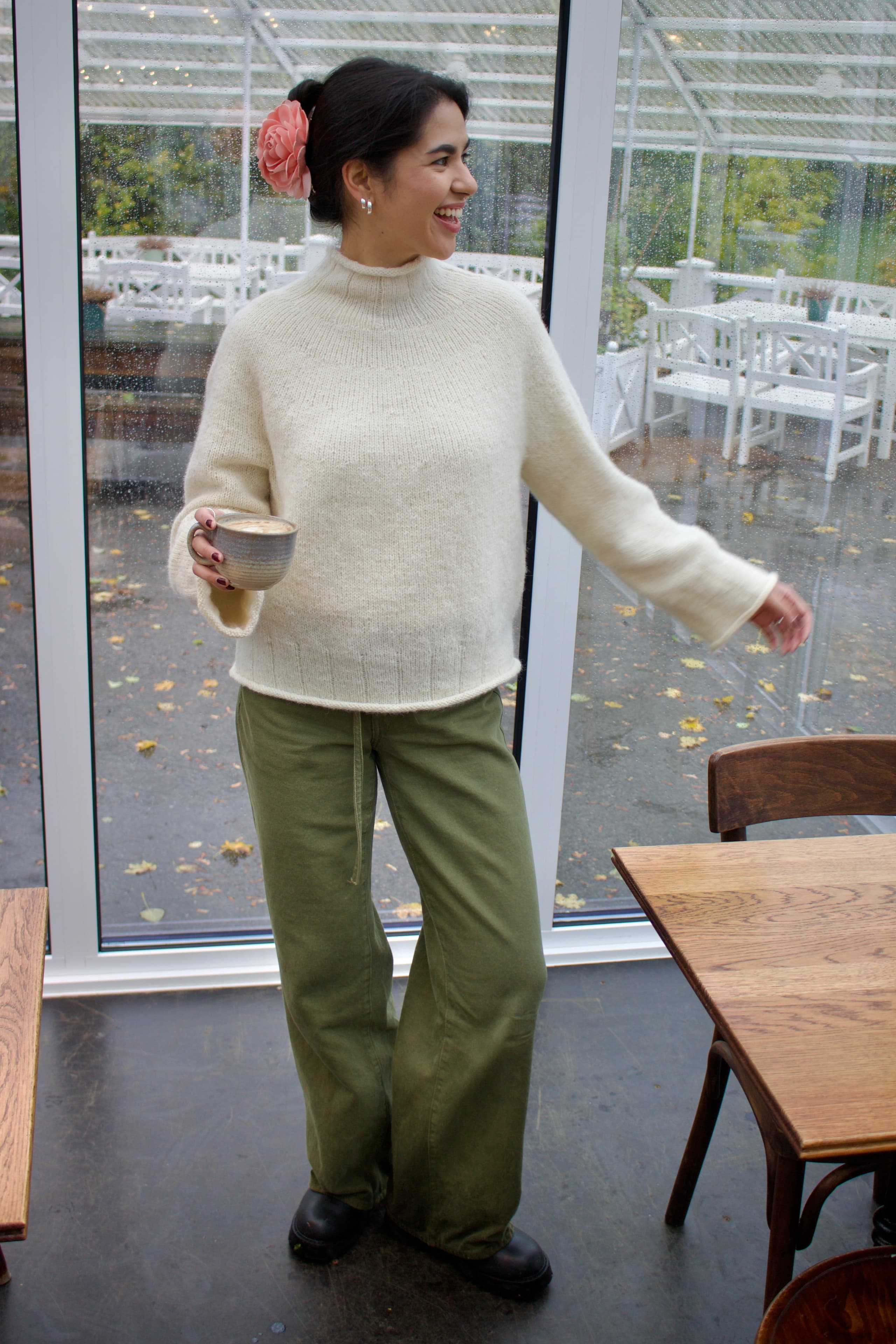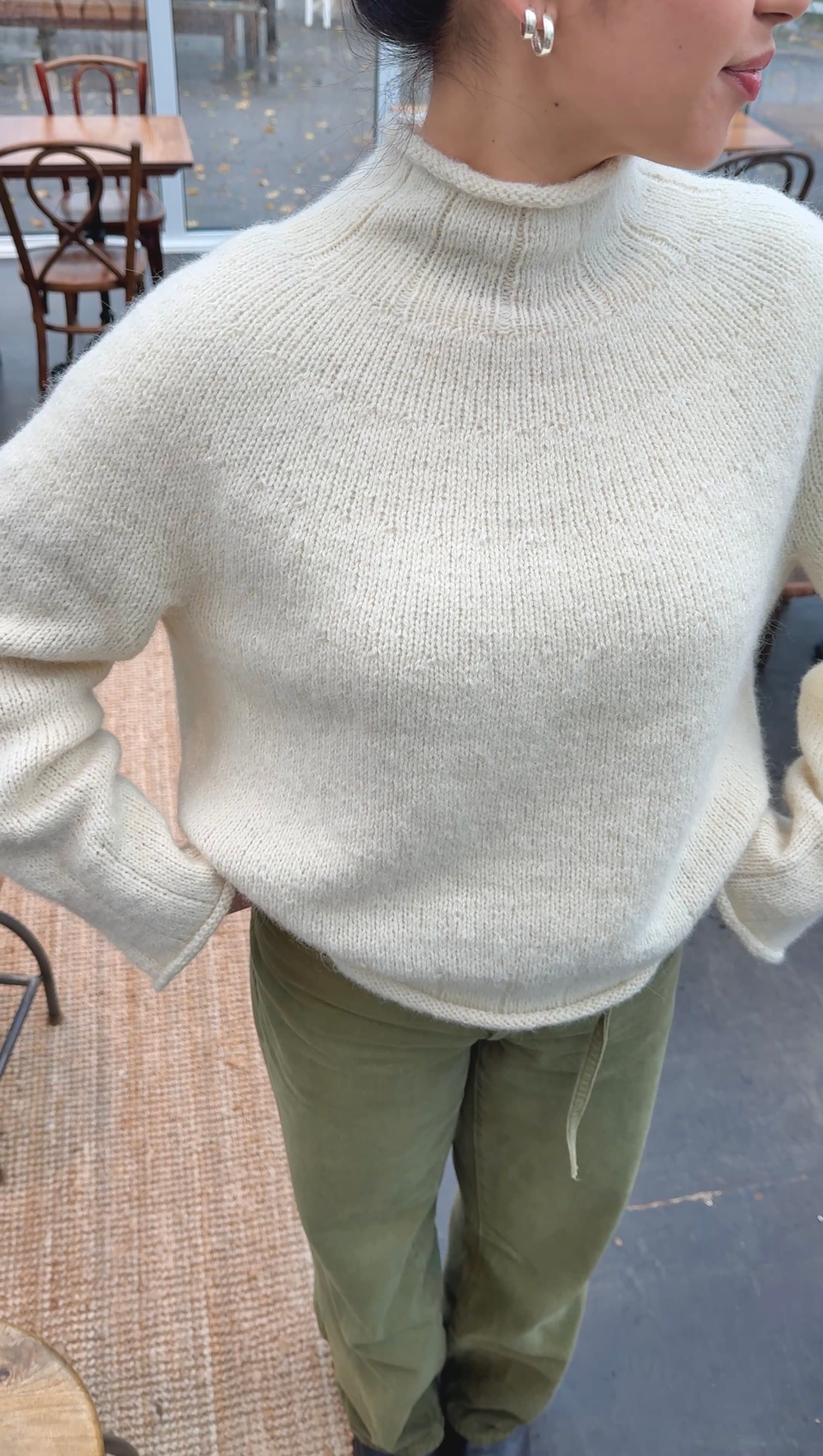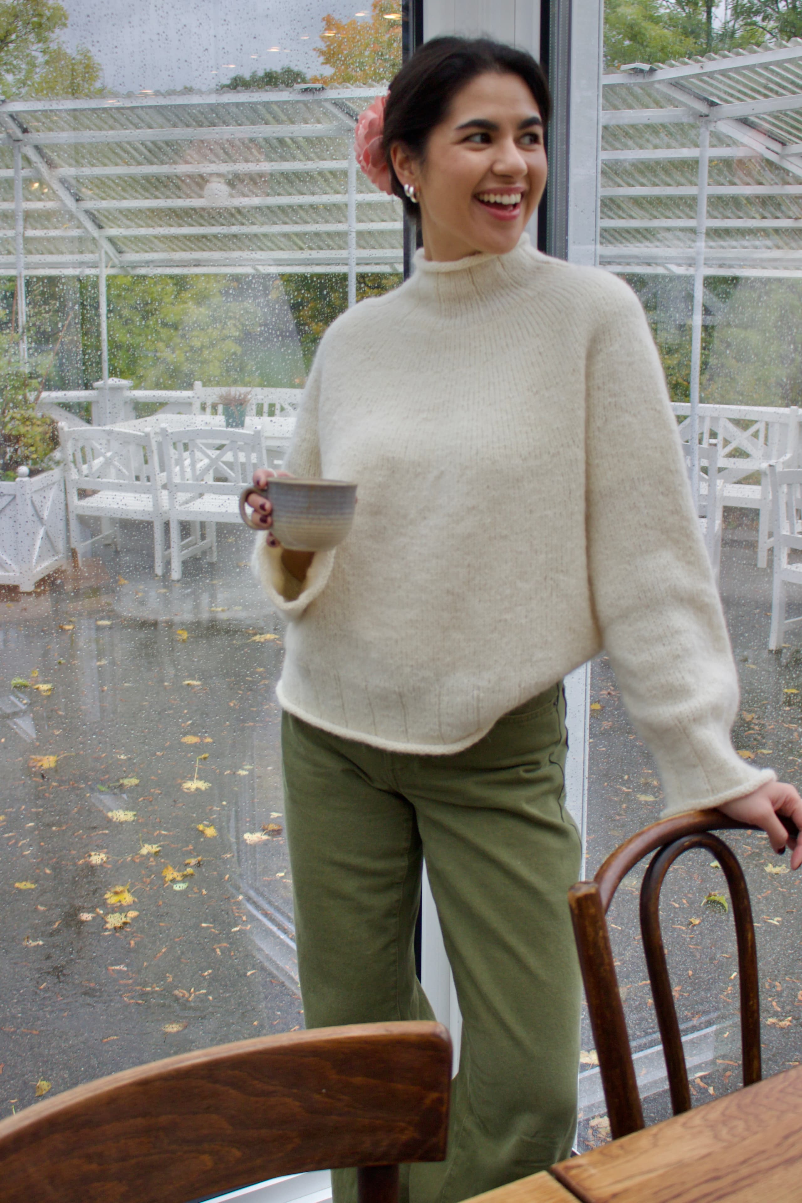 Heia rundgenser er en nybegynnervennlig genser med rundt bærestykke, som strikkes i norsk ull. Den har en rett og litt kort fasong med vide ermer og er fri for montering. Genseren strikkes ovenfra og ned, og passer perfekt som første genserprosjekt. En moderne og tidløs genser du vil ha glede av i mange år. Merk at oppskriften originalt strikkes i Fivel, Finull + Alpaca SIlk er et garnalternativ som ikke er oppført i oppskriften. Strikker du i Finull + Alpaca Silk skal det strikkes med en tråd av hver kvalitet.
