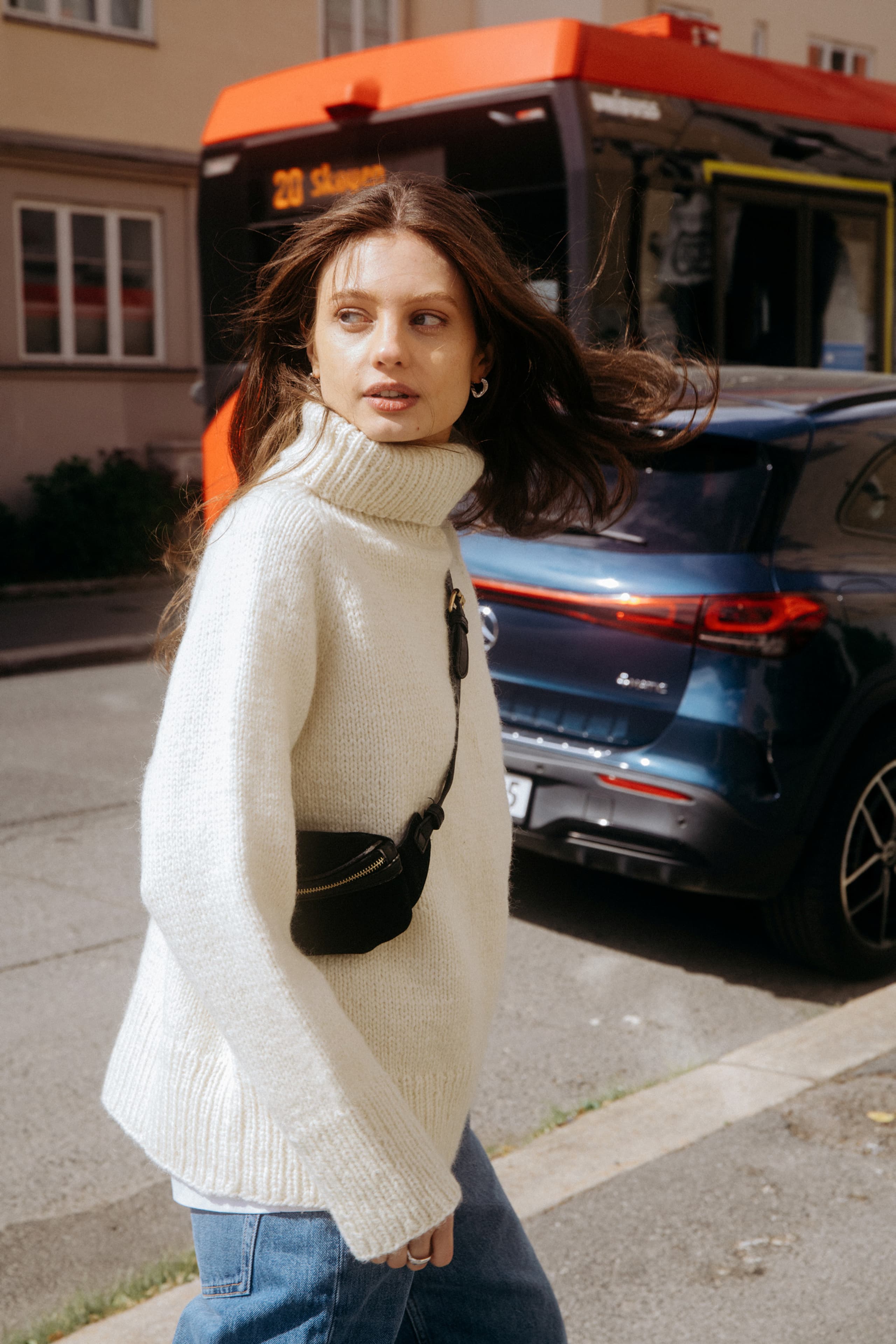 Heia raglangenser is an oversized and soft autumn sweater made from 100% Norwegian wool. It is knitted in Vams, a thick and airy yarn, making this a perfect project for beginners. A modern basic sweater with a high neckline and a fit that suits most. You can choose to fold down the collar, or let it keep you really warm on cold days.