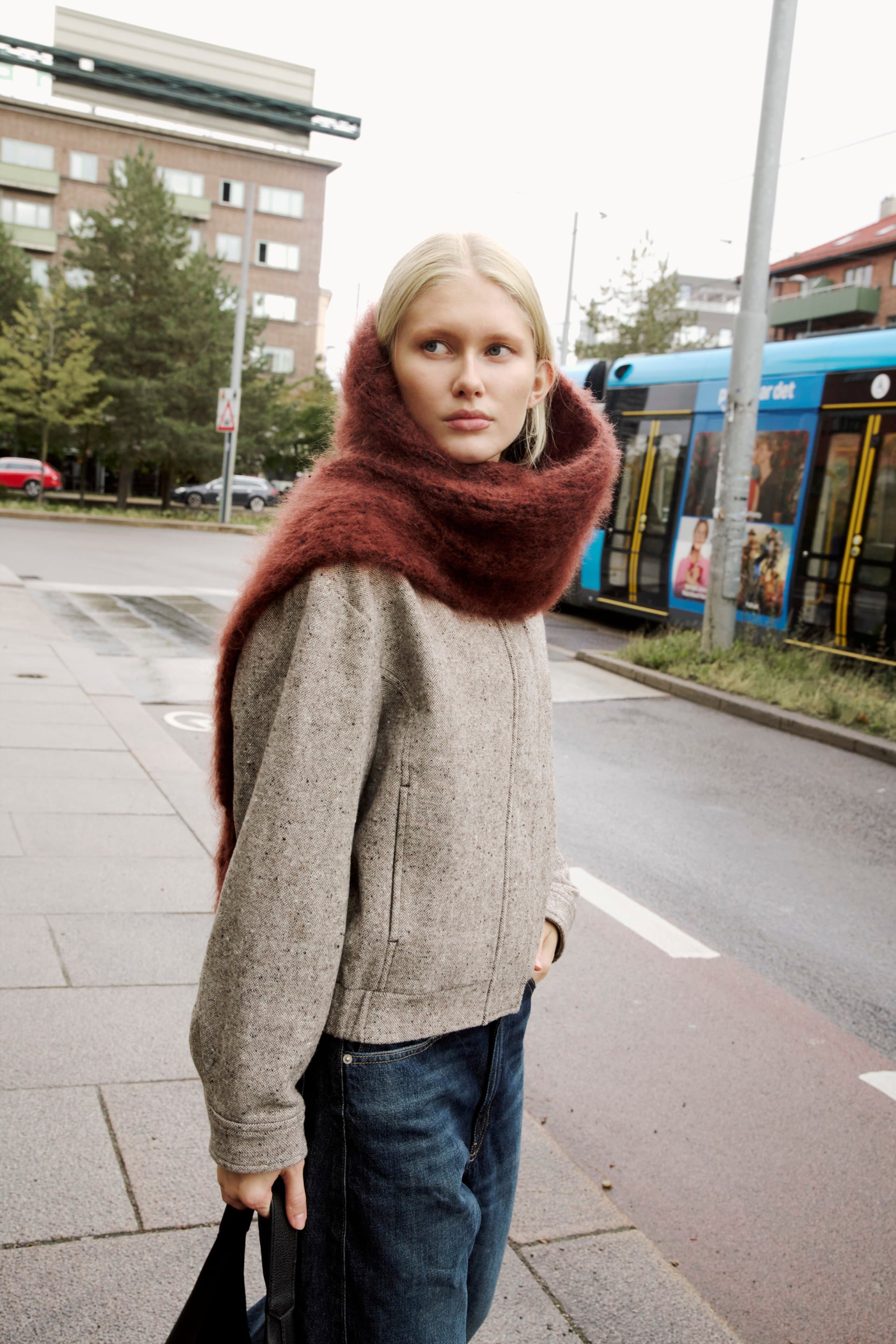 Heia mohairskjerf är en stor, mjuk och fluffig halsduk med tjocka fransar. Den är stickad med en tråd Tjukk mohair och en tråd Lamull tillsammans. Halsduken stickas fram och tillbaka i resårstickning. Lamullen gör halsduken stabil ochh den mjuka mohairen borstas upp så att halduken blir som ett fluffigt moln! Den avslutas med att man tvinnar och syr fast fransar i halsdukens ändar.