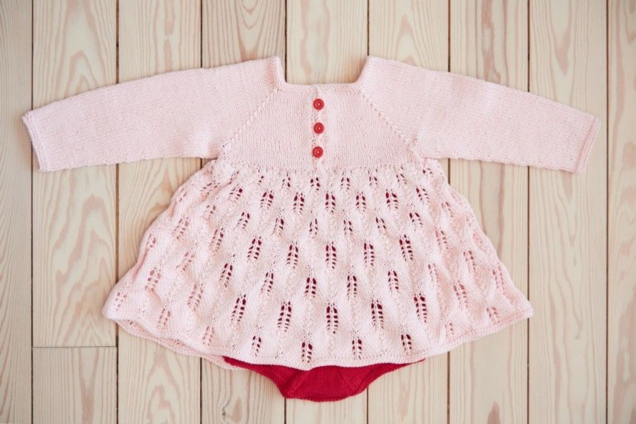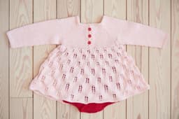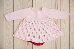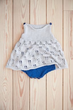 Denne søte kjolen kan strikkes uren ermer, eller med ermer og raglanfelling. Først strikkes bodyen, så strikker man på skjørtet til slutt. Vi brukt bomullsgarnet Pandora. Om man vil strikke i alpakka eller ull, kan man også bruke Inca eller Baby Panda.