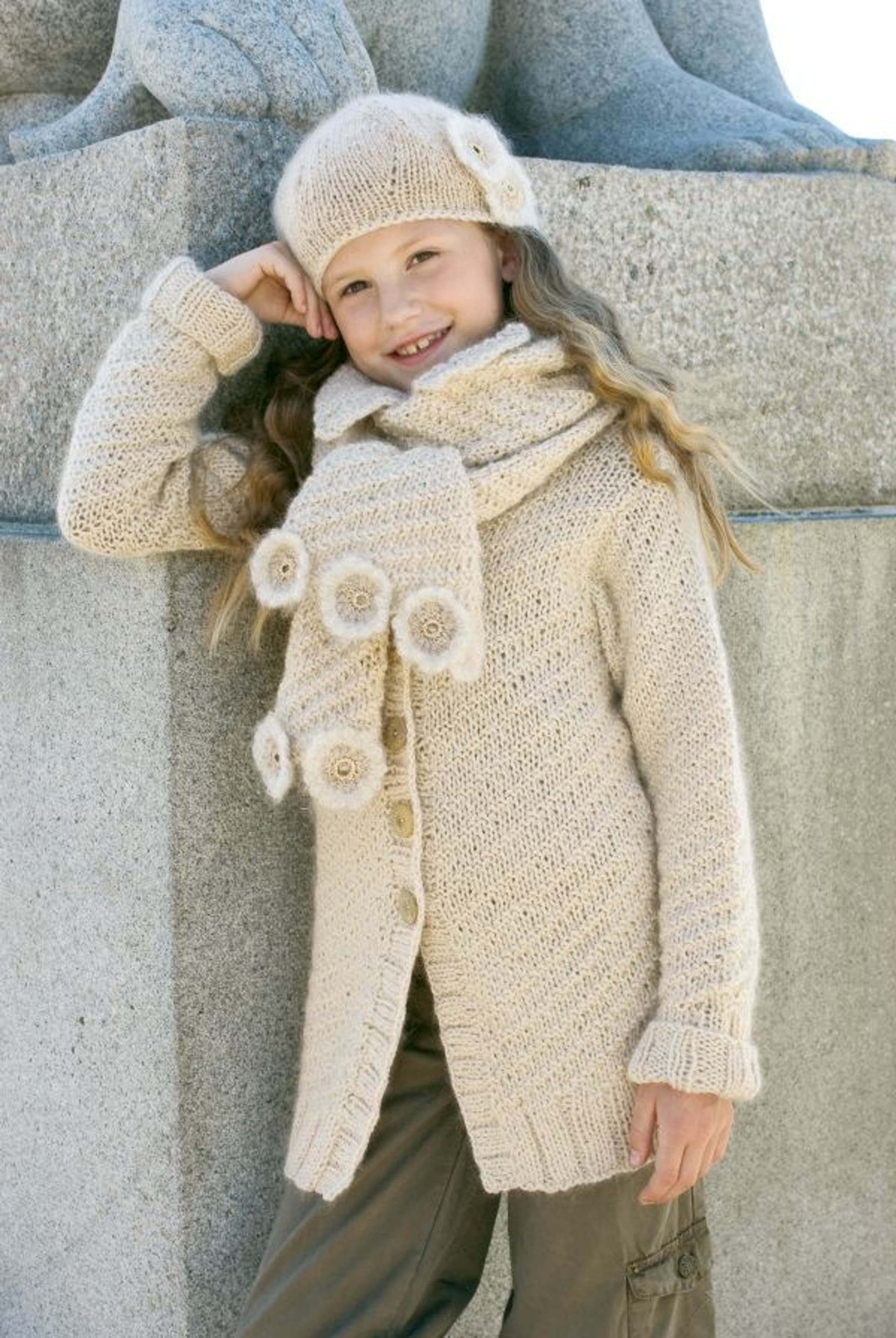 Rettstrikkede jakker, gensere, vest, luer og skjerf.