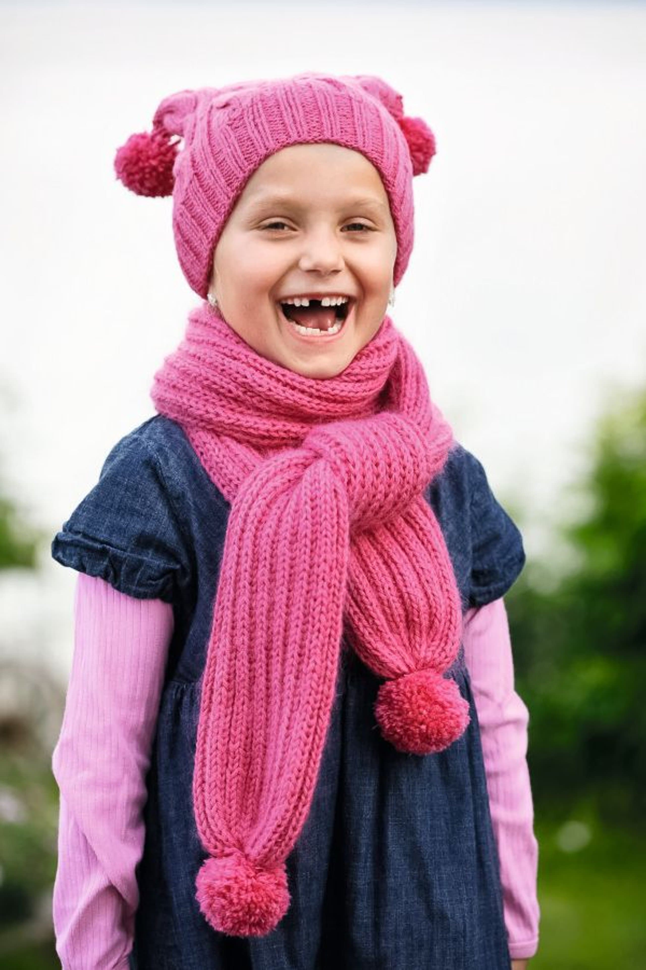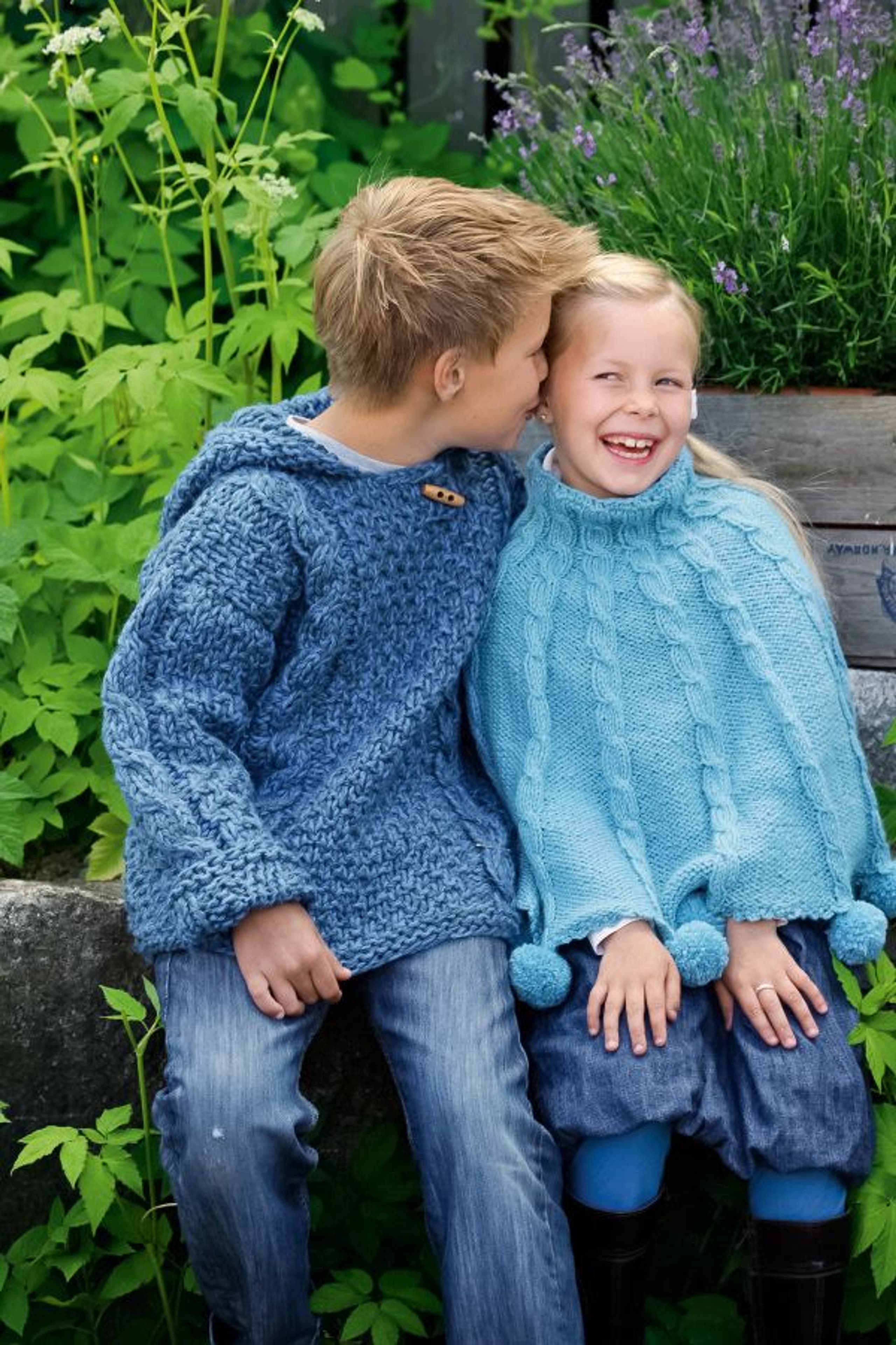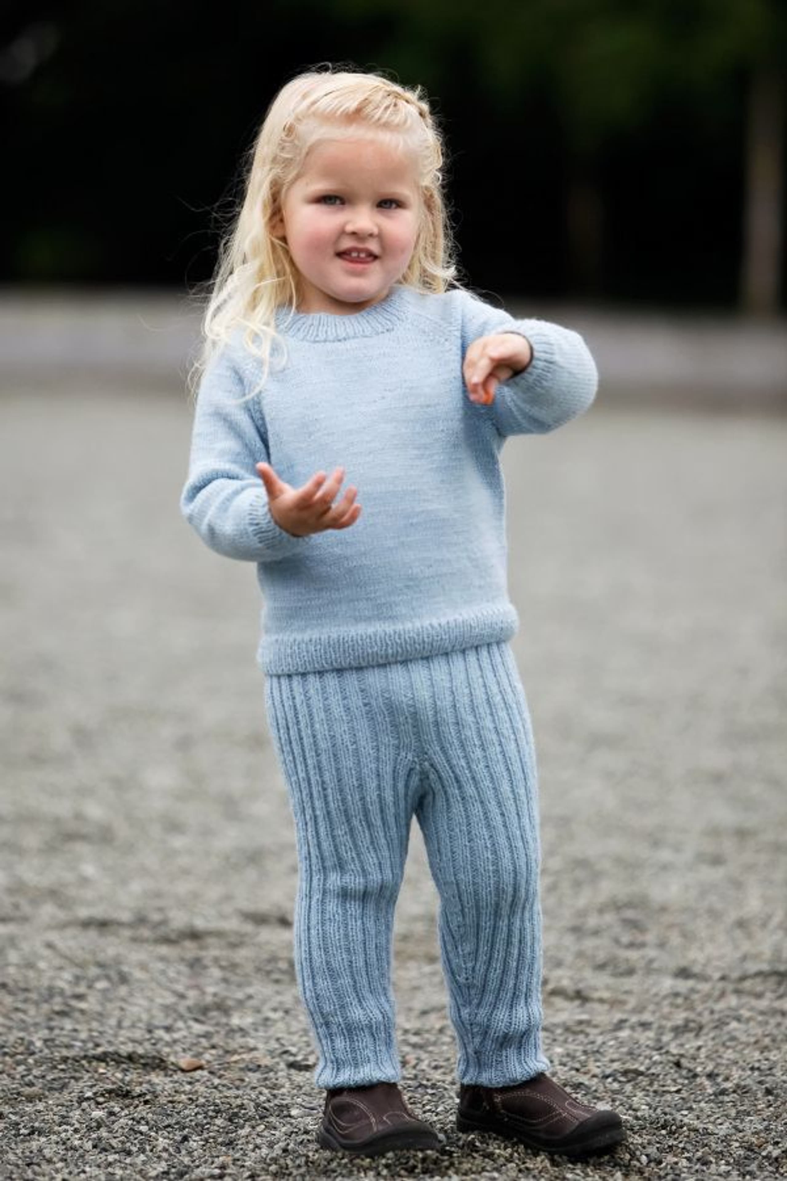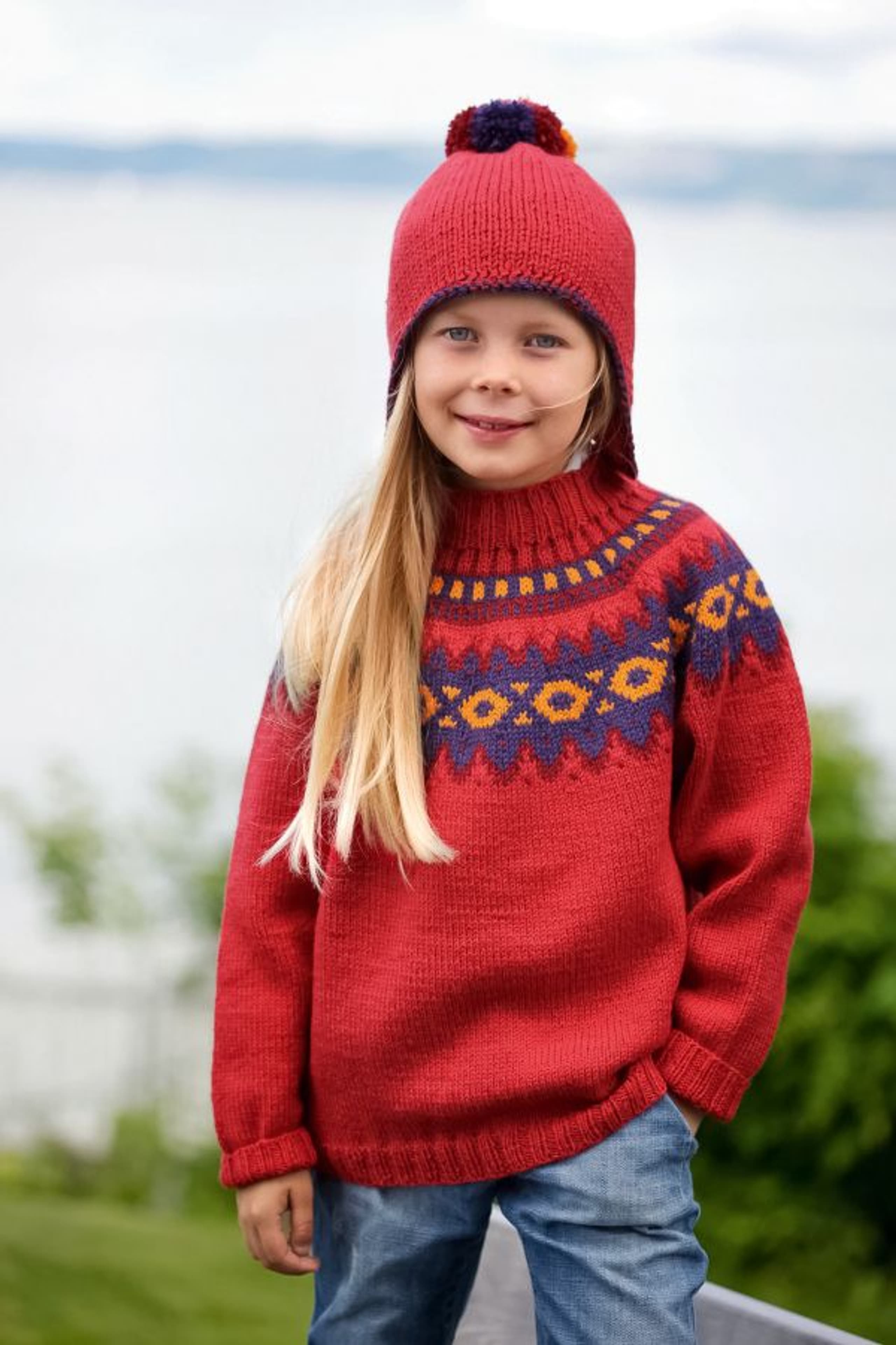 Lue med fletter og skjerf i vrbordstrikk