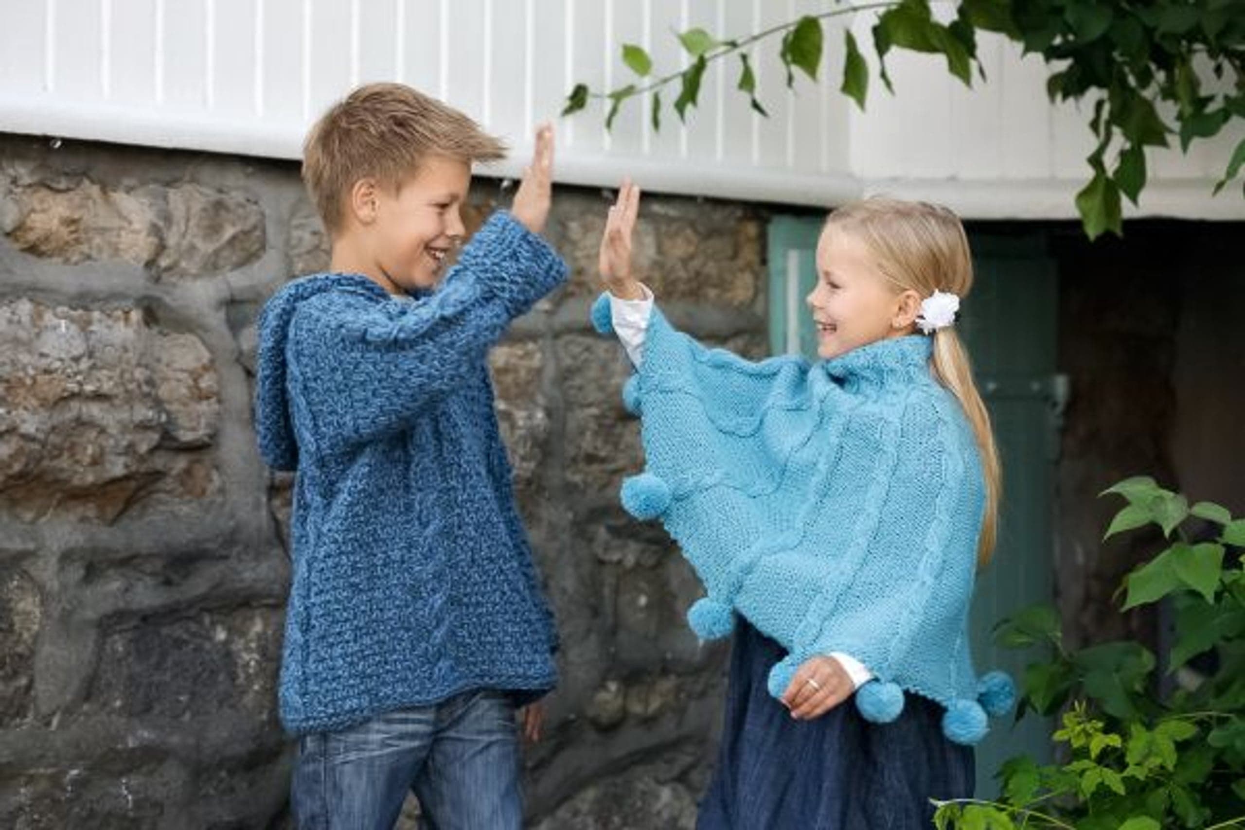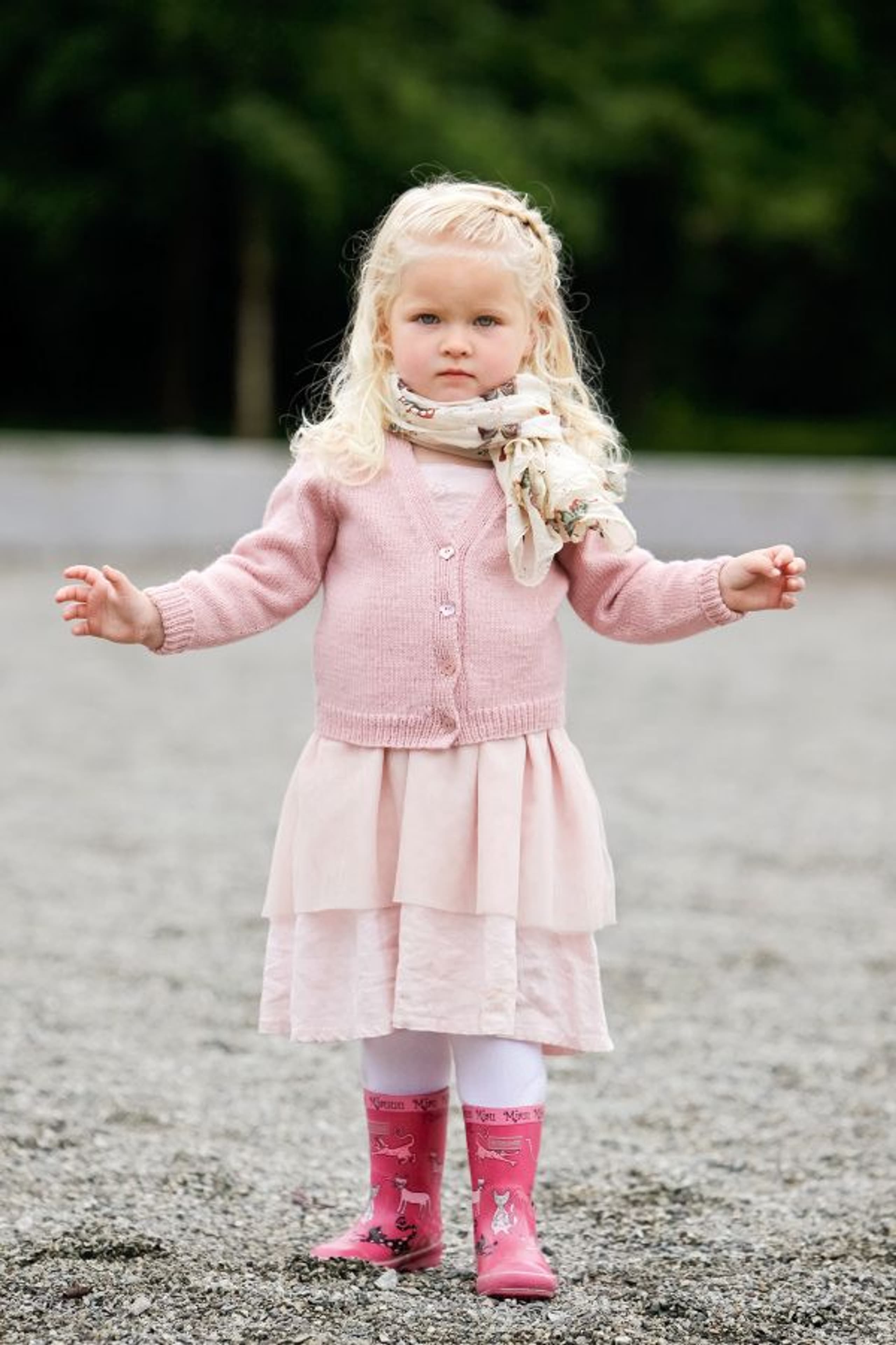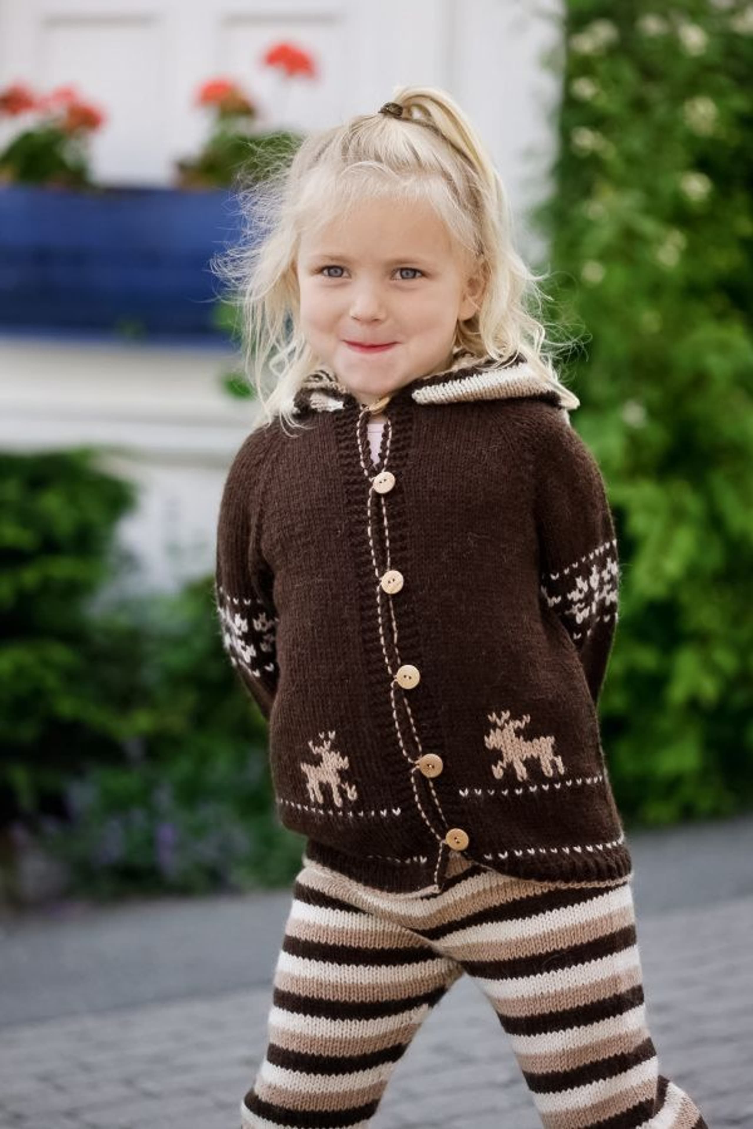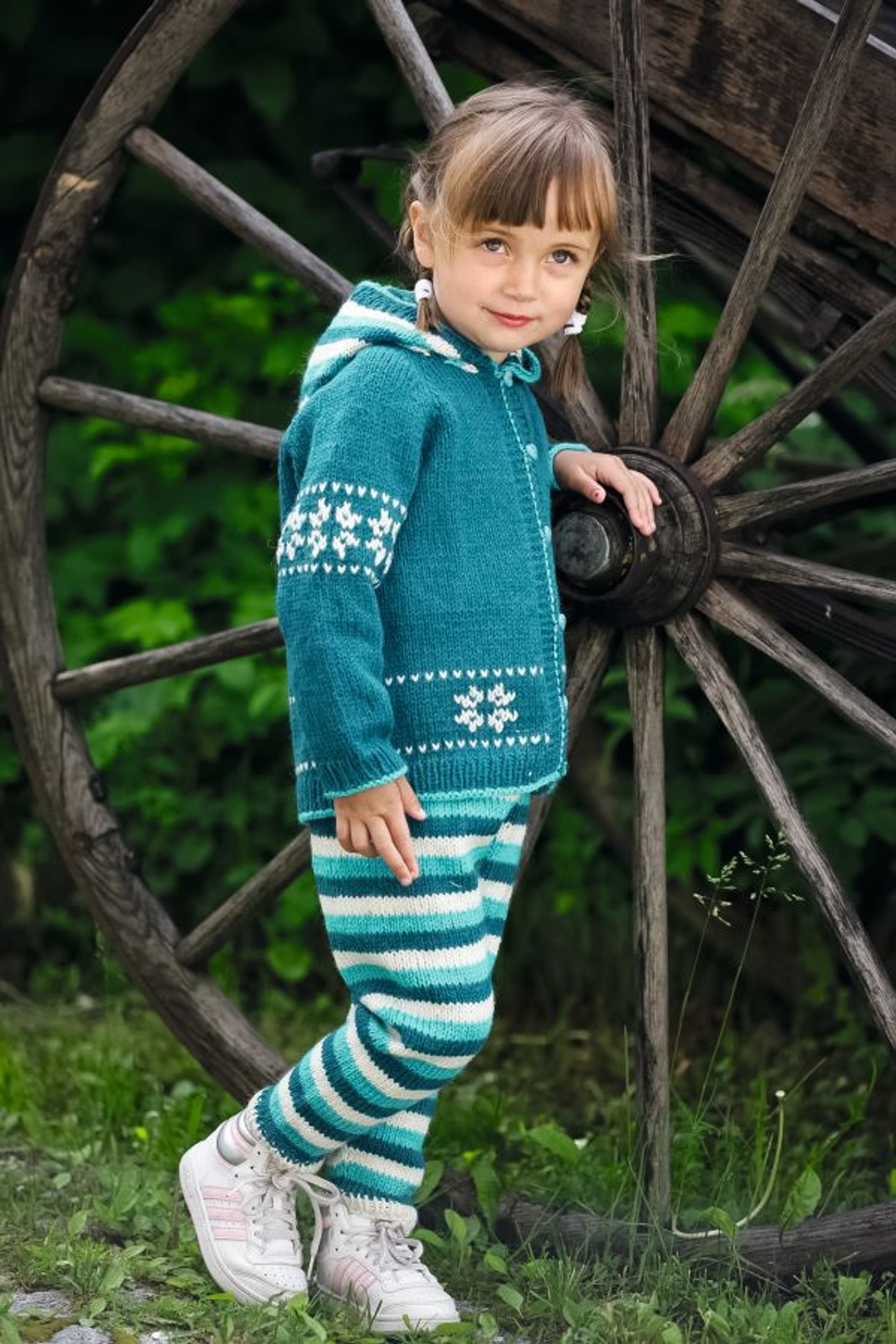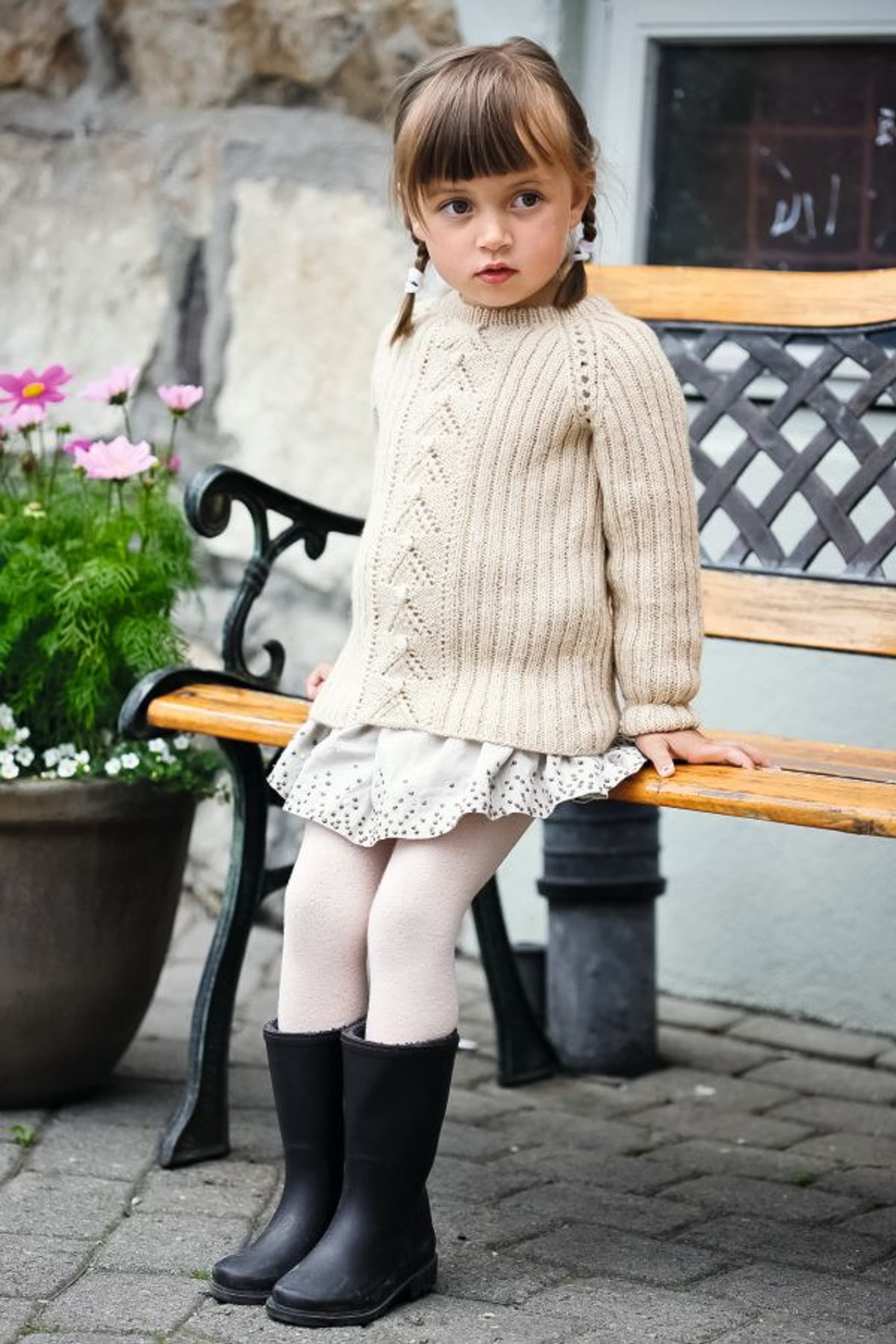 Lue med fletter og skjerf i vrbordstrikk