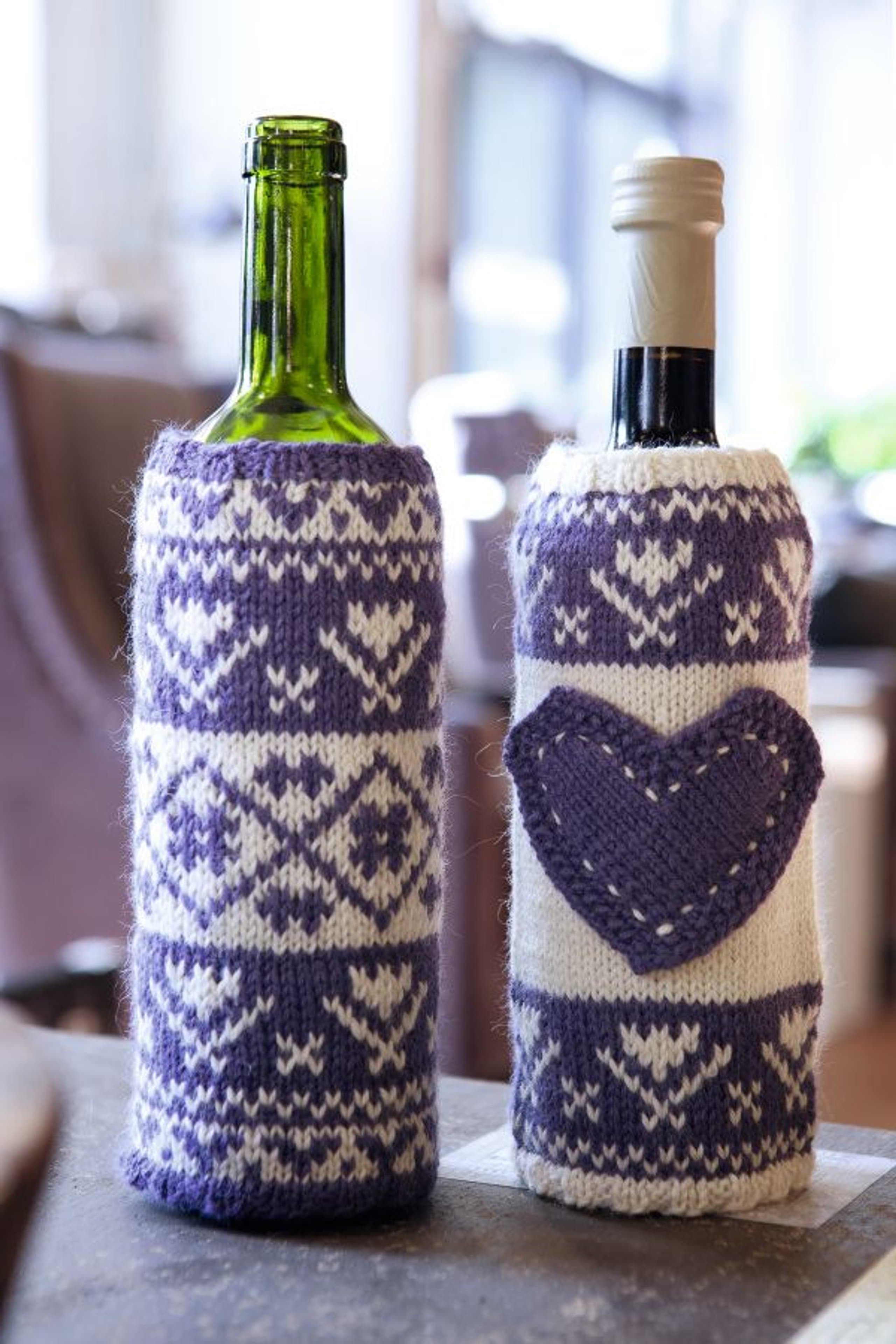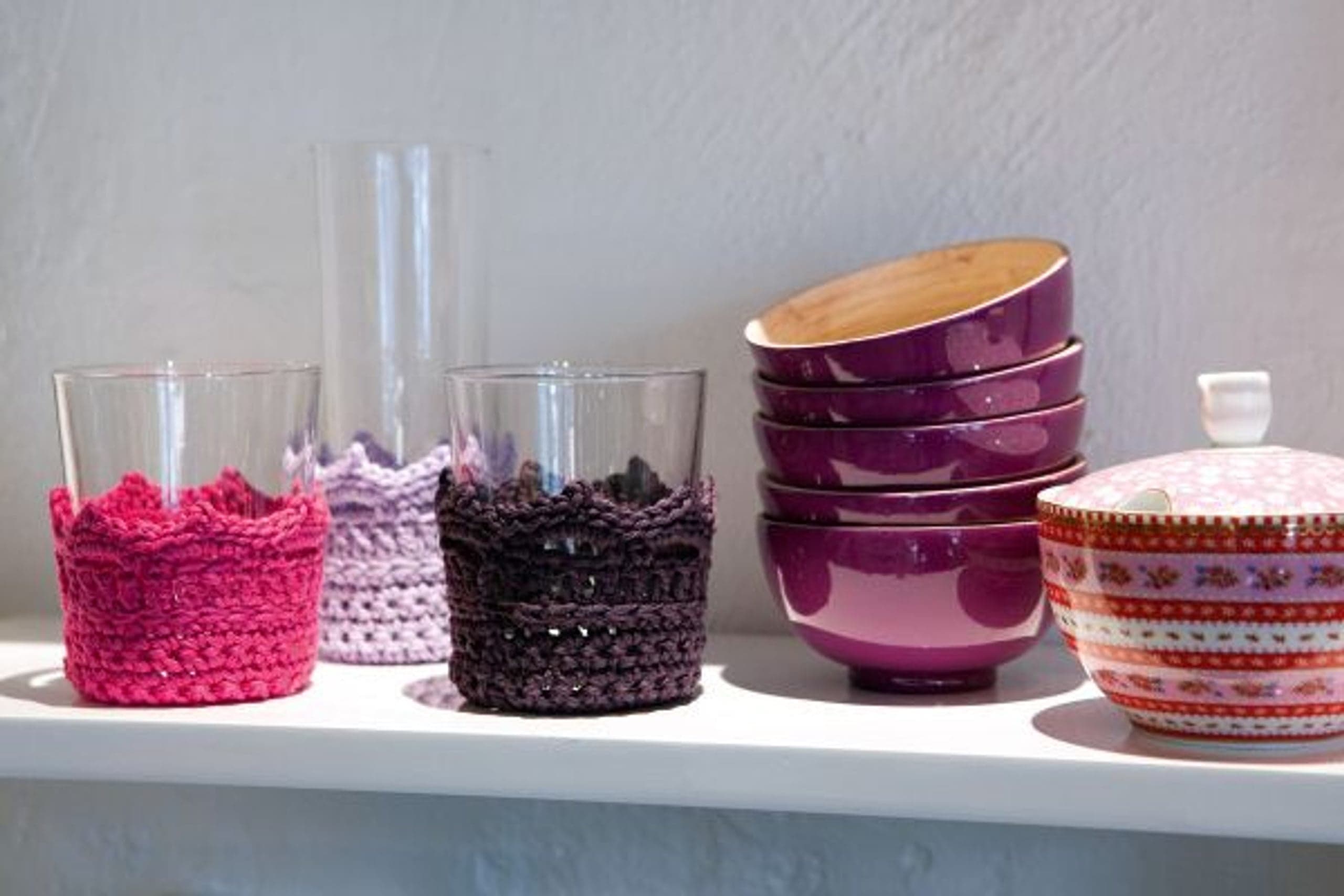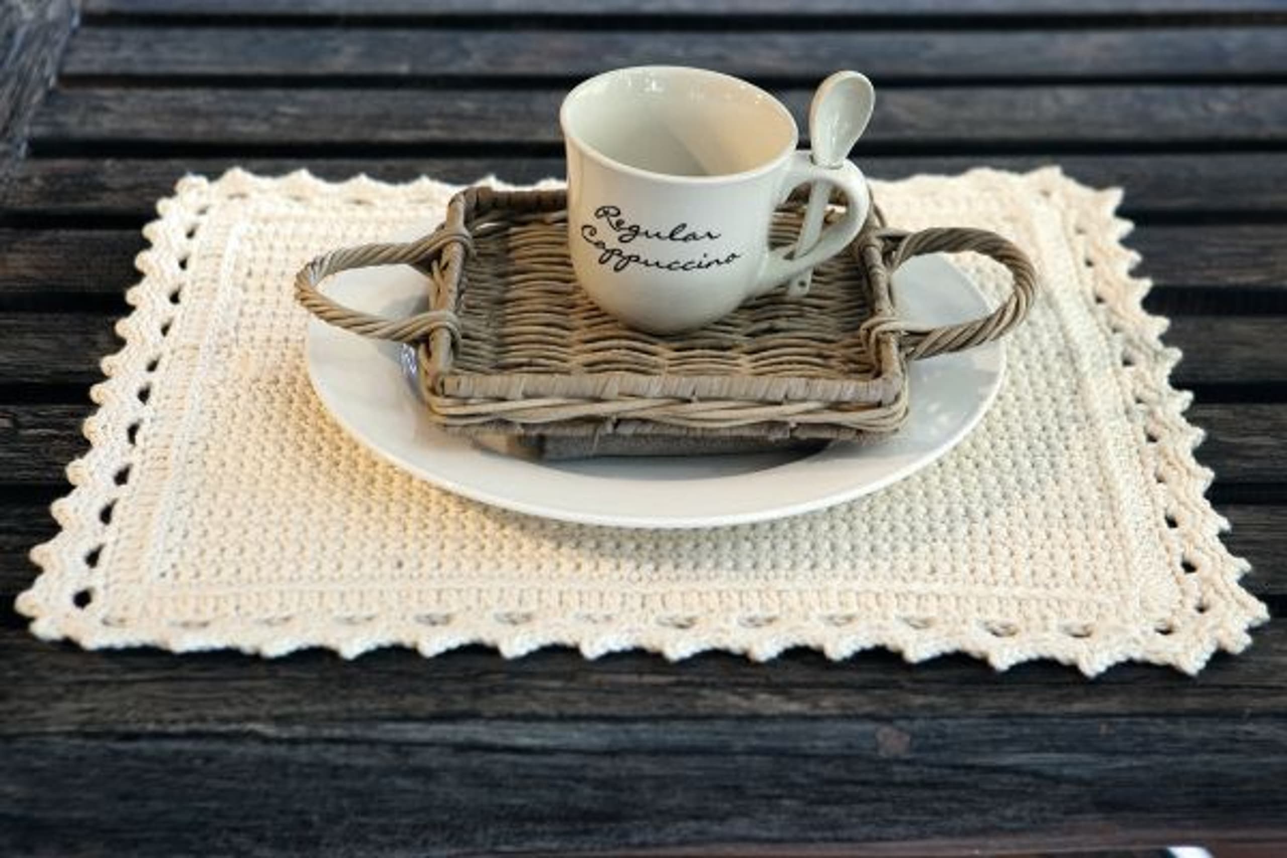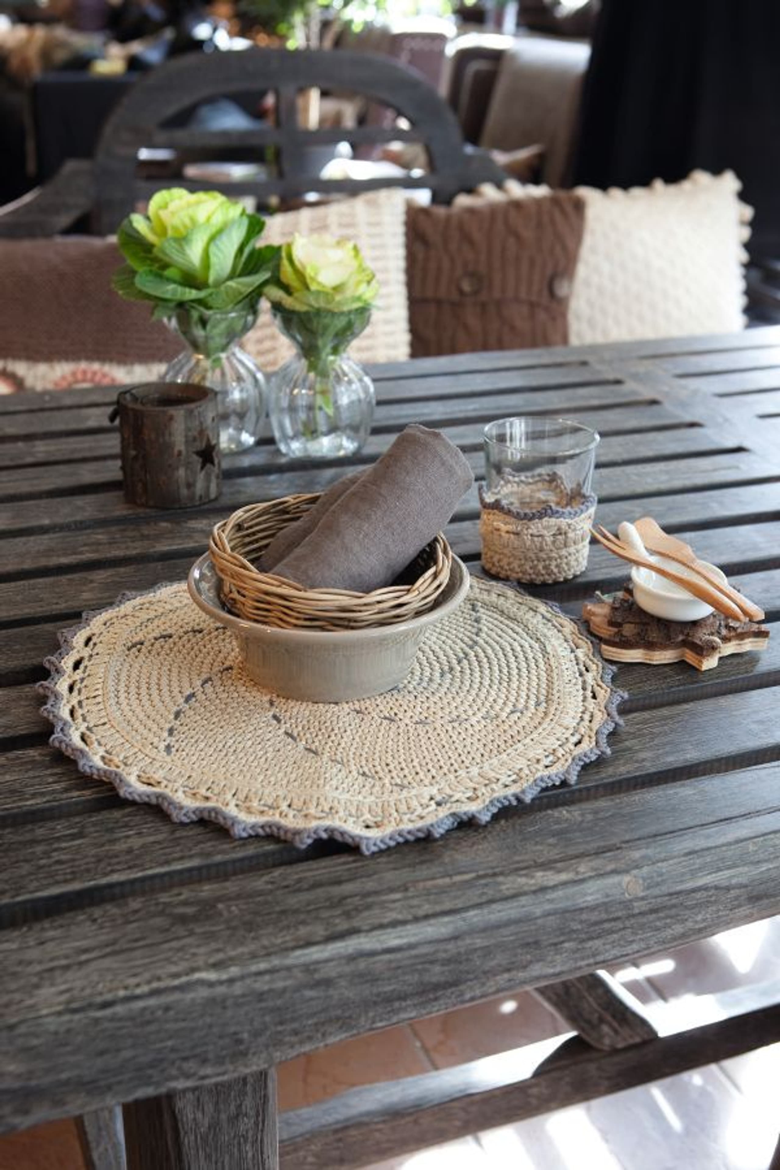 Heklet spisebrikke, mansjett til serviett/bestikk og flasketrekk