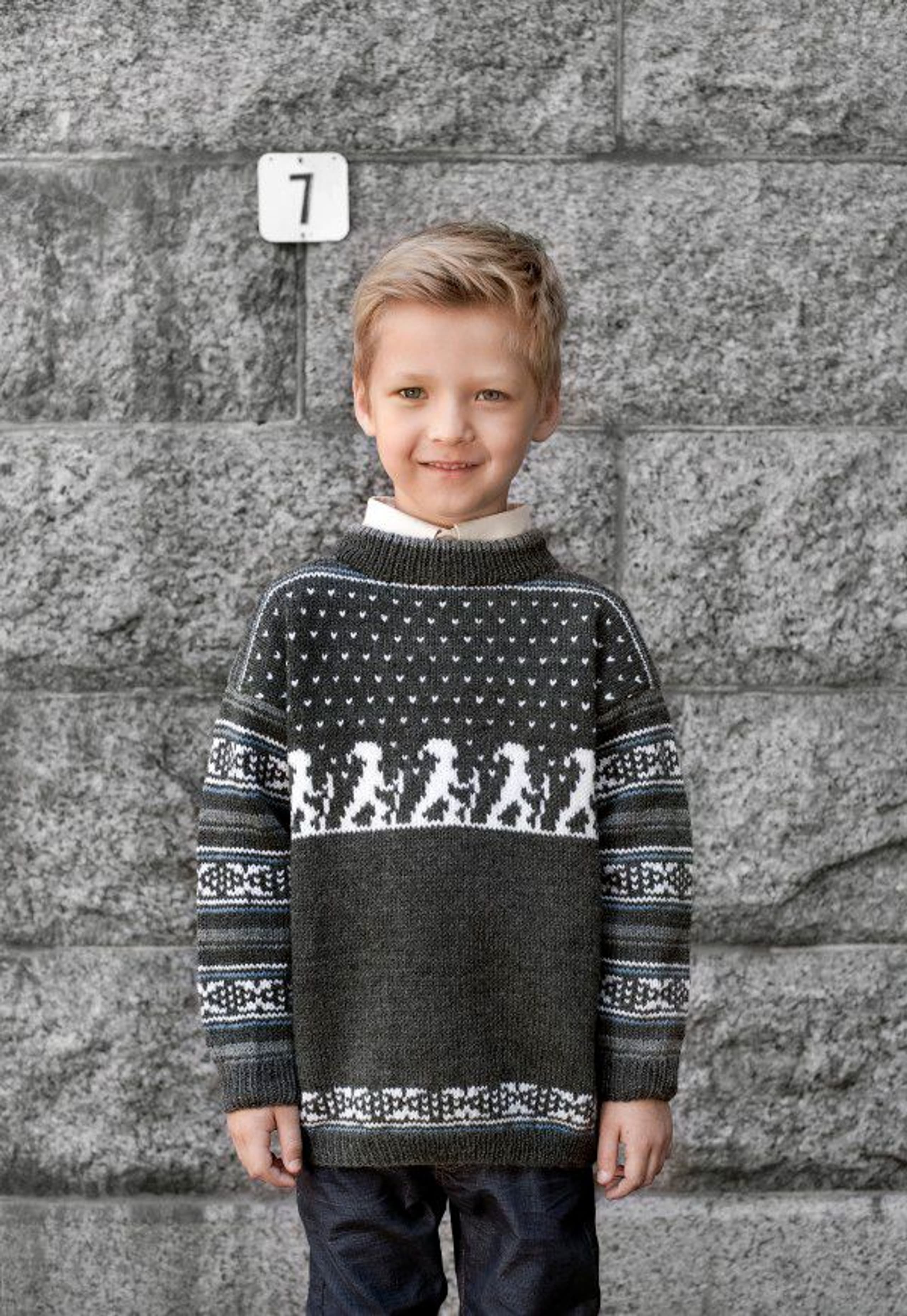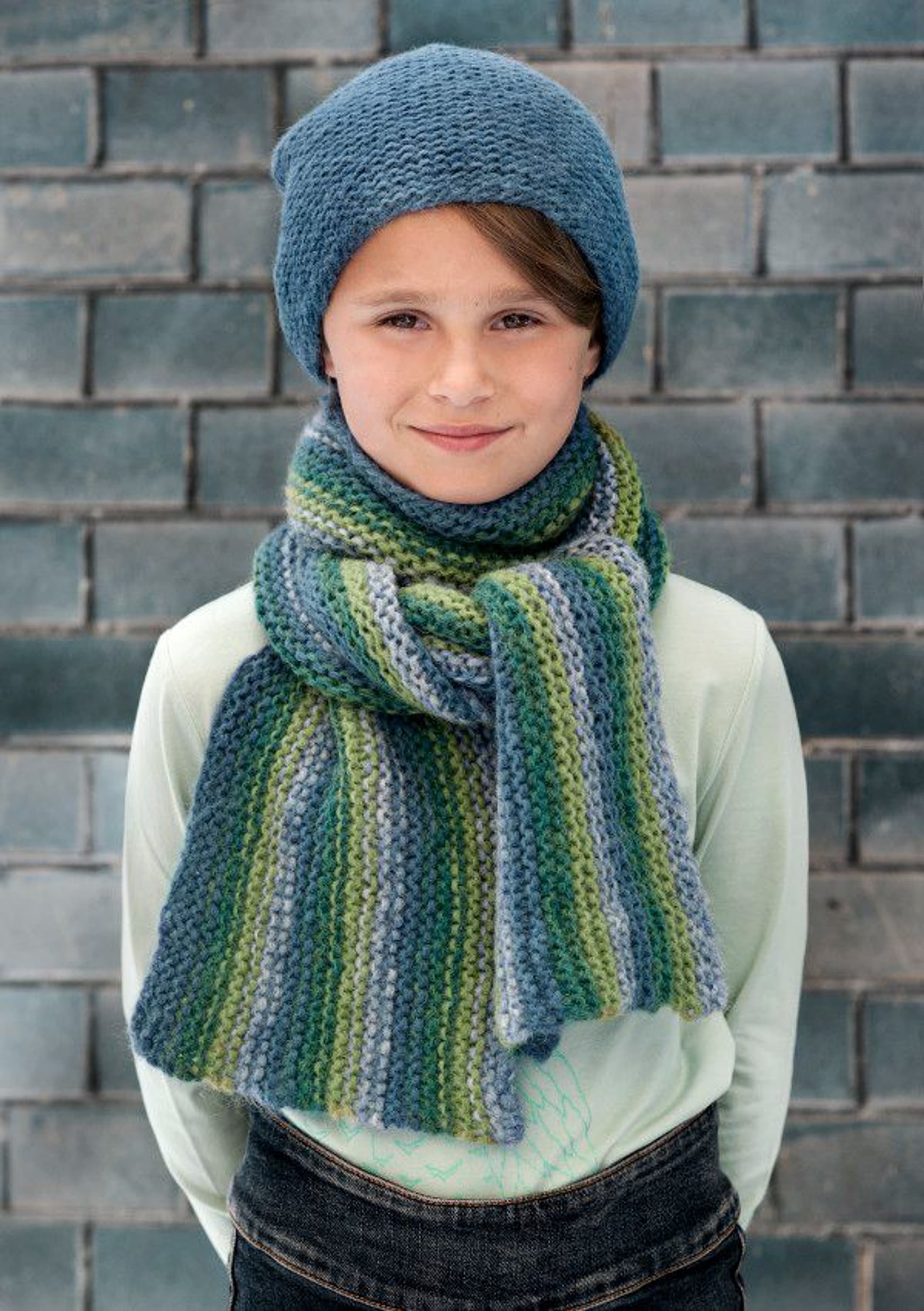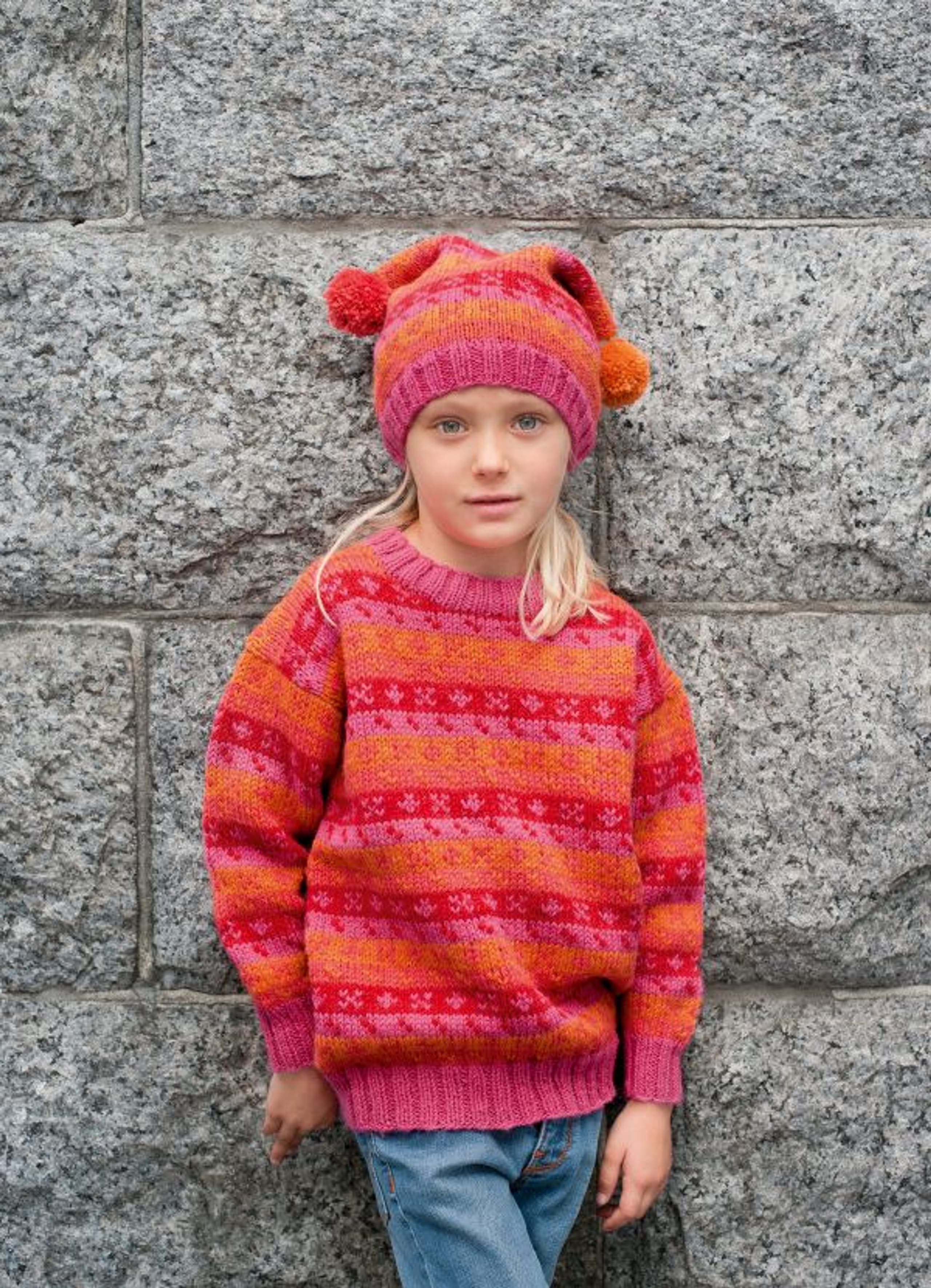 Genser med border, skjerf og luer