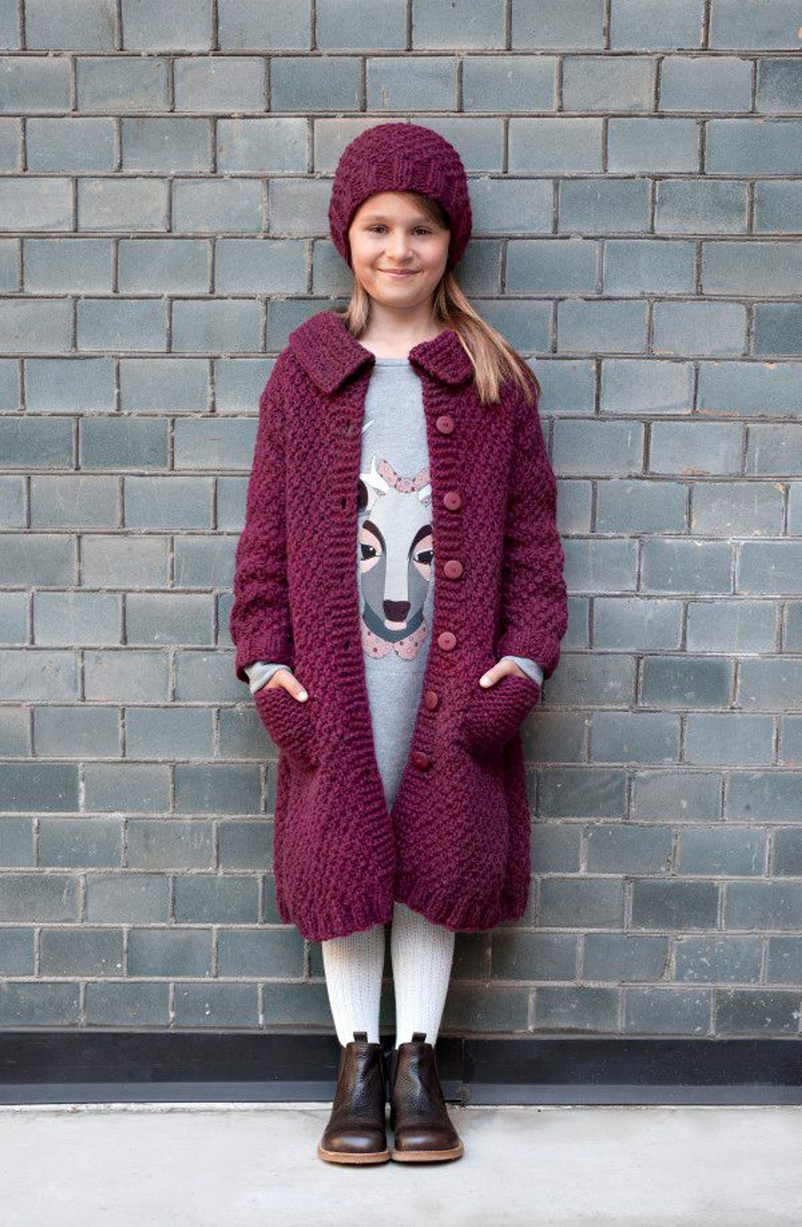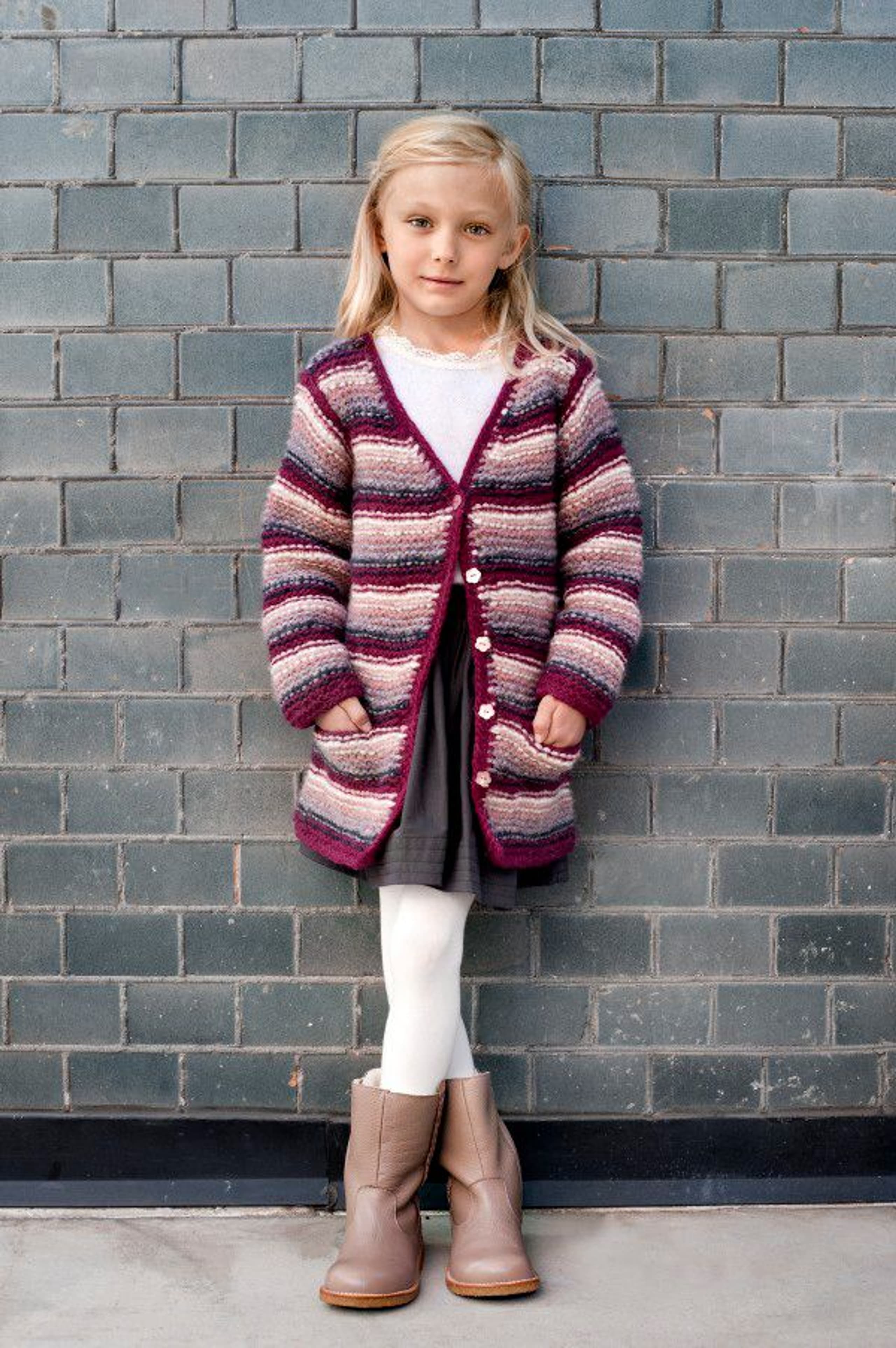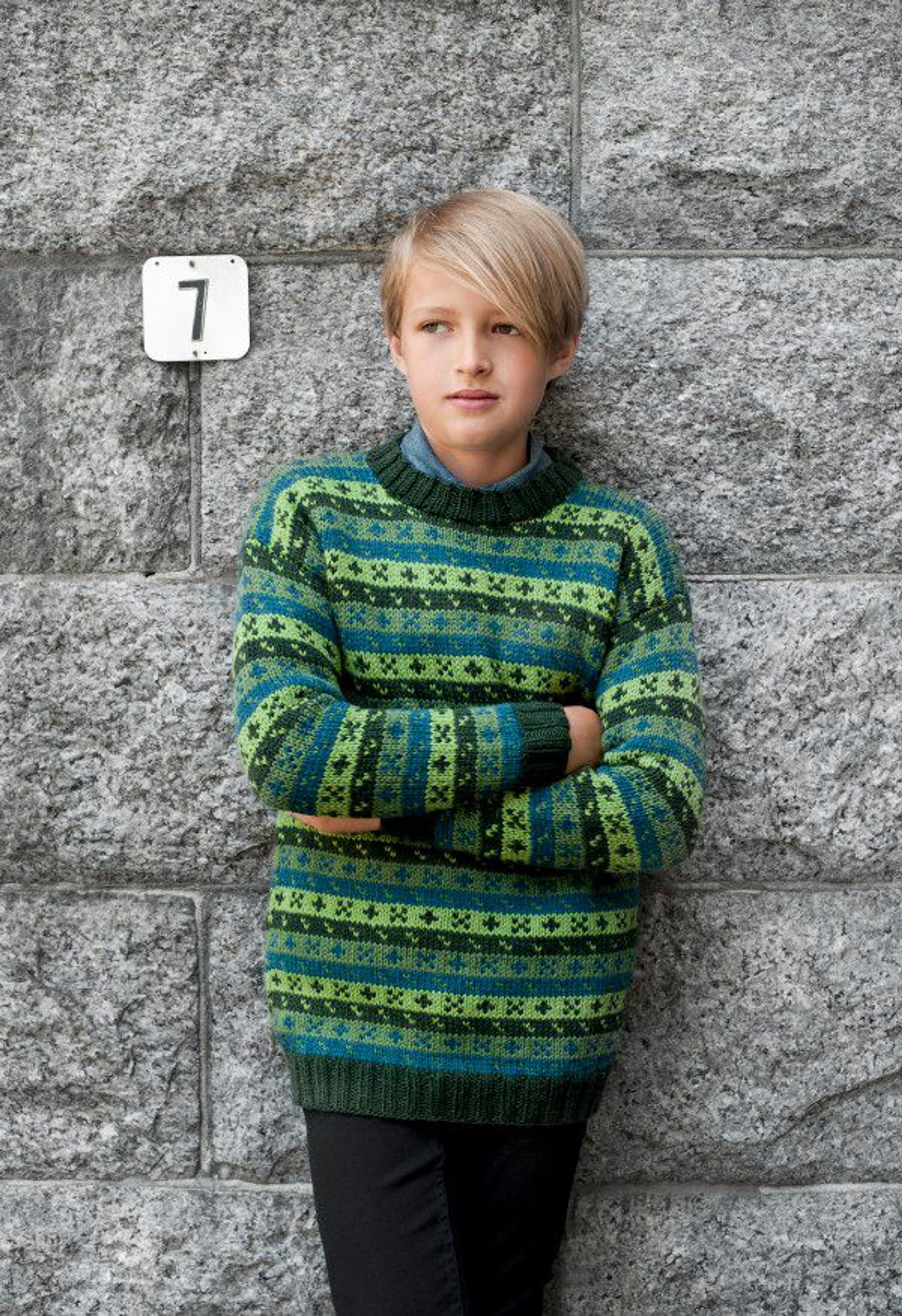 Genser med border, skjerf og luer
