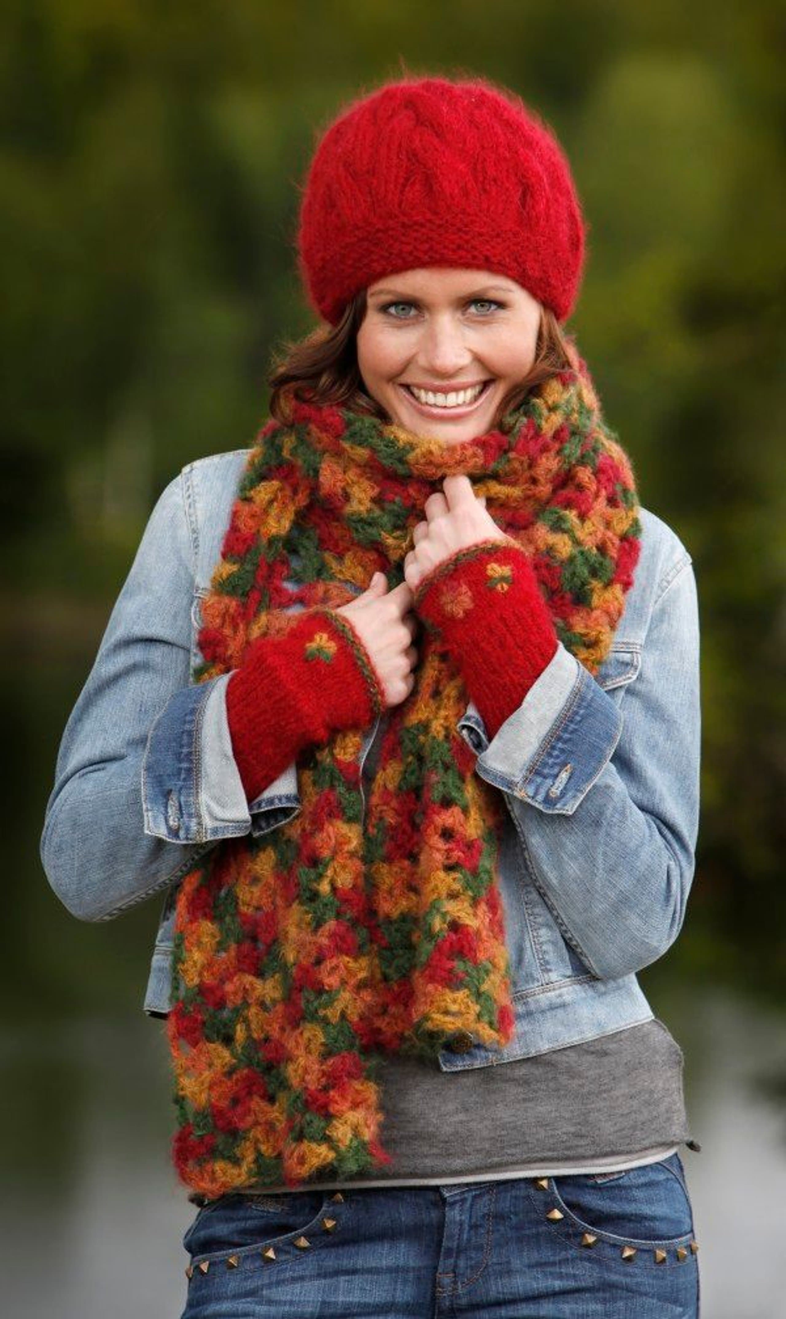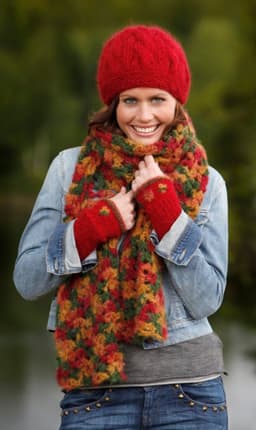 Heklet skjerf, strikket lue og pulsvanter