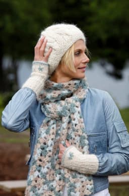 Heklet skjerf, strikket lue og pulsvarmere. Skjerf: 150 g av fg Iris. Lue og pulsvarmere: 150 g av Iris