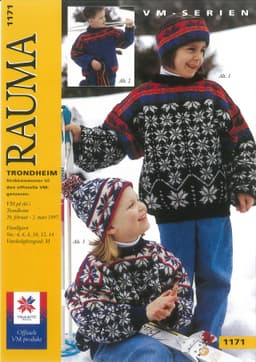 Strikkemønster til den offesielle VM-genseren i Trondheim 1997. Oppskrift på genser, lue og pannebånd.